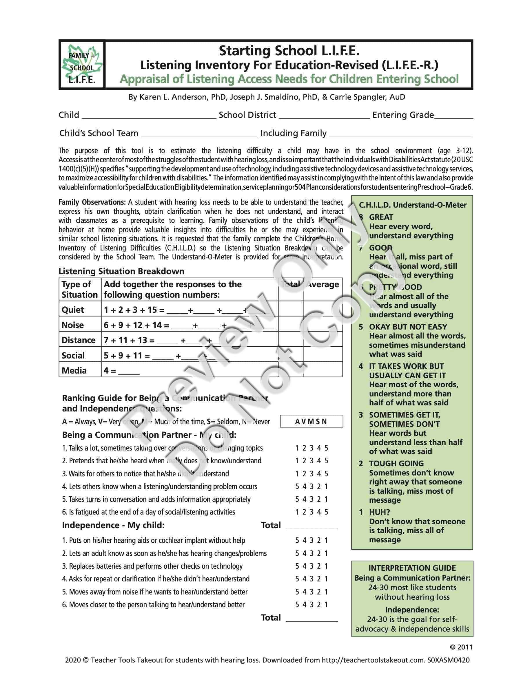 The Starting School LIFE - Appraisal of Listening Access Needs for Children Entering School checklist is designed to be completed by families of children transitioning to school at age 3-5 or moving in to a new school throughout elementary. Families complete the CHILD checklist (S0XASM0063) and other portions of the Starting School LIFE to provide the school with information about listening challenges to assist in planning for access needs in school. Fillable version available at P01ASM0595.