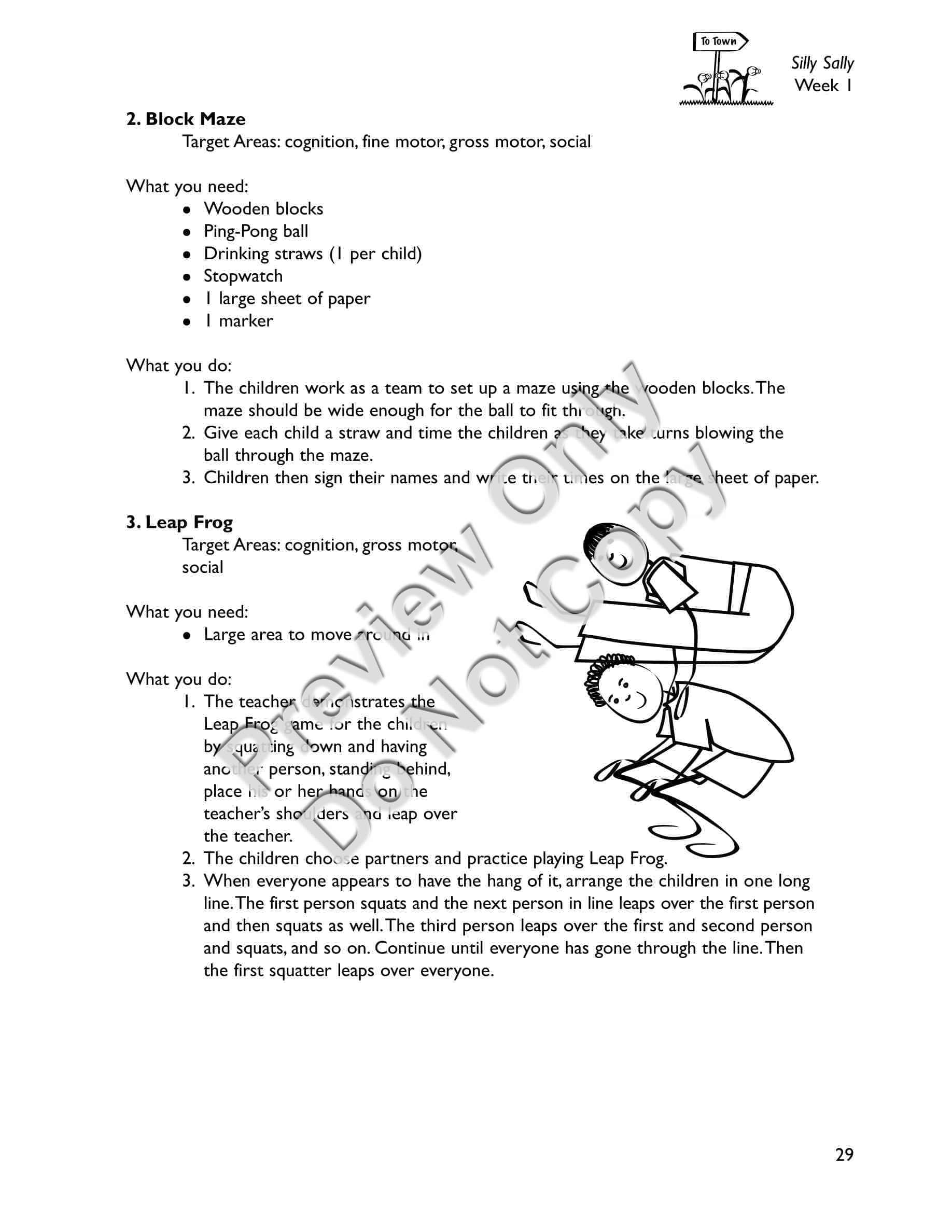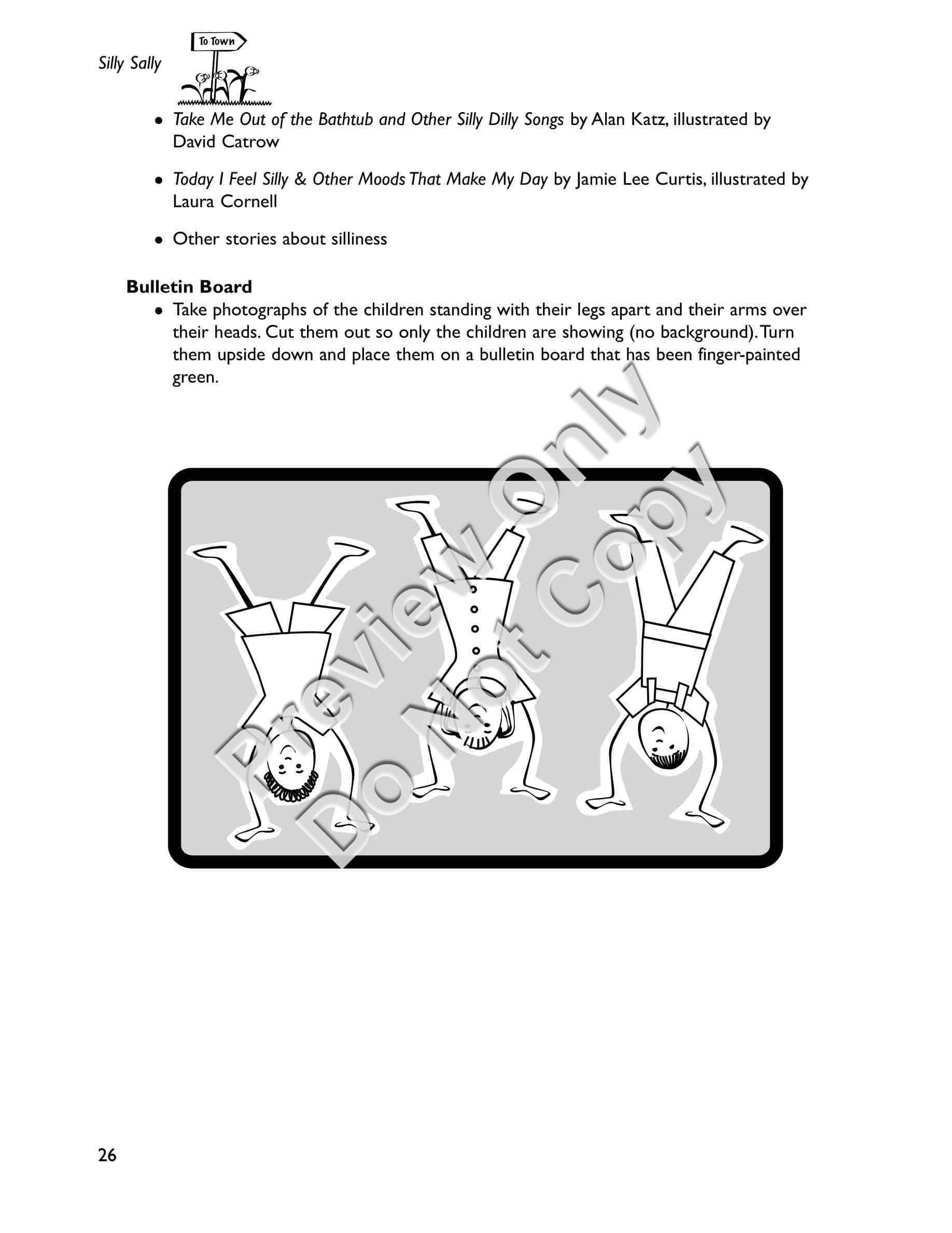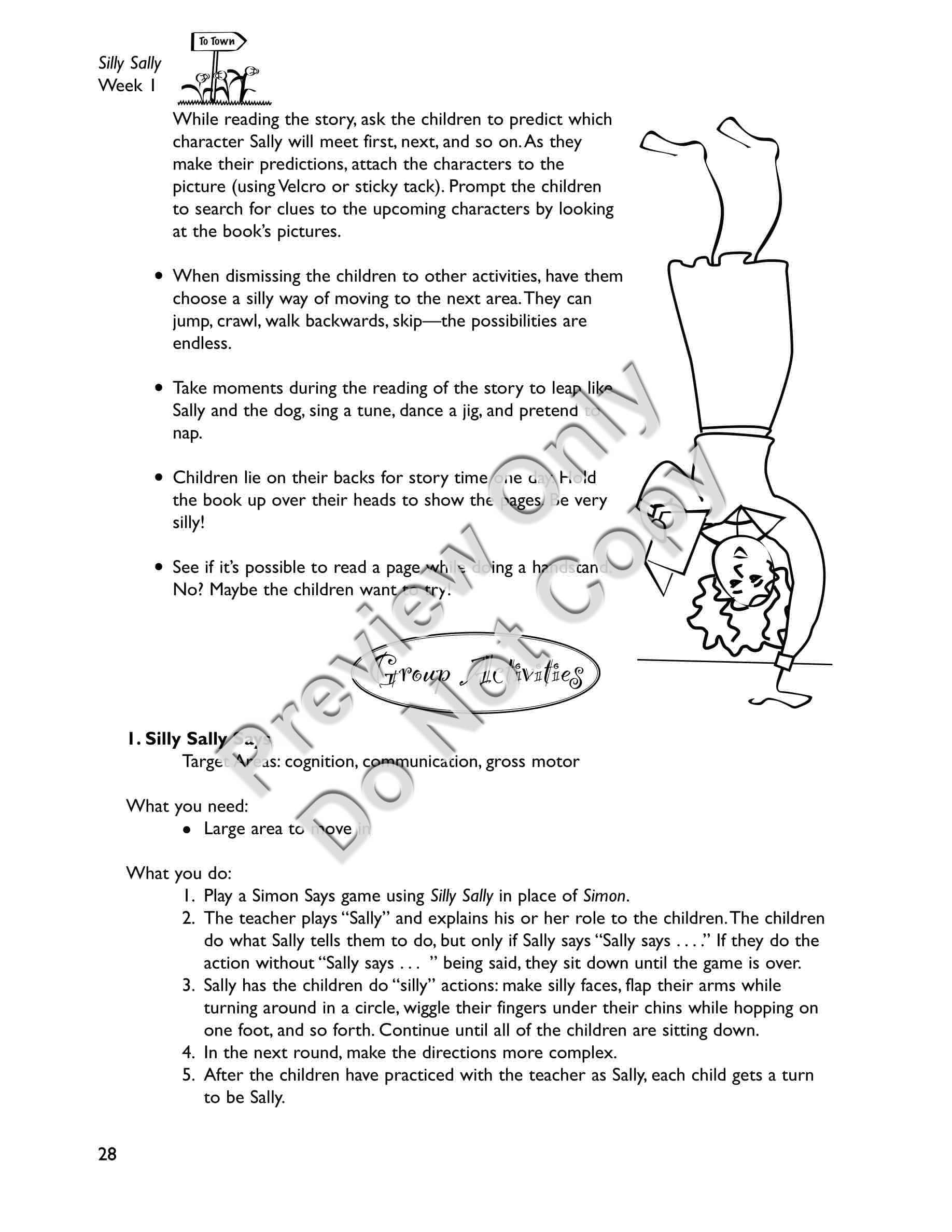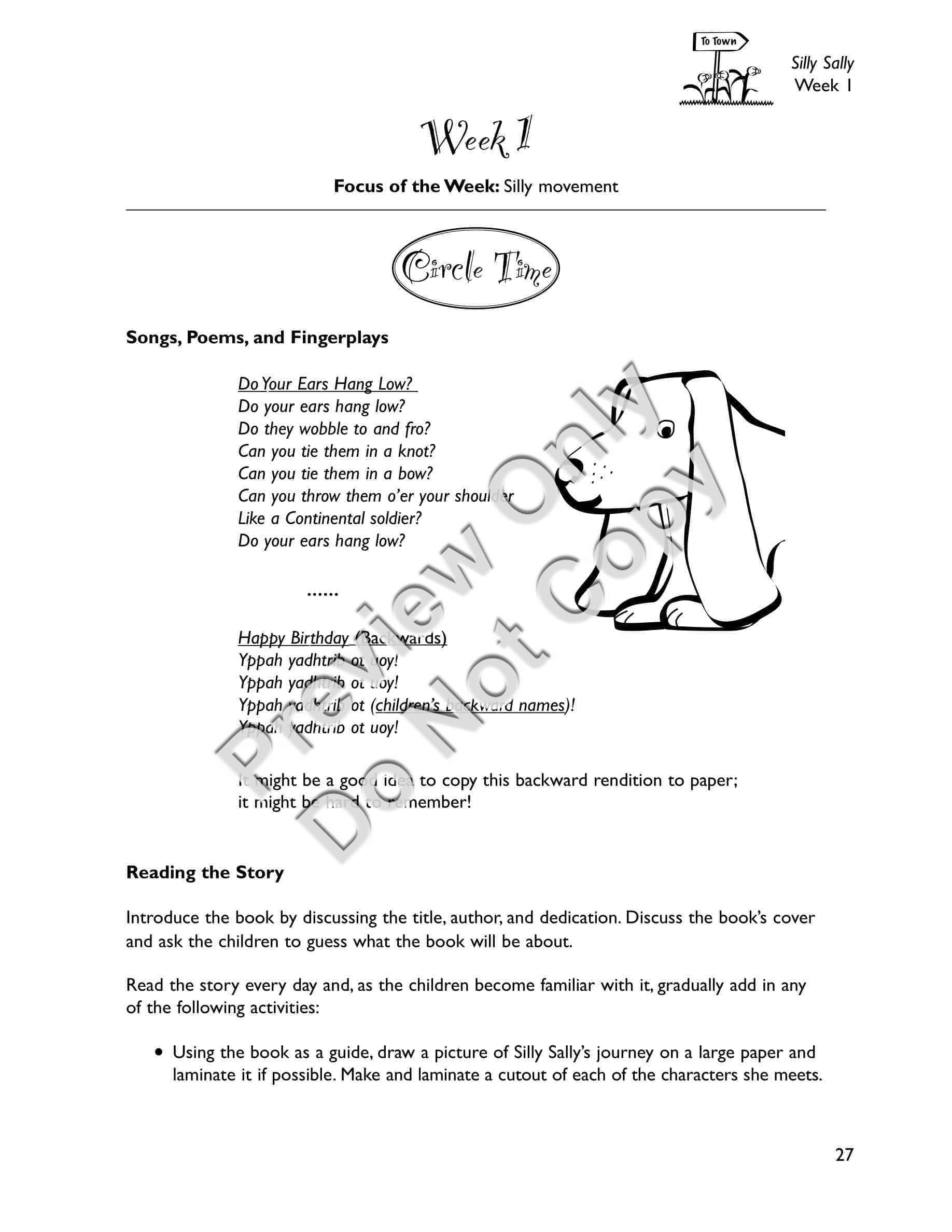 Silly Sally - Early Childhood / Preschool teaching materials for the book includes a) a synopsis of the storybook b) a letter to send home to families explaining the storybook unit and activities they can do at home c) suggestions for setting up your classroom to revolve around the story (dramatic play area, sensory area, art area, science area, book area, and bulletin board) d) activities separated into two weeks, each week including: a distinctive thematic, e) focus of the Week; Circle Time activities including songs, poems, fingerplays, and story-reading ideas; and six detailed Group Activities with designated target areas, f) snacks related to the story, g) a Pretest and Posttest