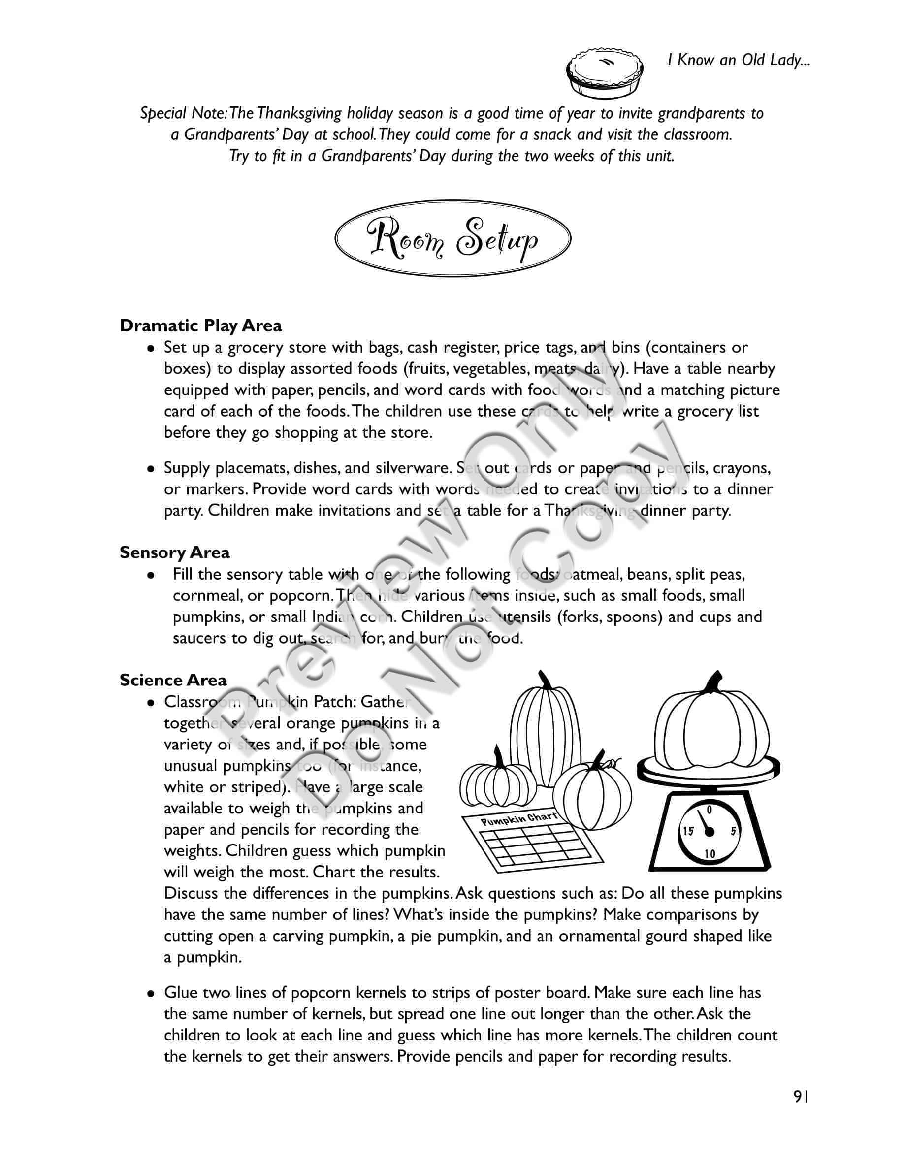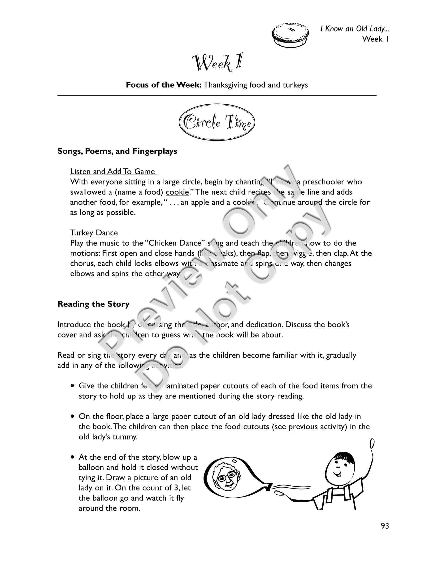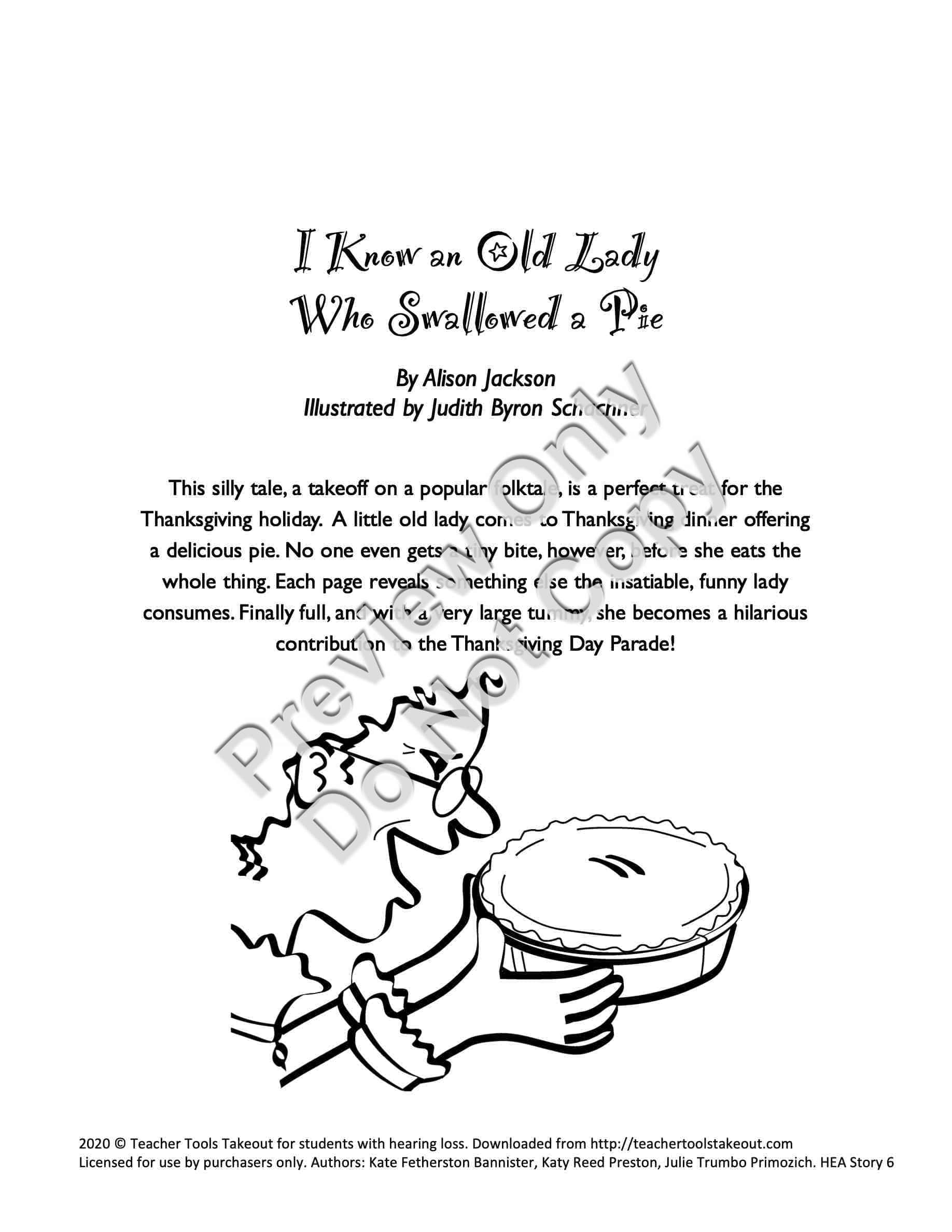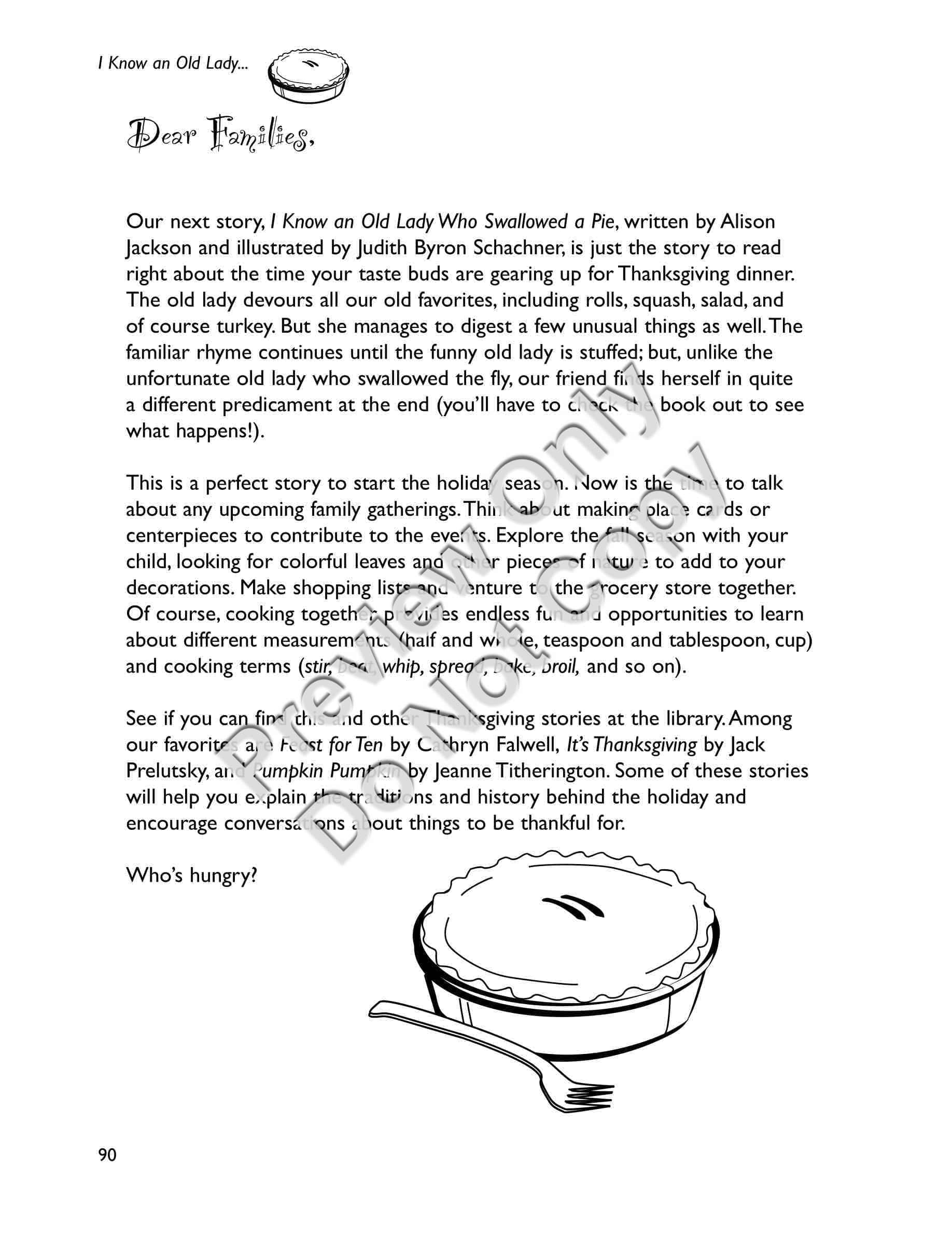 I Know an Old Lady Who Swallowed a Pie - Early Childhood / Preschool teaching materials for the book includes a) a synopsis of the storybook b) a letter to send home to families explaining the storybook unit and activities they can do at home c) suggestions for setting up your classroom to revolve around the story (dramatic play area, sensory area, art area, science area, book area, and bulletin board) d) activities separated into two weeks, each week including: a distinctive thematic, e) focus of the Week; Circle Time activities including songs, poems, fingerplays, and story-reading ideas; and six detailed Group Activities with designated target areas, f) snacks related to the story, g) a Pretest and Posttest