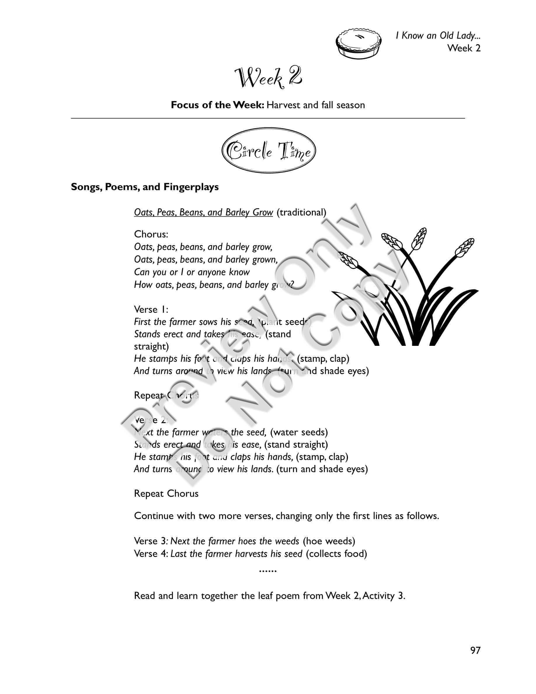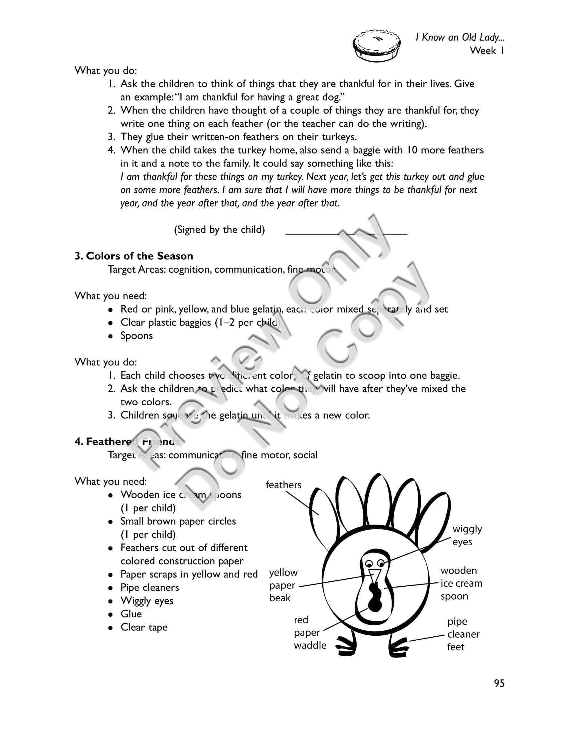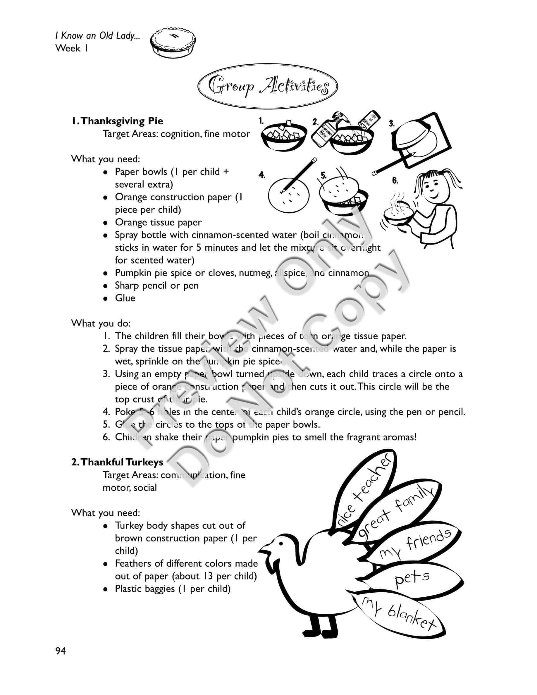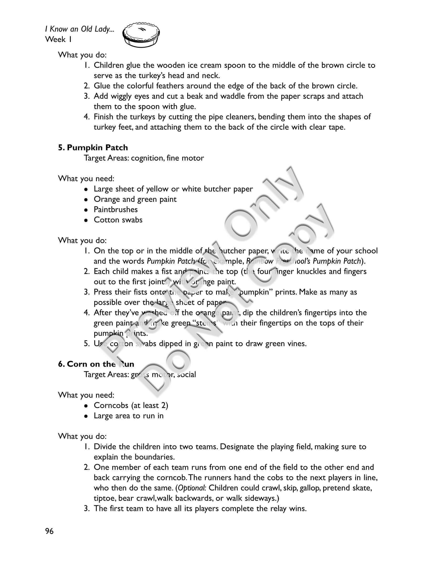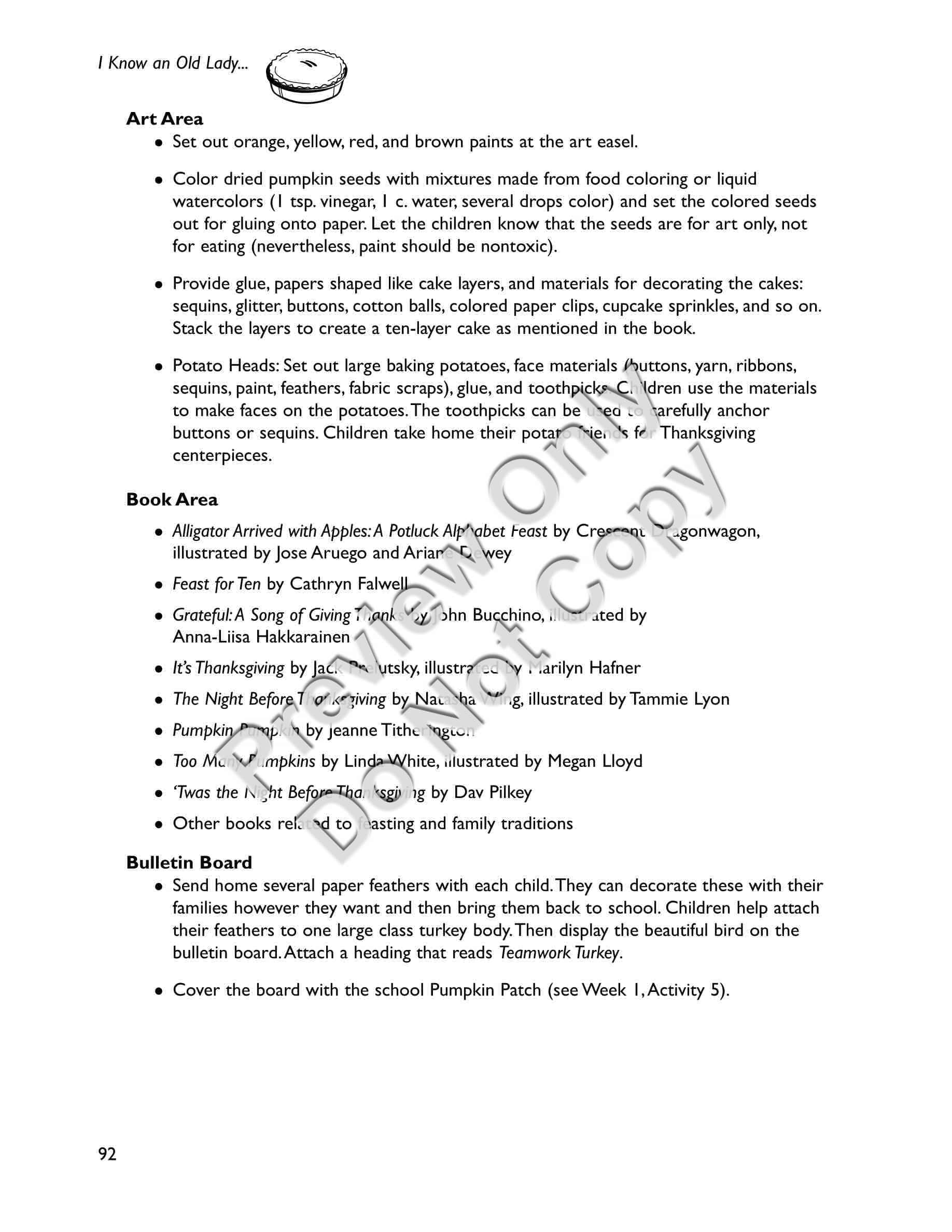 I Know an Old Lady Who Swallowed a Pie - Early Childhood / Preschool teaching materials for the book includes a) a synopsis of the storybook b) a letter to send home to families explaining the storybook unit and activities they can do at home c) suggestions for setting up your classroom to revolve around the story (dramatic play area, sensory area, art area, science area, book area, and bulletin board) d) activities separated into two weeks, each week including: a distinctive thematic, e) focus of the Week; Circle Time activities including songs, poems, fingerplays, and story-reading ideas; and six detailed Group Activities with designated target areas, f) snacks related to the story, g) a Pretest and Posttest