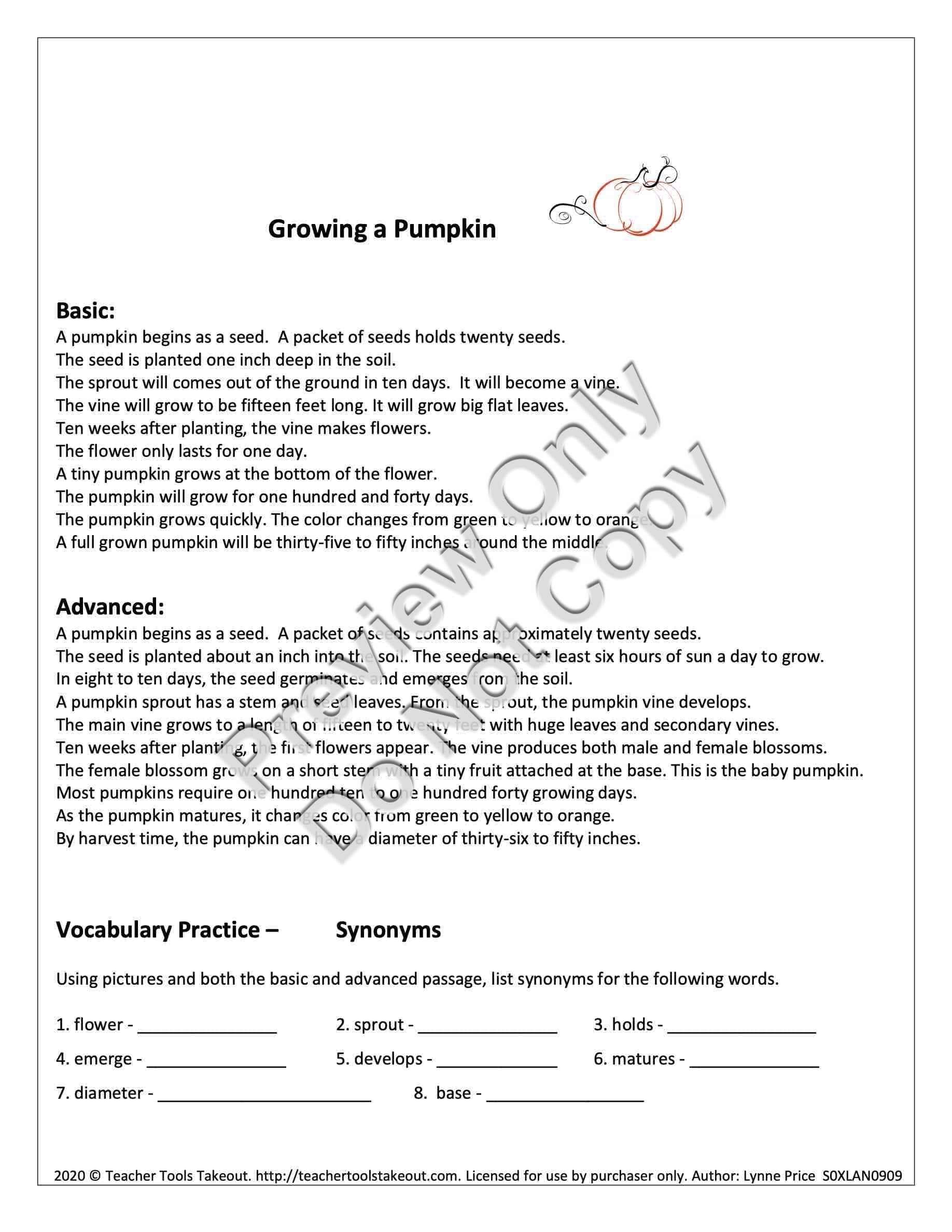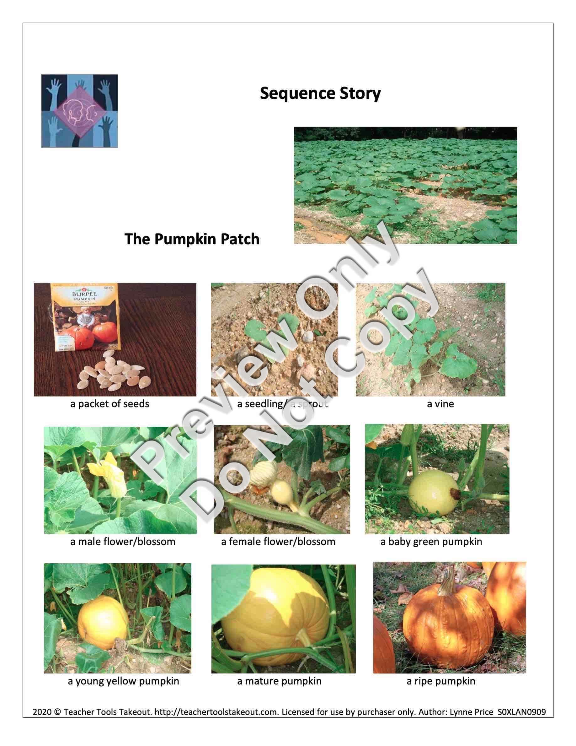 Sequencing information is a critical skill in understanding stories, categorizing, and language processing. This story contains reading and sequencing activities that can be used at a basic and intermediate level. A great companion to October and/or pumpkin-themed books. Includes real-world pictures of pumpkin growth, with reading, sequencing and comprehension/critical thinking questions. |
