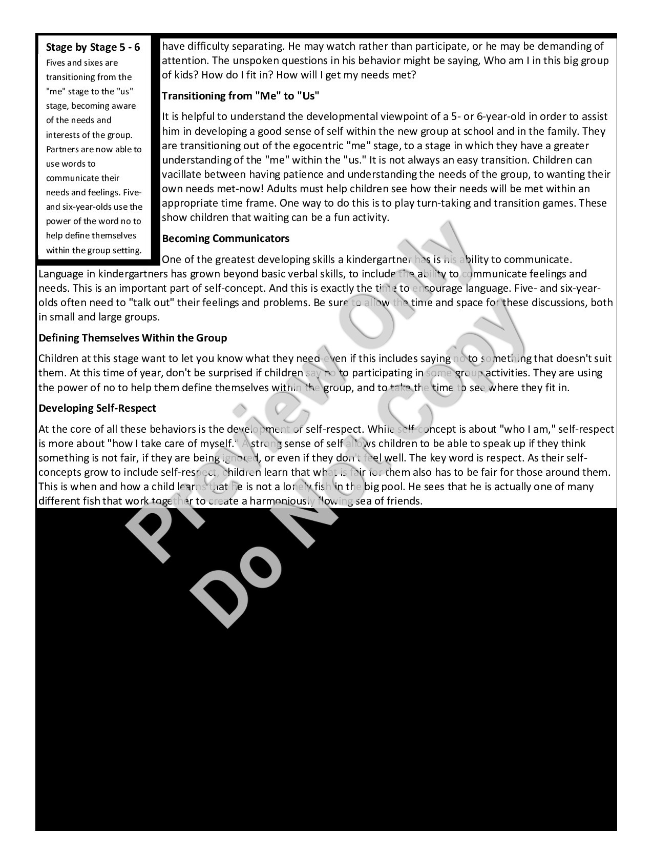 Self-concept develops from infancy through childhood. This resource describes the stages of self-concept development for ages birth through 2 years, 3-4 years, and 5-6 years. Useful for educational planning and understanding behavior, along with the need to strengthen self-concept development.