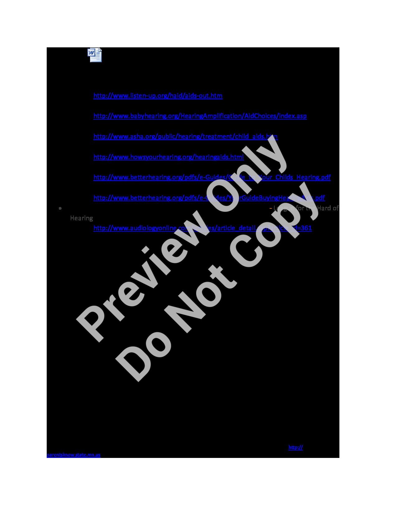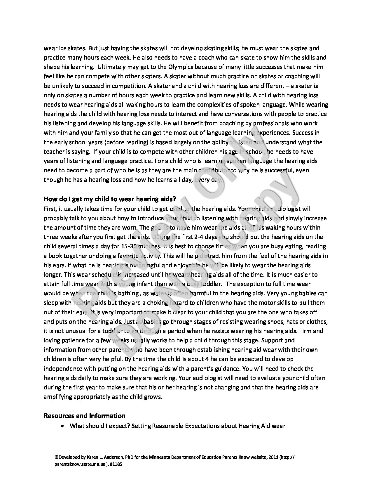 Once a child is diagnosed with hearing loss family members have many questions about hearing aids. This resource provides information on the following questions: a) What are hearing aids? b) Why does my child need to wear hearing aids? c) When does my child with permanent hearing loss need to start wearing hearing aids? d) How much does my child need to use hearing aids every day? e) How do I get my child to wear hearing aids? f) resources and information.