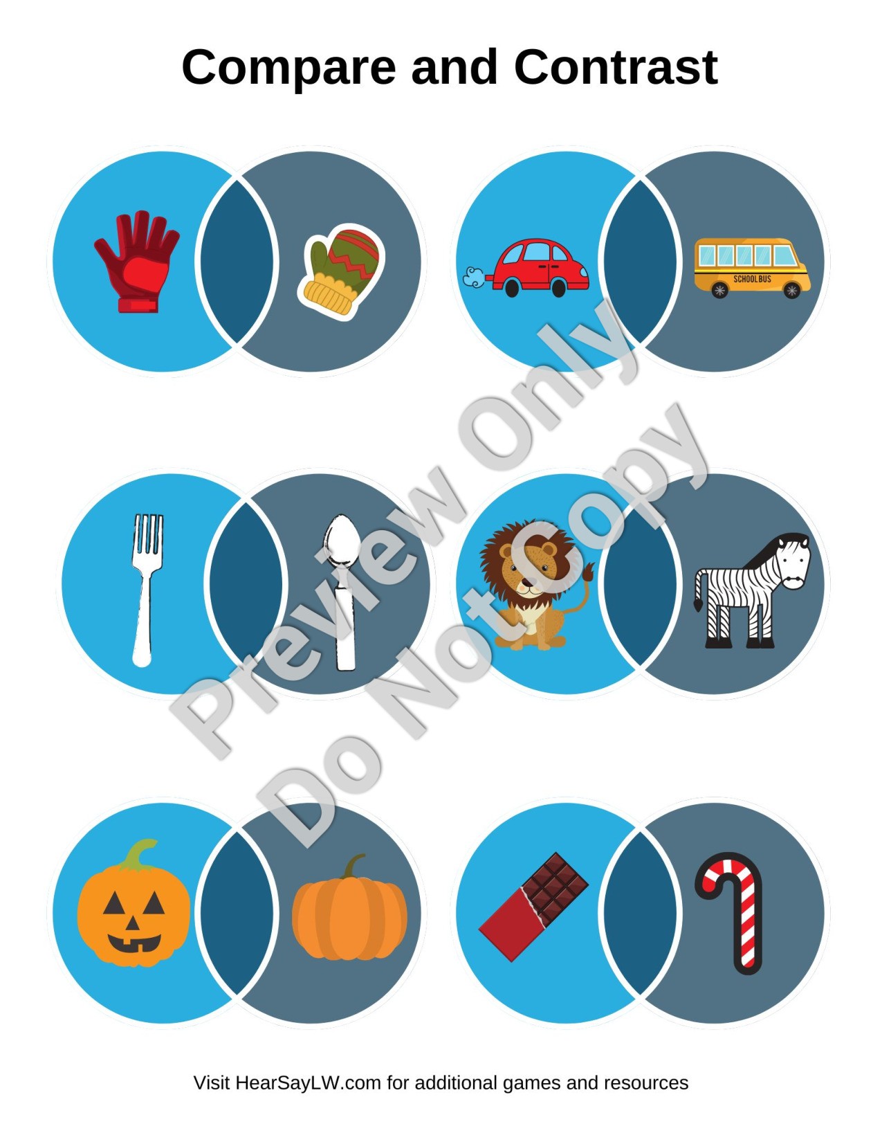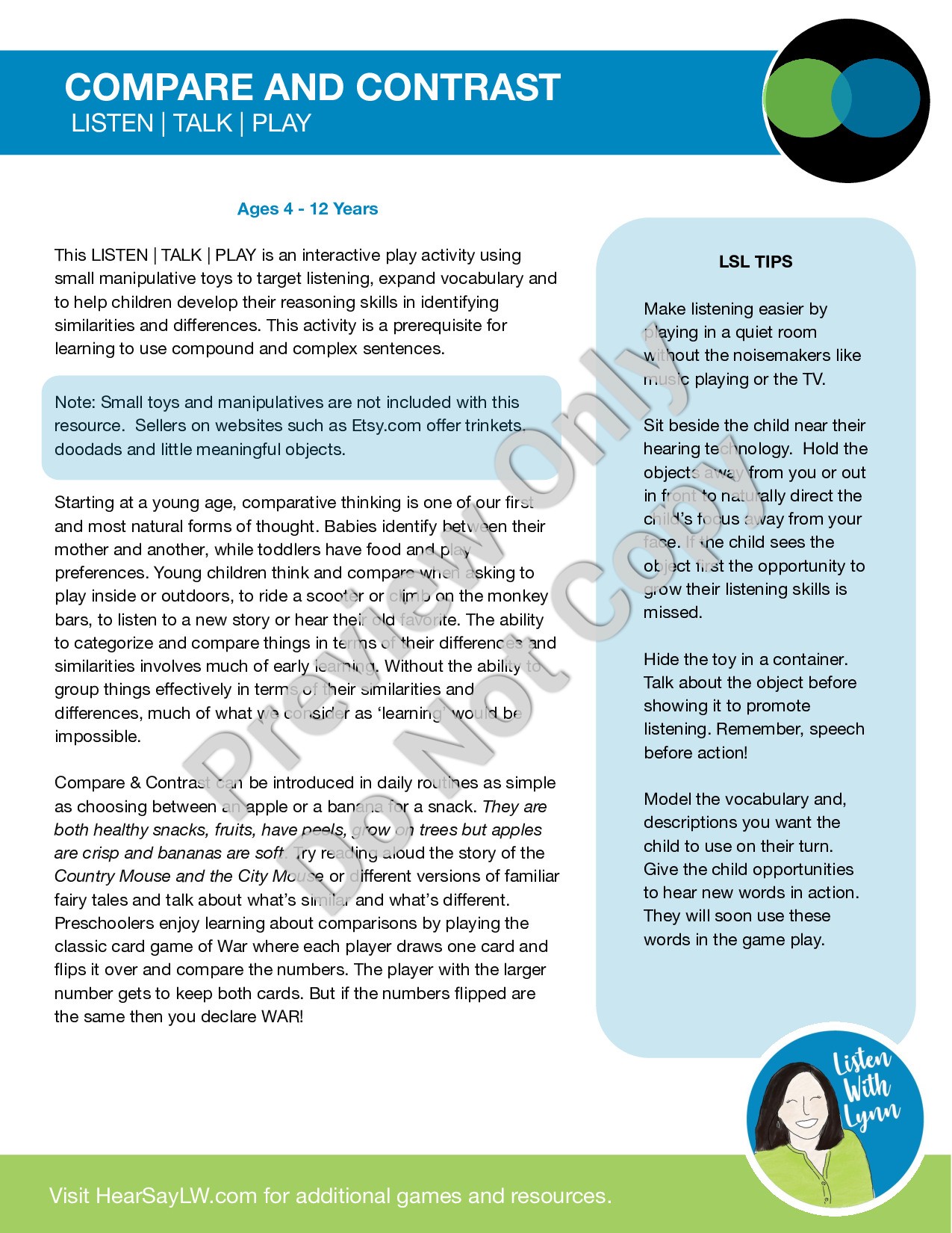Listening & Language Compare & Contrast targets listening, growing vocabulary, descriptive language skills, critical thinking, two-way conversations and help develop reasoning skills in identifying similarities and differences.