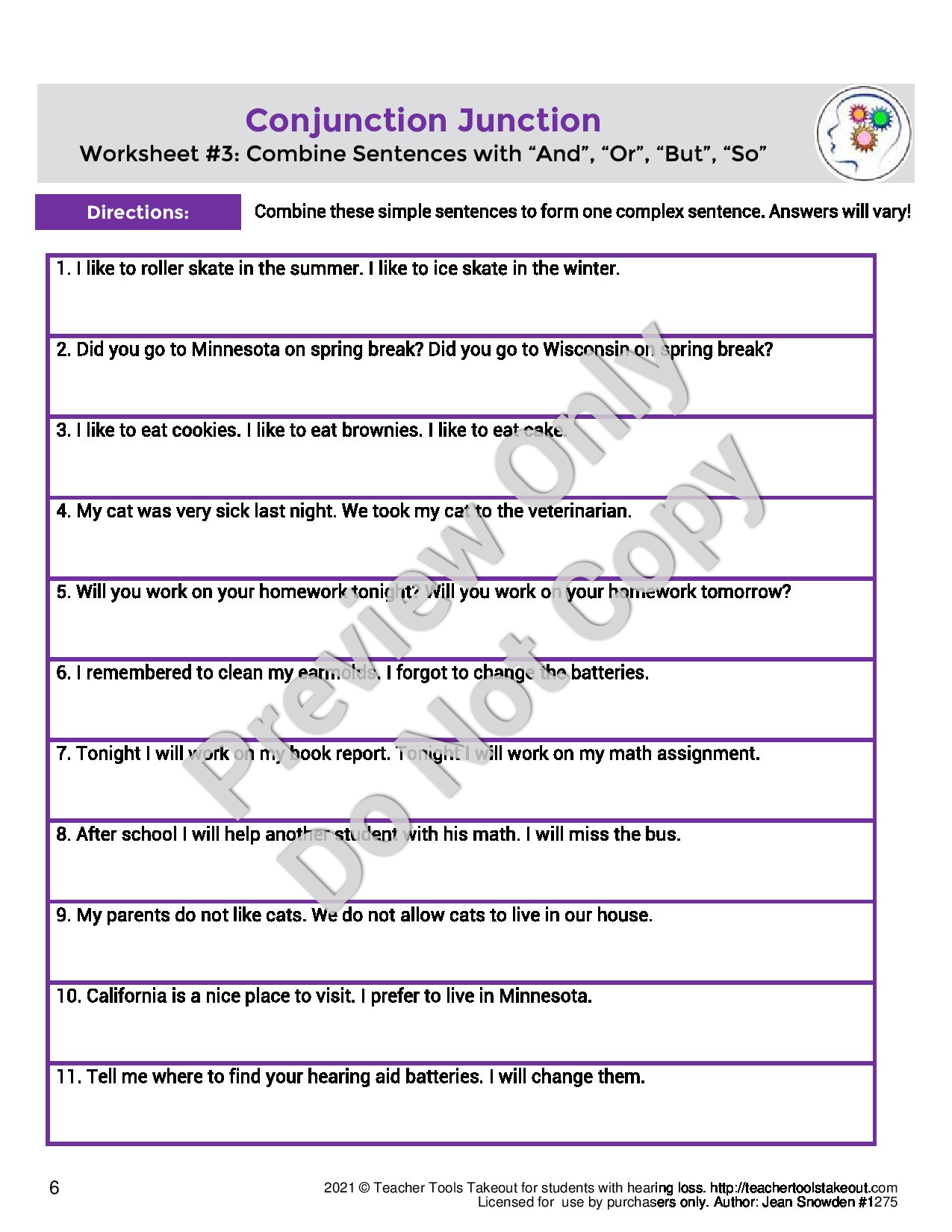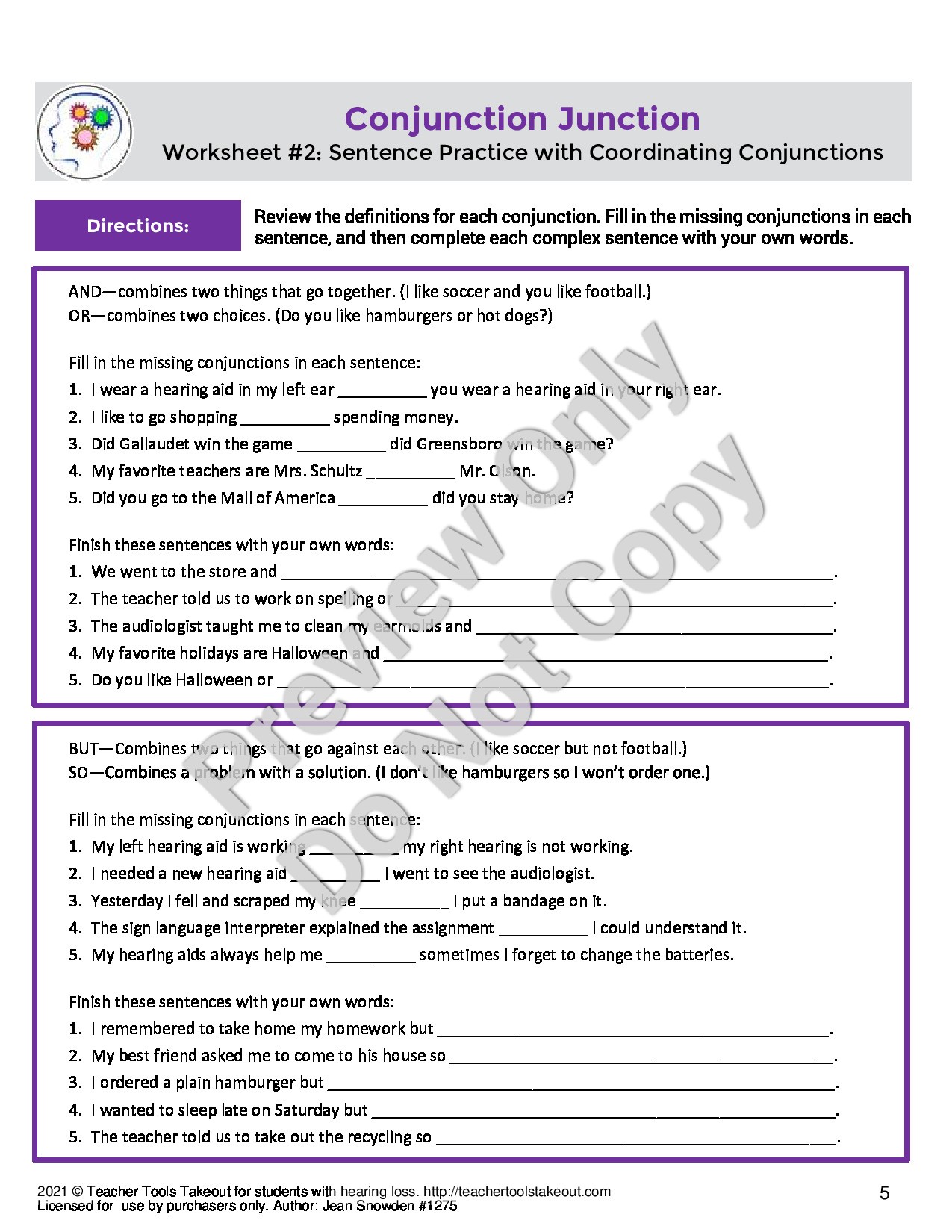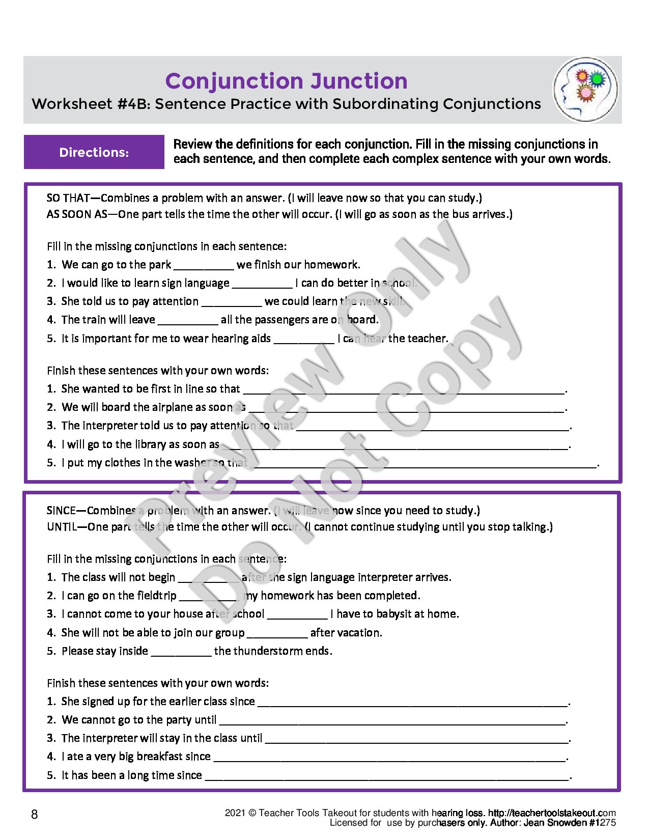 Shop Now| Conjunctions hook up words and phrases and clause, like and, but, or, and so. This article provides extensive examples of conjunctions and practice for basic, intermediate and advanced levels of knowledge. Includes 6 fill in the blanks worksheet activities. |