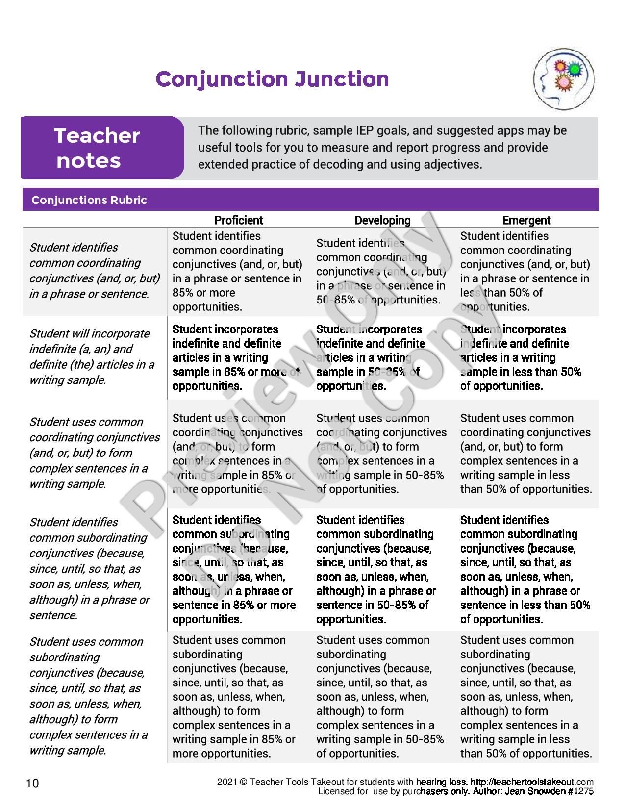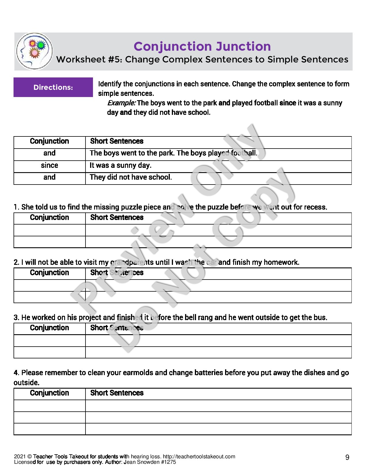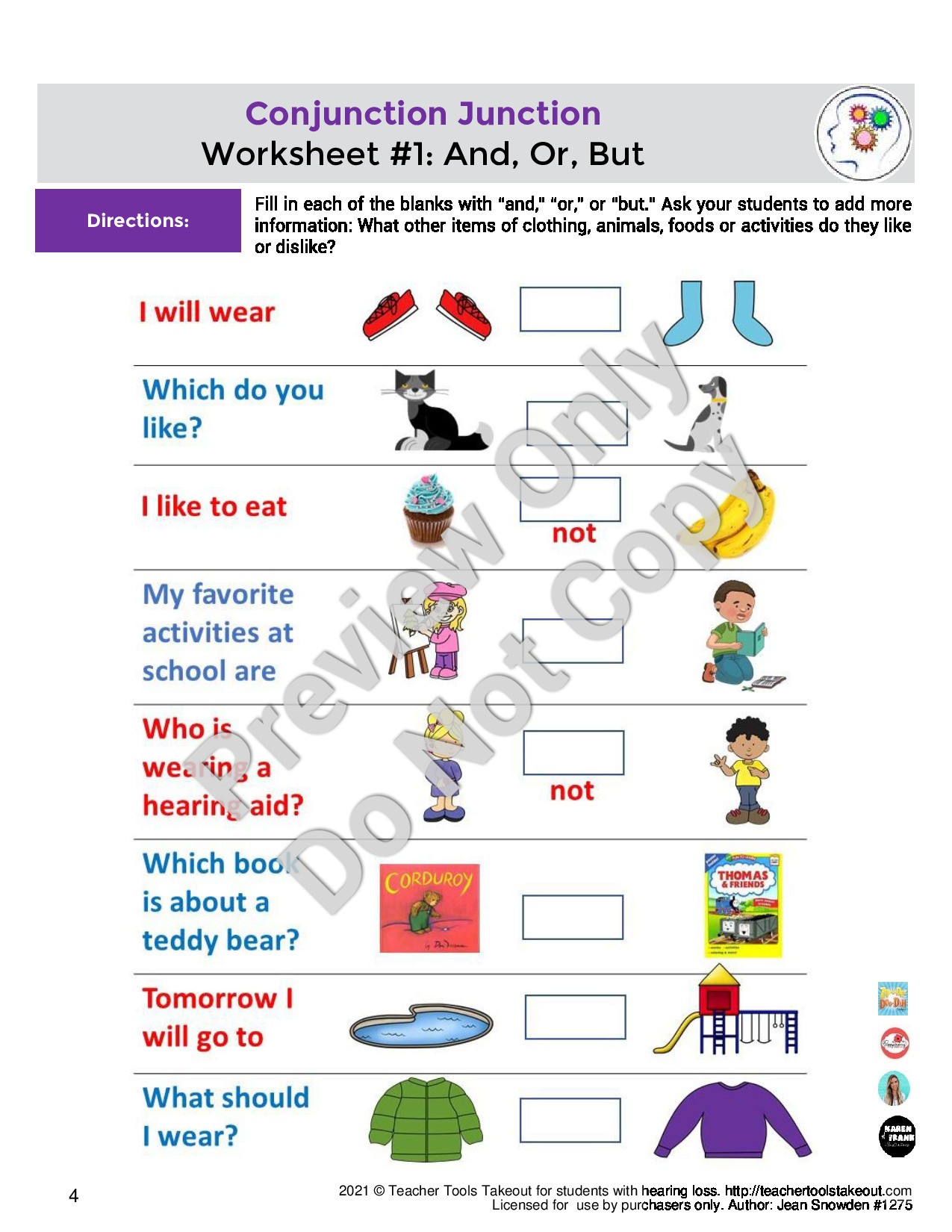 Shop Now| Conjunctions hook up words and phrases and clause, like and, but, or, and so. This article provides extensive examples of conjunctions and practice for basic, intermediate and advanced levels of knowledge. Includes 6 fill in the blanks worksheet activities. |