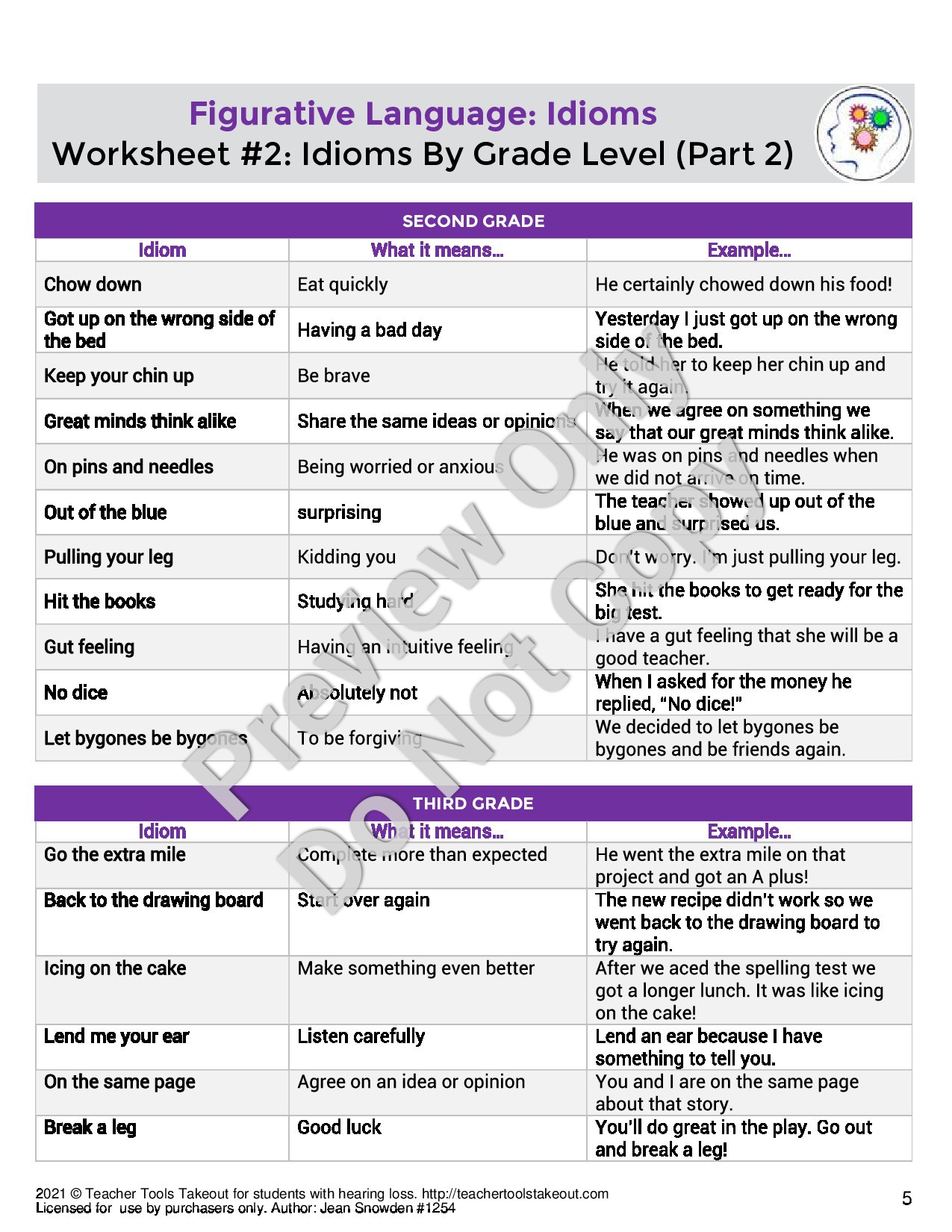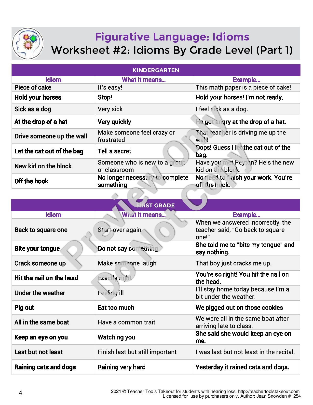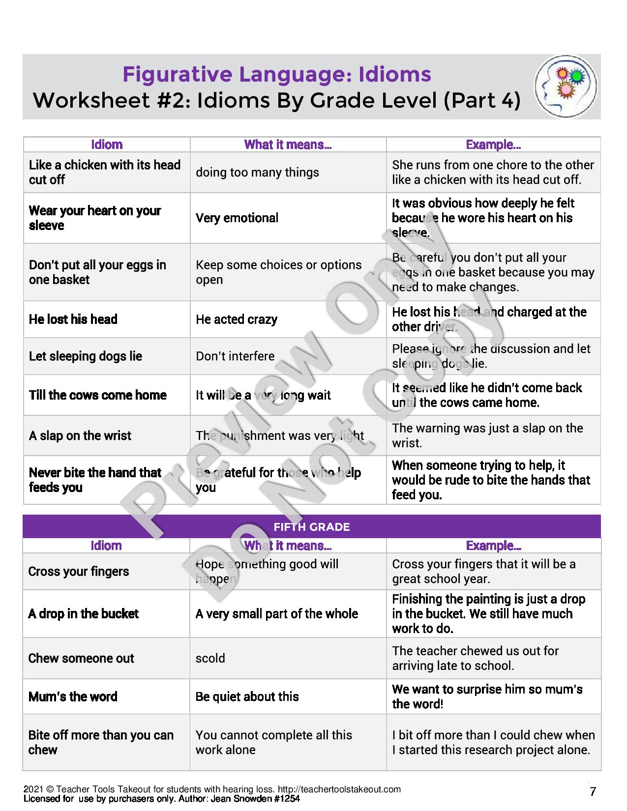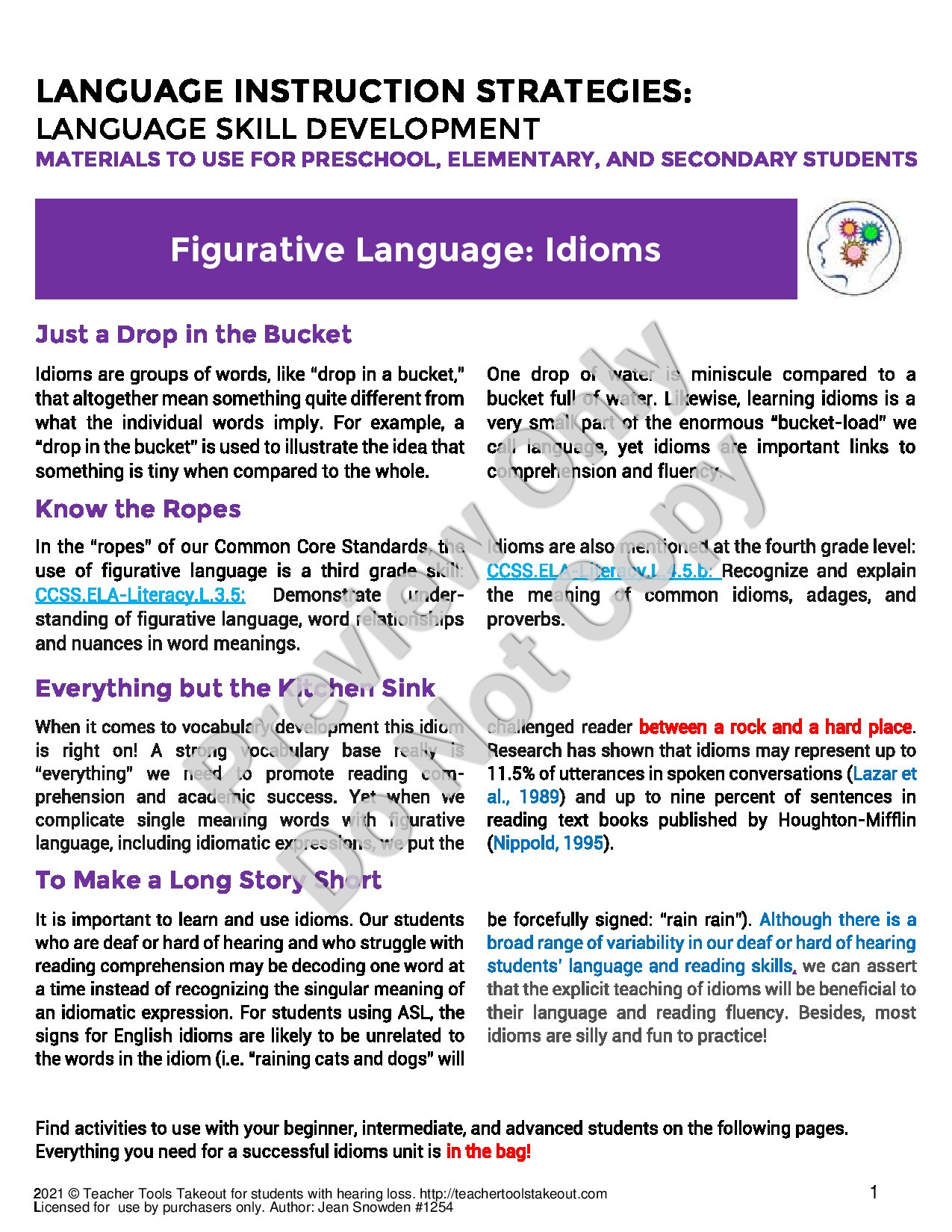 Shop Now| This article provides basic, intermediate, and advanced activities supporting learning idioms. Examples of specific idioms at kindergarten, grade 1- grade 6 levels are provided along with interpretations of idiom meanings. A reading comprehension story is included that uses many idioms in which students must identify each idiom and explain what it means. Another worksheet activity asks students to fill the appropriate idiom in the blank when given a sentence. This extensive article provides much practice in understanding and appropriately using idioms. |