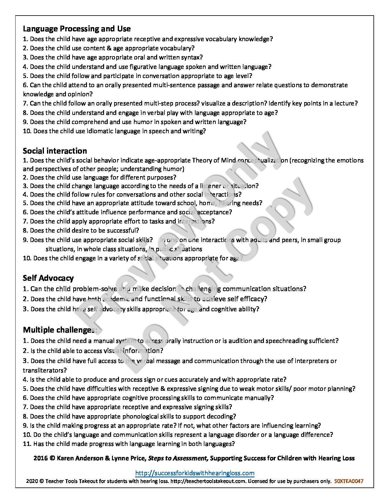 Shop NowThis handout specifies areas of assessment for students with hearing loss and guiding questions to be asked within each area. The questions help teachers and school teams to identify assessment area needs to further define specific student needs.