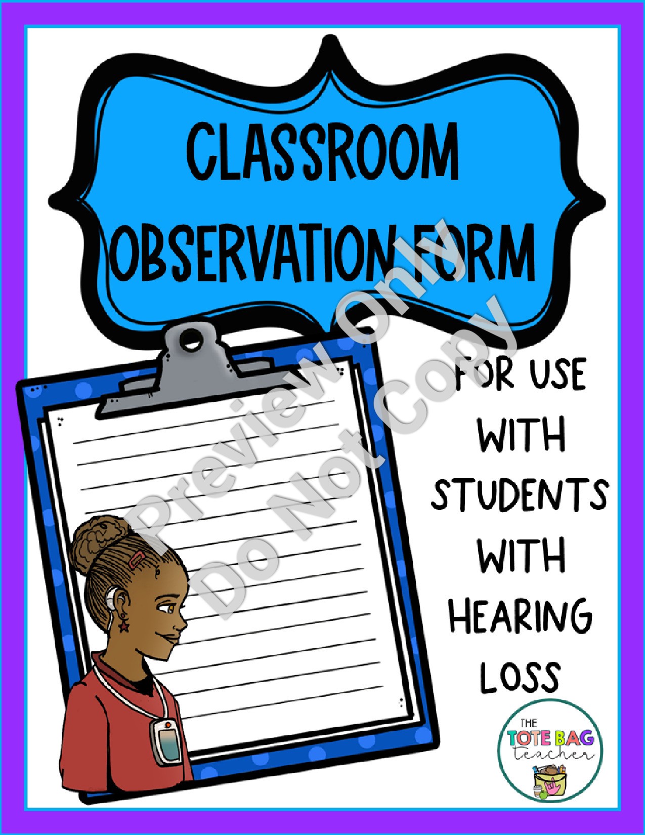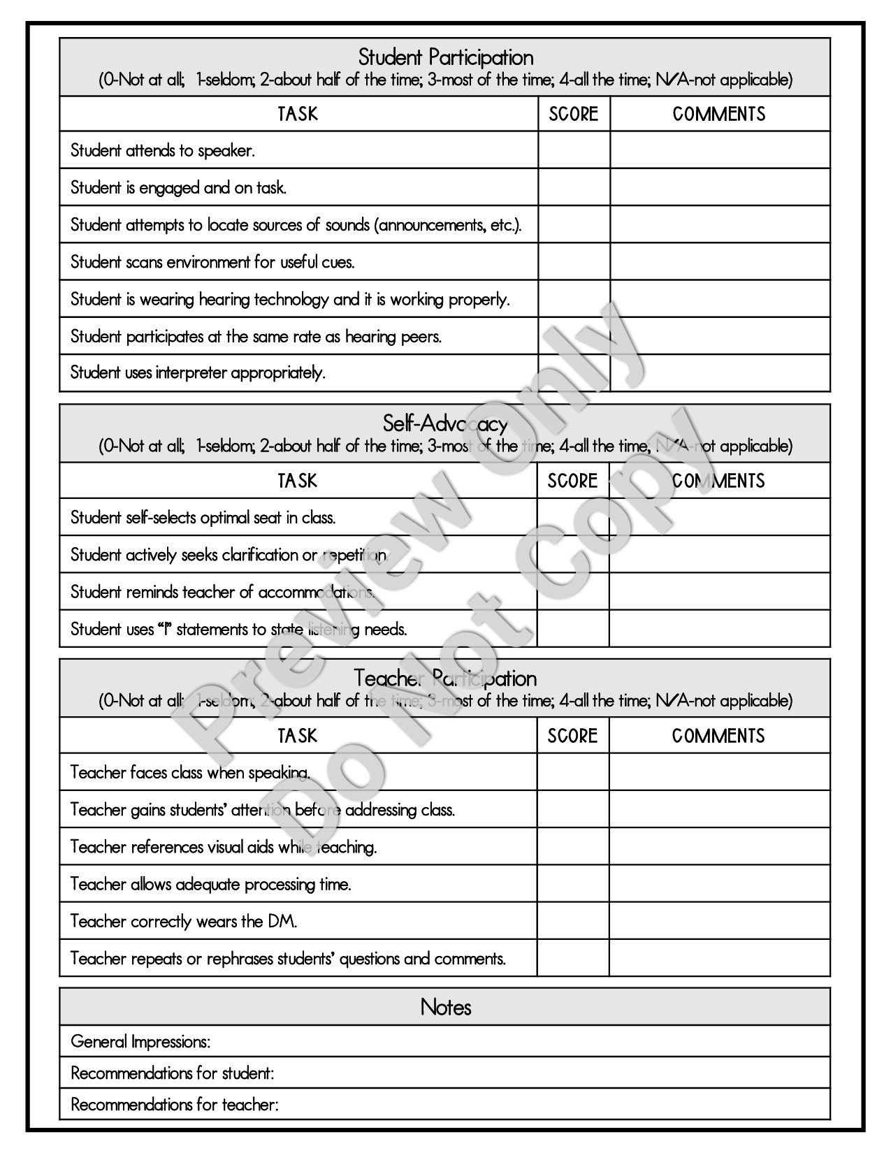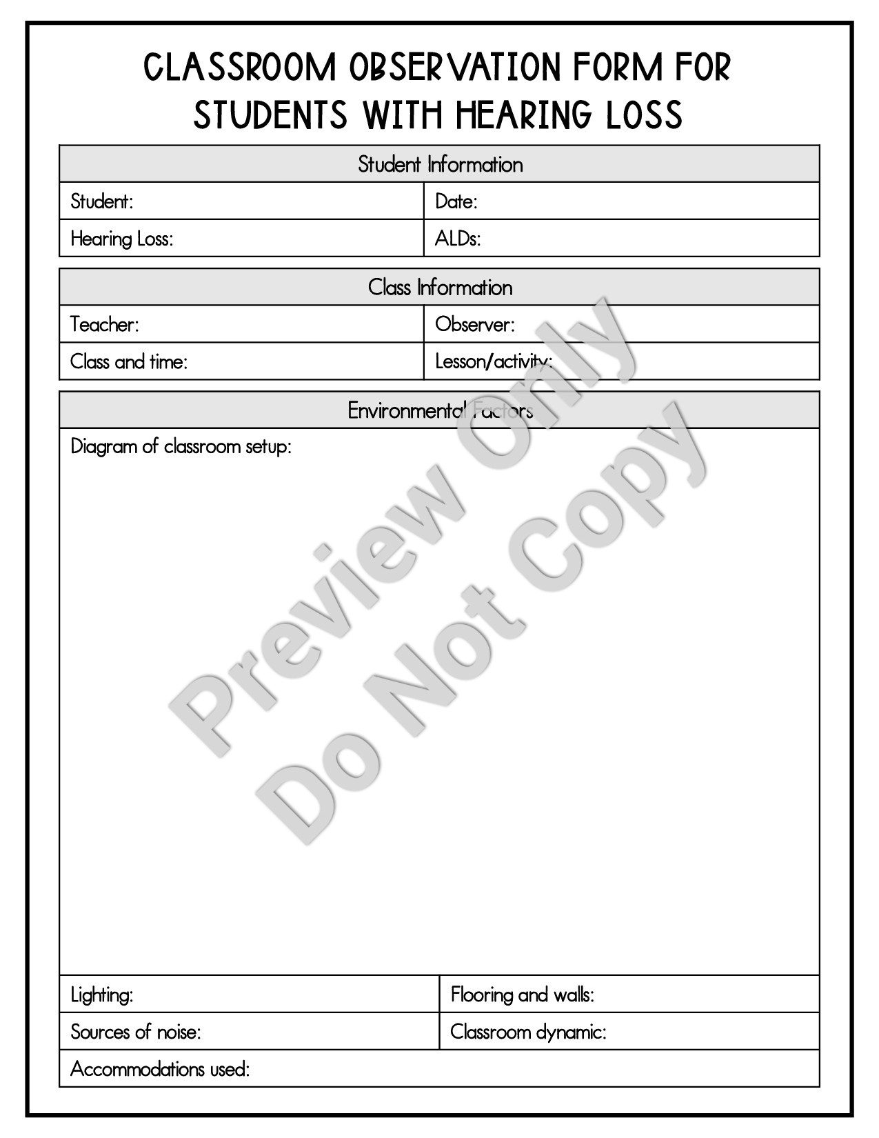 Shop NowBeing able to observe a student with hearing loss in the regular education classroom is a vital part of designing a student's IEP and meeting their needs. This 2-page pdf observation form is a simple tool to help get an accurate picture of your d/hh students. This easy-to-use form is great for collecting data on student engagement/participation, self-advocacy skills, and much more. It's also great for providing helpful information and recommendations to the regular education teachers.