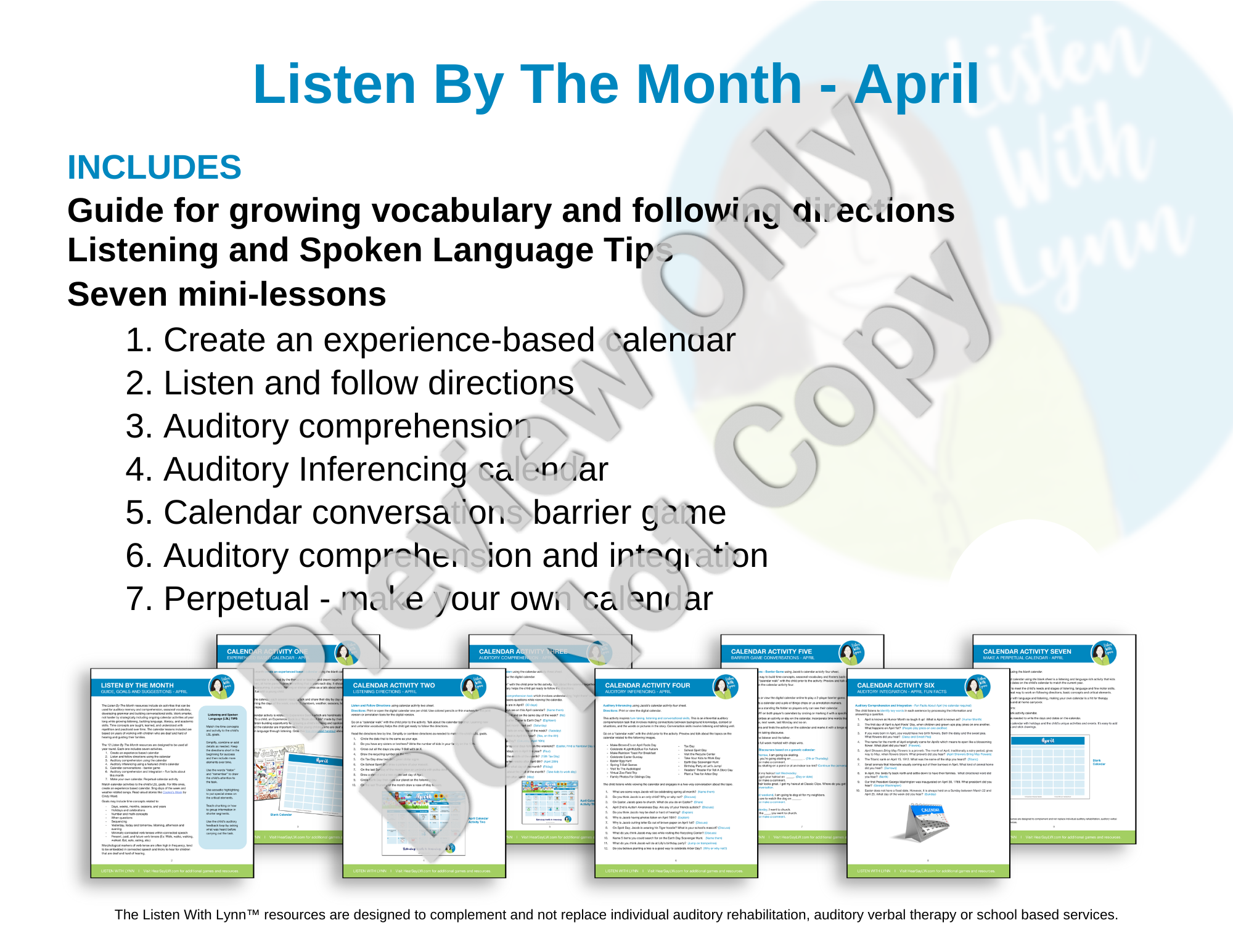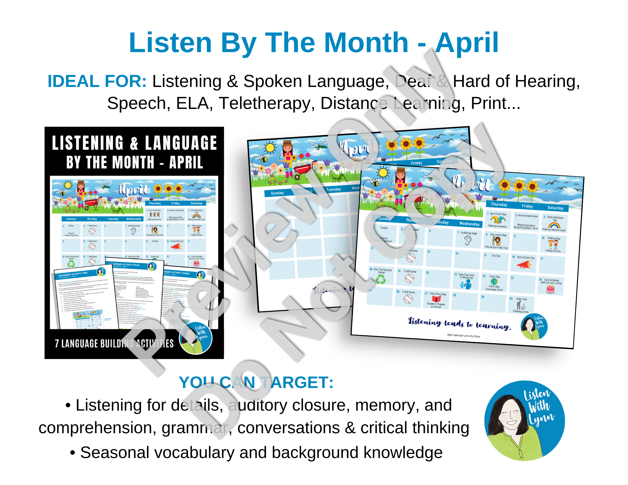Shop NowThe APRIL Listening and Language By The Month resource includes seven activities that can be used for auditory memory and comprehension, seasonal vocabulary, developing grammar, and building conversational skills.