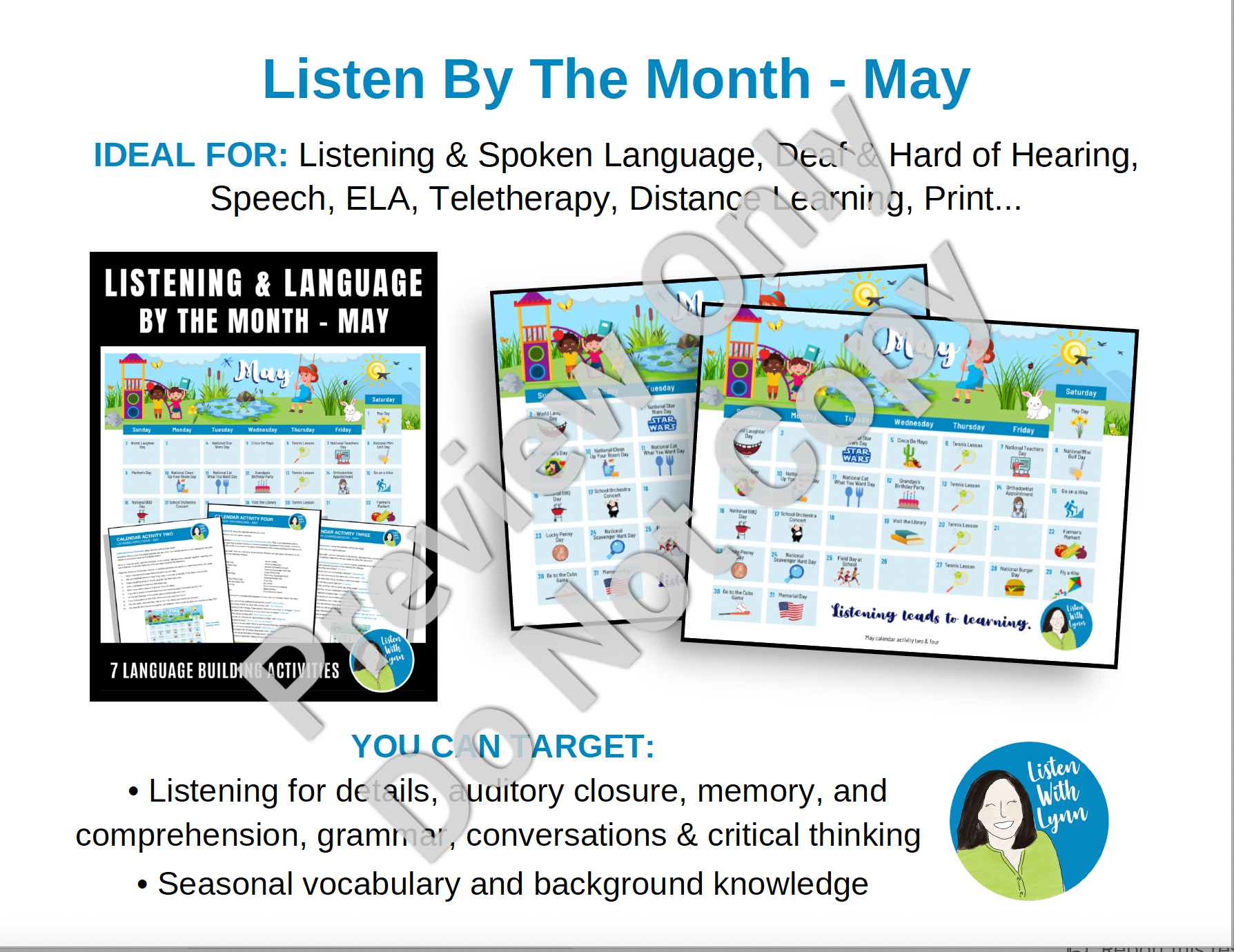 The MAY Listening and Language By The Month resource includes seven activities that can be used for auditory memory and comprehension, seasonal vocabulary, developing grammar, and building conversational skills.