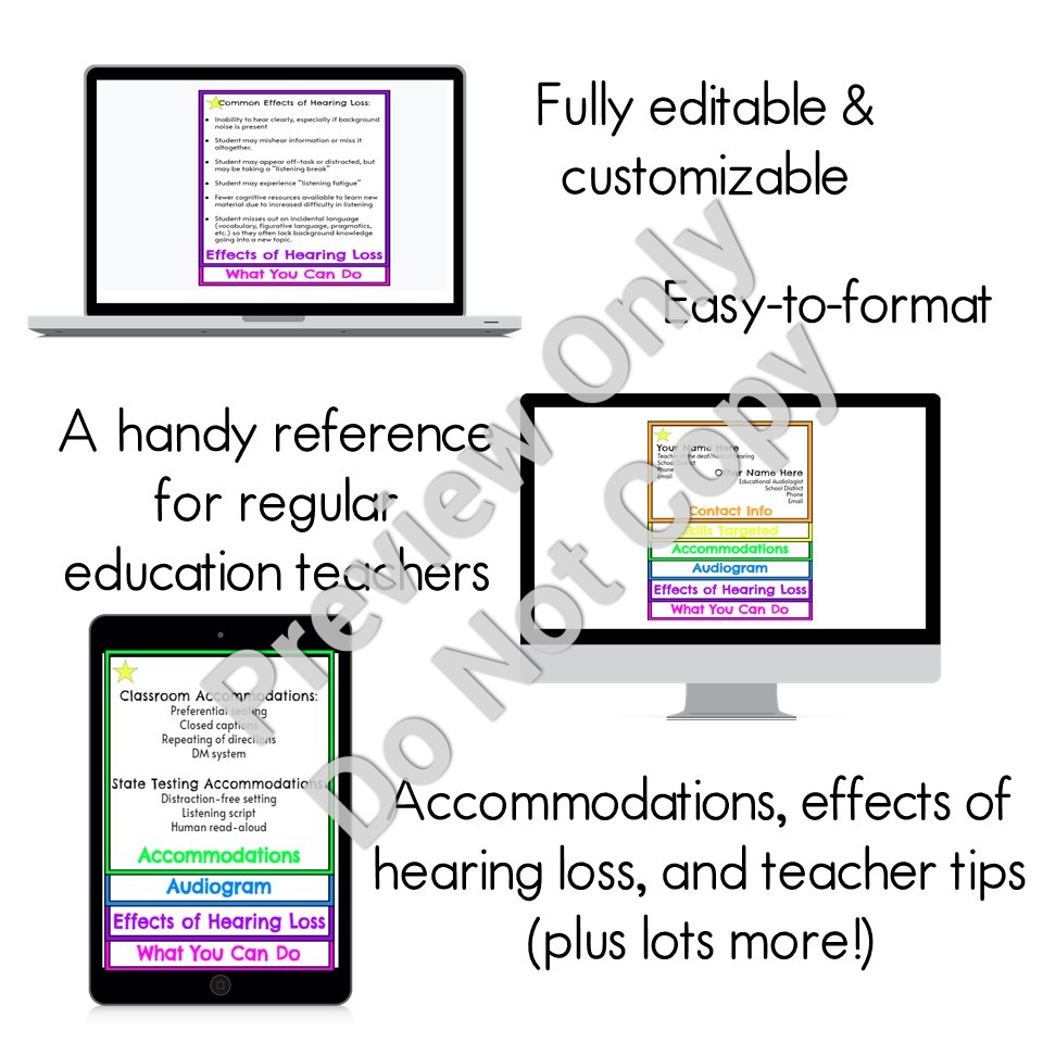 This one-page PDF includes a link to access this product via Google Slides. This editable and customizable Google Slides presentation is a handy resource to give regular education teachers so they can keep their student’s hearing loss information at their fingertips.