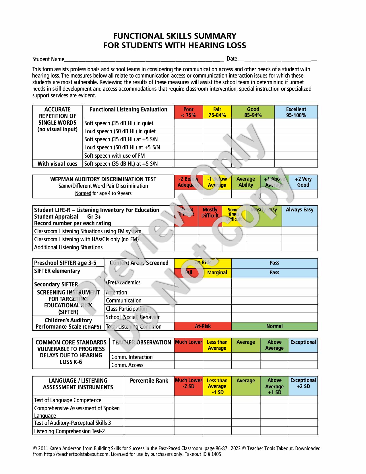 Shop NowThe fillable Functional Skills Checklist for Students with Hearing Loss identifies specific areas in which students with hearing loss are most vulnerable to communication access and interaction performance issues. Simply state the test used and the form will allow you to code it as Green – Yellow – Red, to highlight how the student compares with expectations for typical development. This helps to identify if an academic performance gap is present, or if it is widening as time goes on. Without the same performance or access as class peers, typical student progress is jeopardized. Appropriate planning will address how full access to education will be assured to prevent a widening gap in academic achievement.