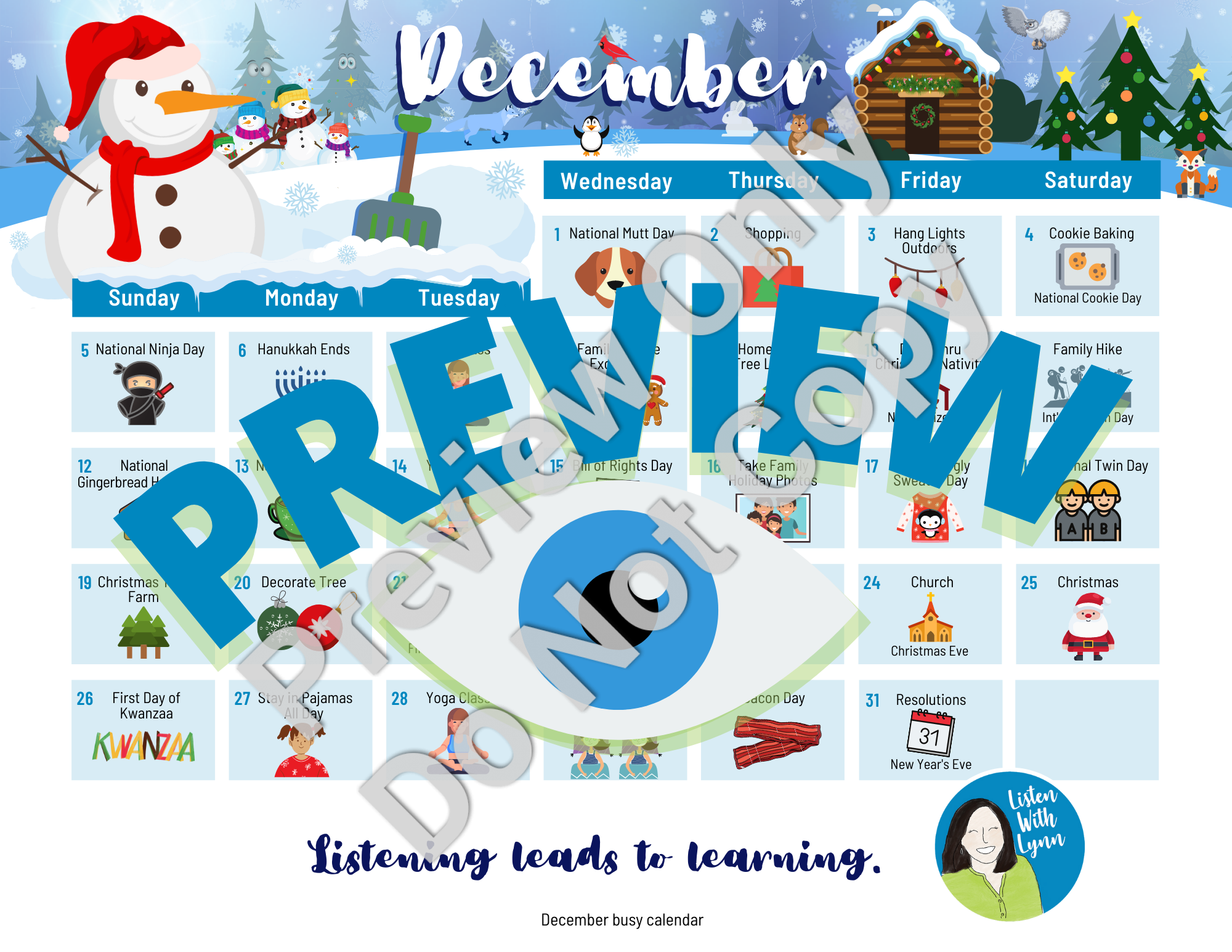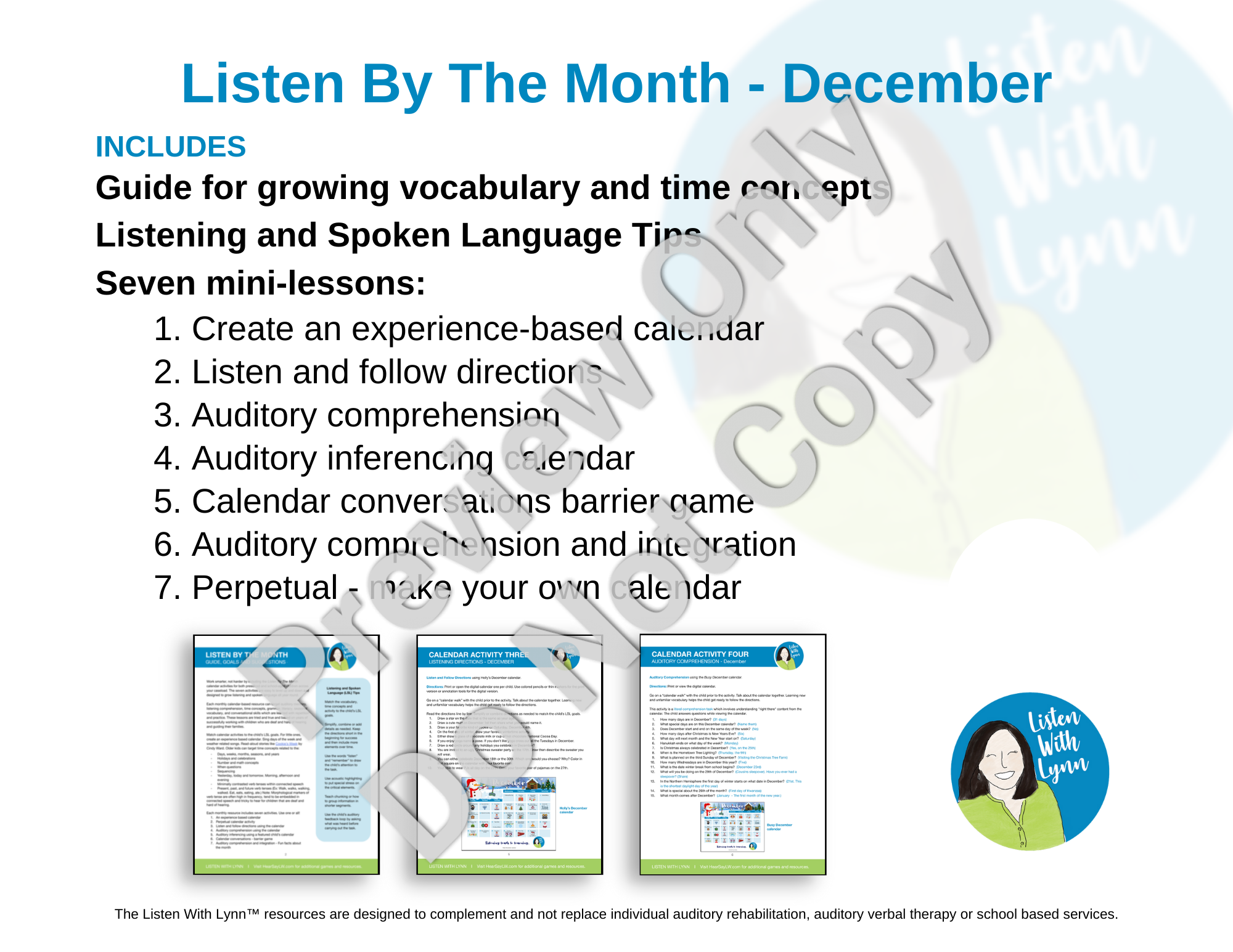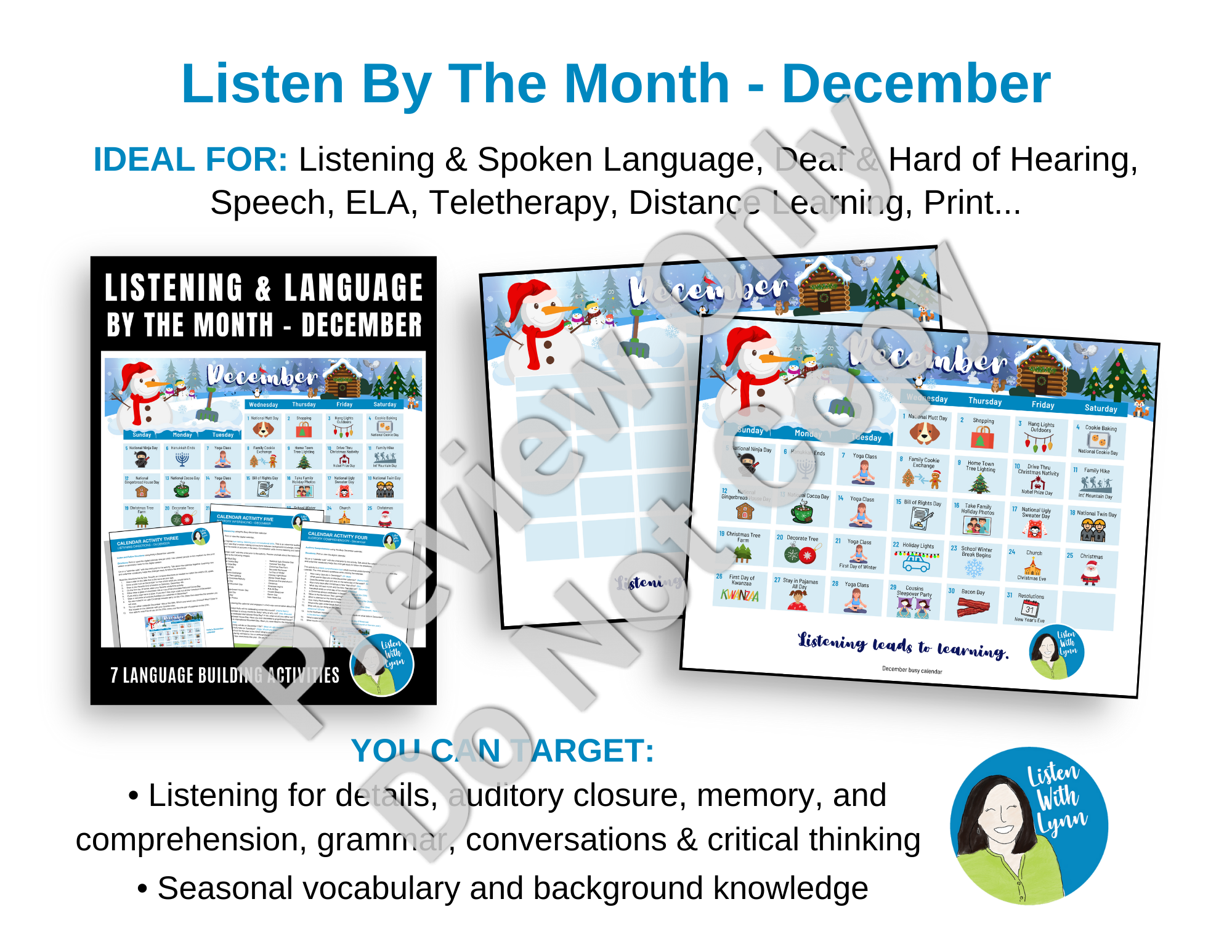 Includes seven listening and spoken language activities or mini-lessons with December calendars