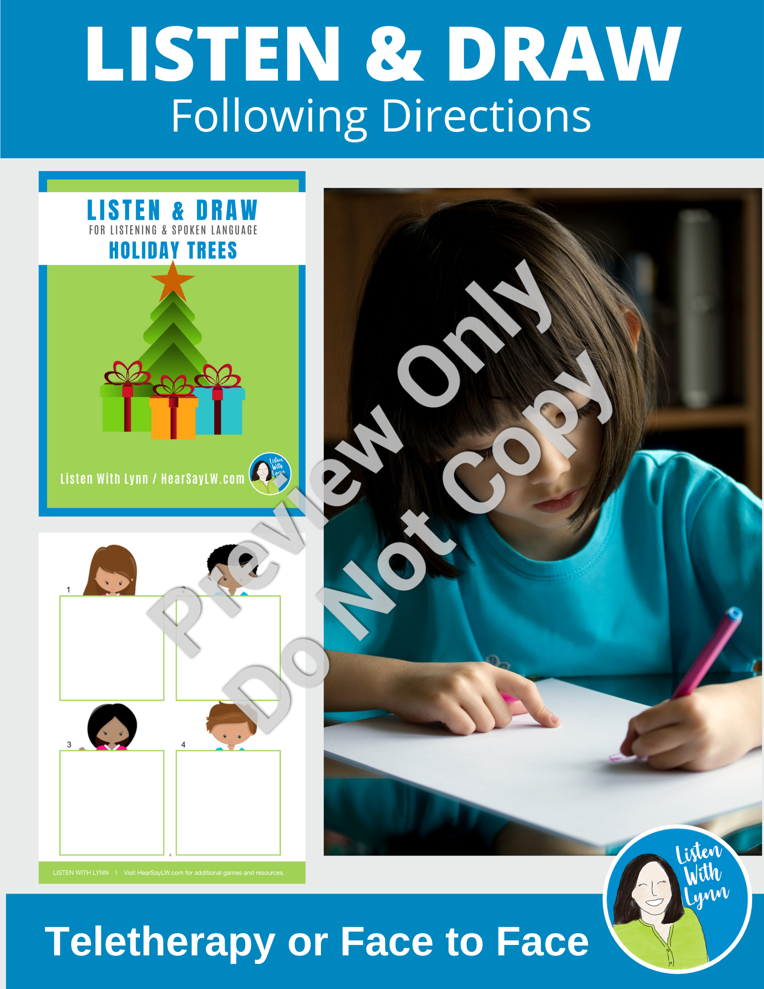✧ Children follow verbal step-by-step directions, listen closely to details, and comprehend to draw holiday trees for Merry, Nicholas, Noel, and Gabriel.