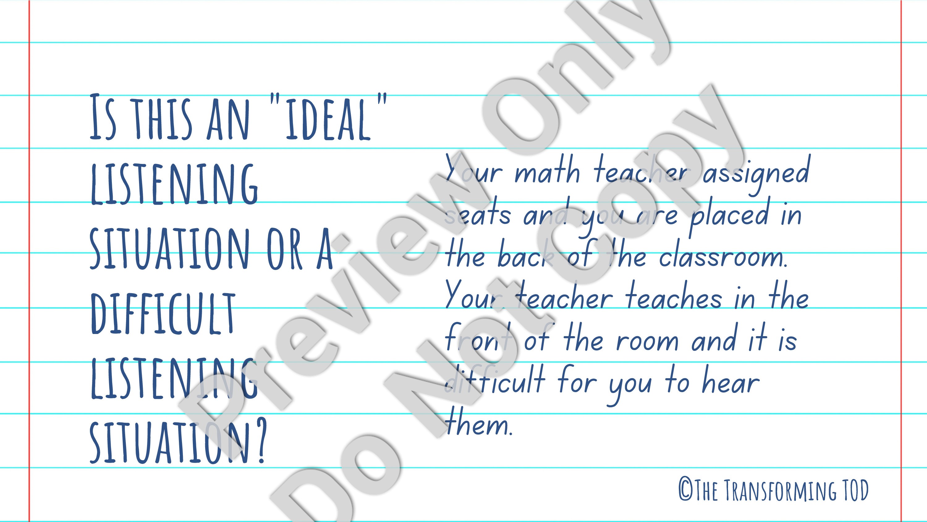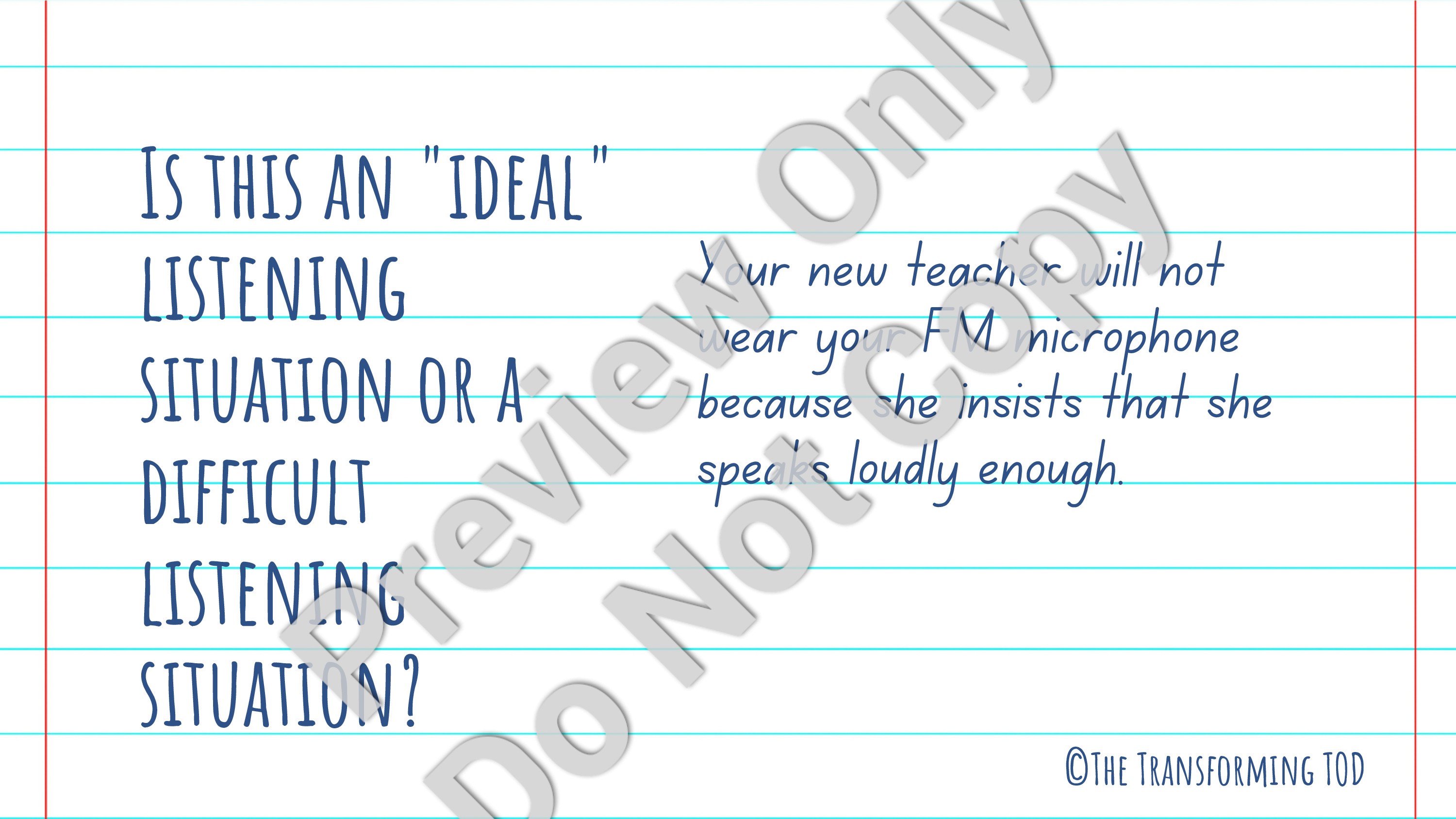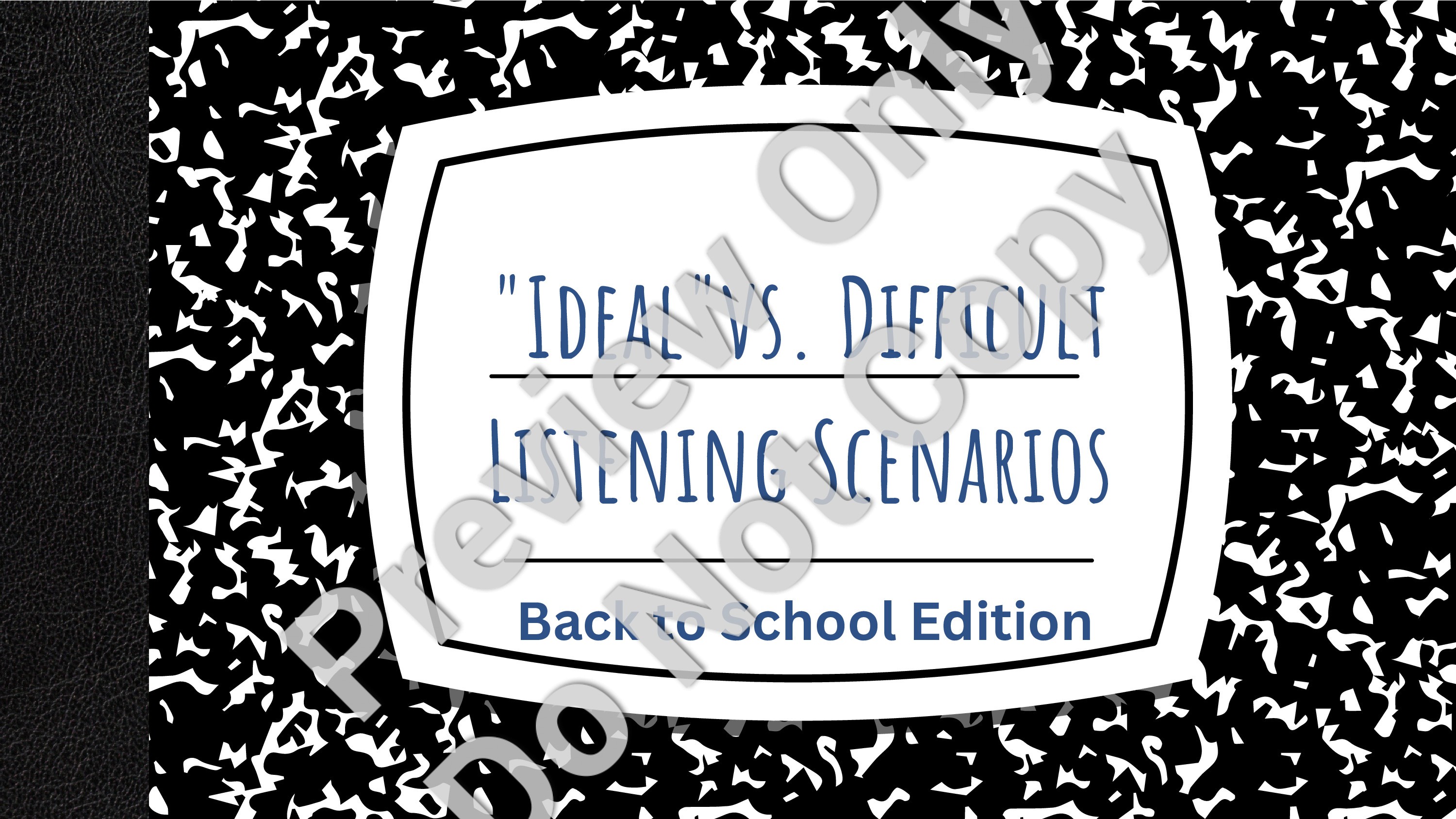 This resource contains 15 possible listening situations for DHH learners. Read each scenario and have your student decide if this is an "ideal" listening situation or a "difficult" listening situation