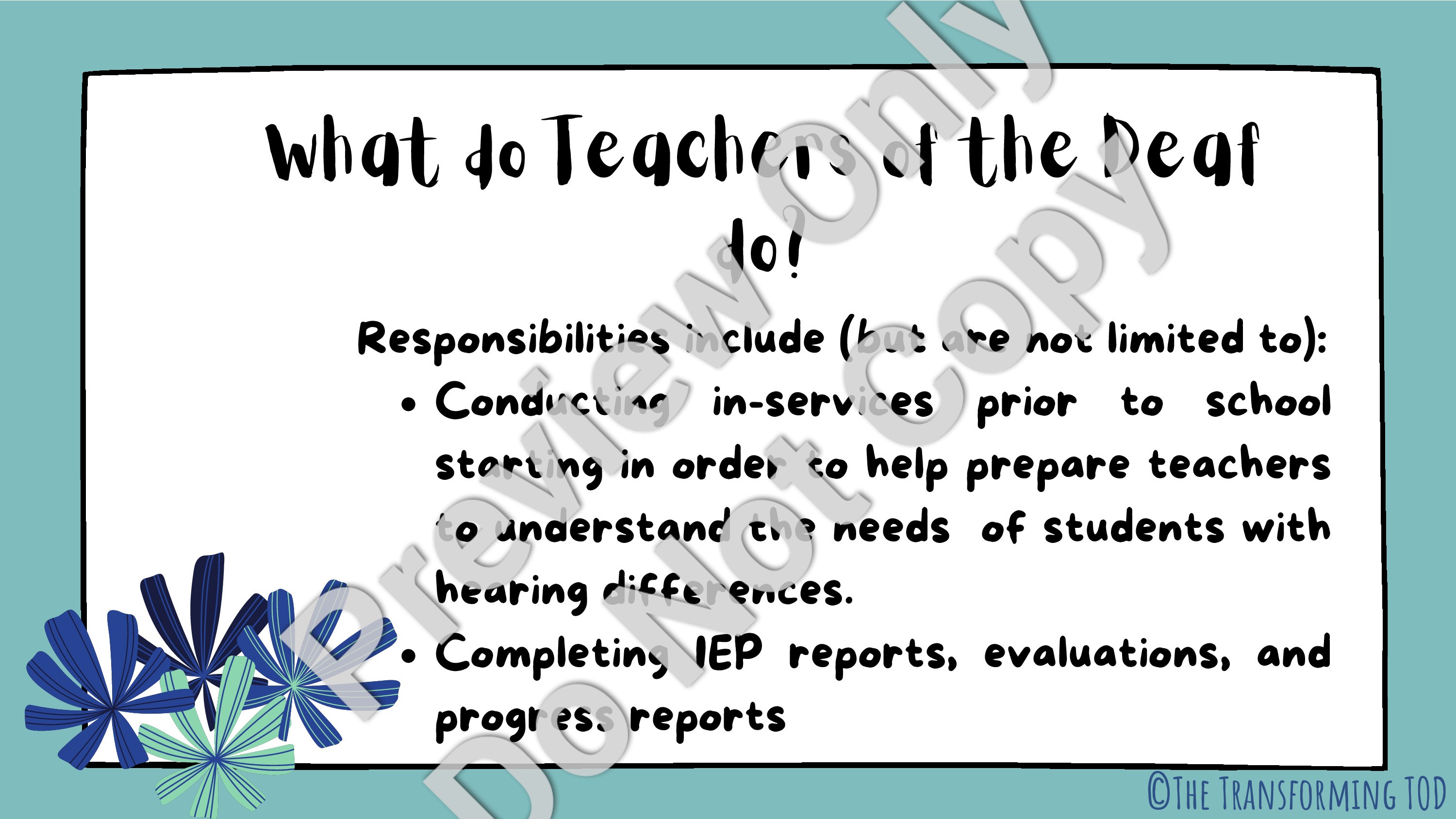 This resource is a Powerpoint presentation that outlines the role of a virtual Teacher of the Deaf/Hard-of-Hearing. The presentation describes the remote learning process, the role of the Teacher of the Deaf, and some benefits of remote learning. It can be used as an inservice tool or as an introduction to remote learning for school personnel who may not be familiar with working with a remote team member.Â