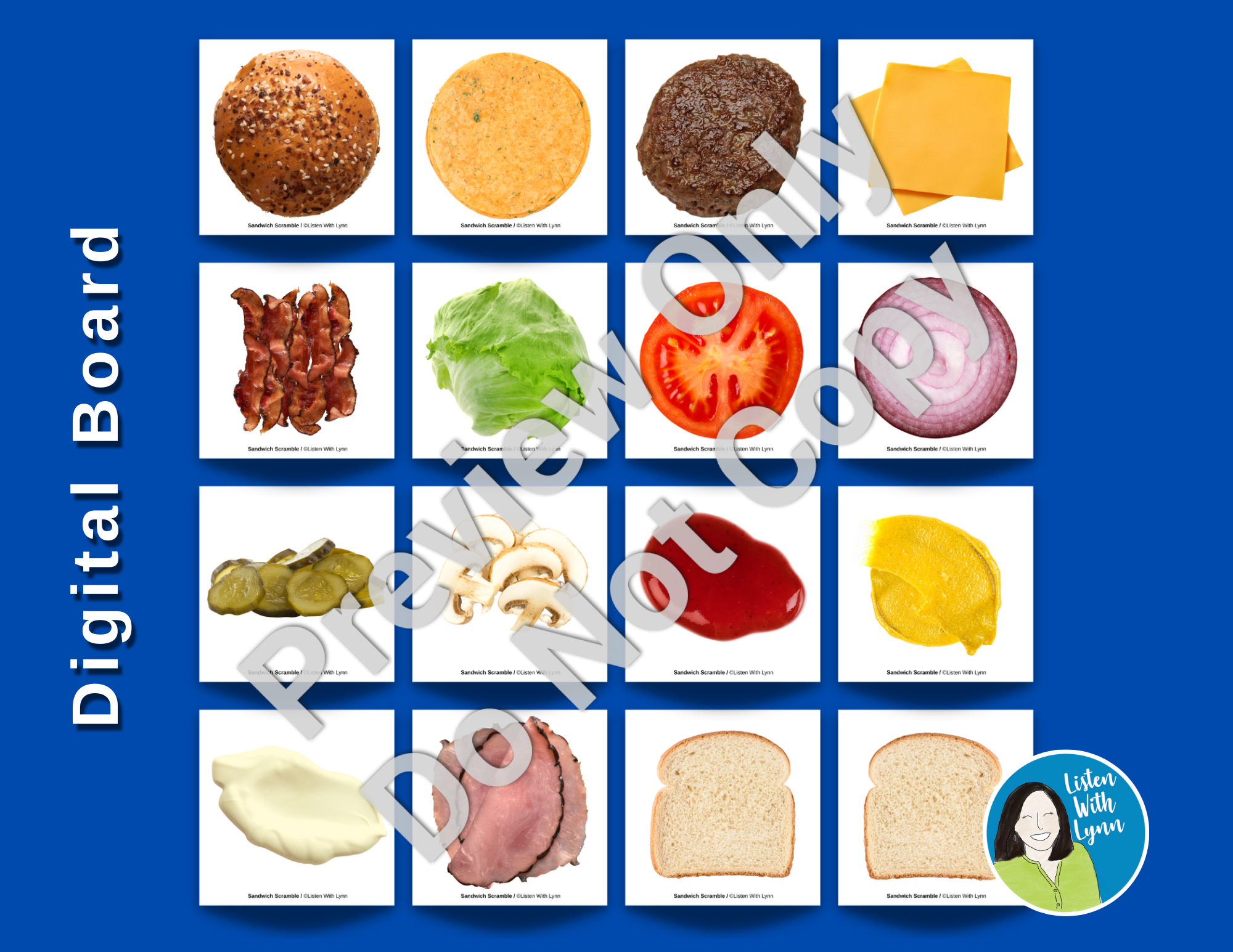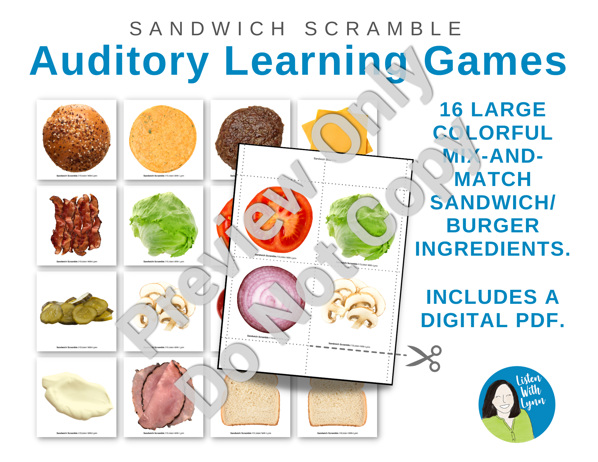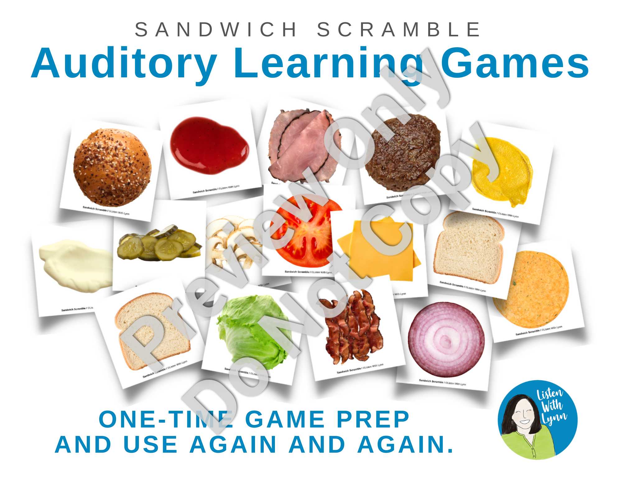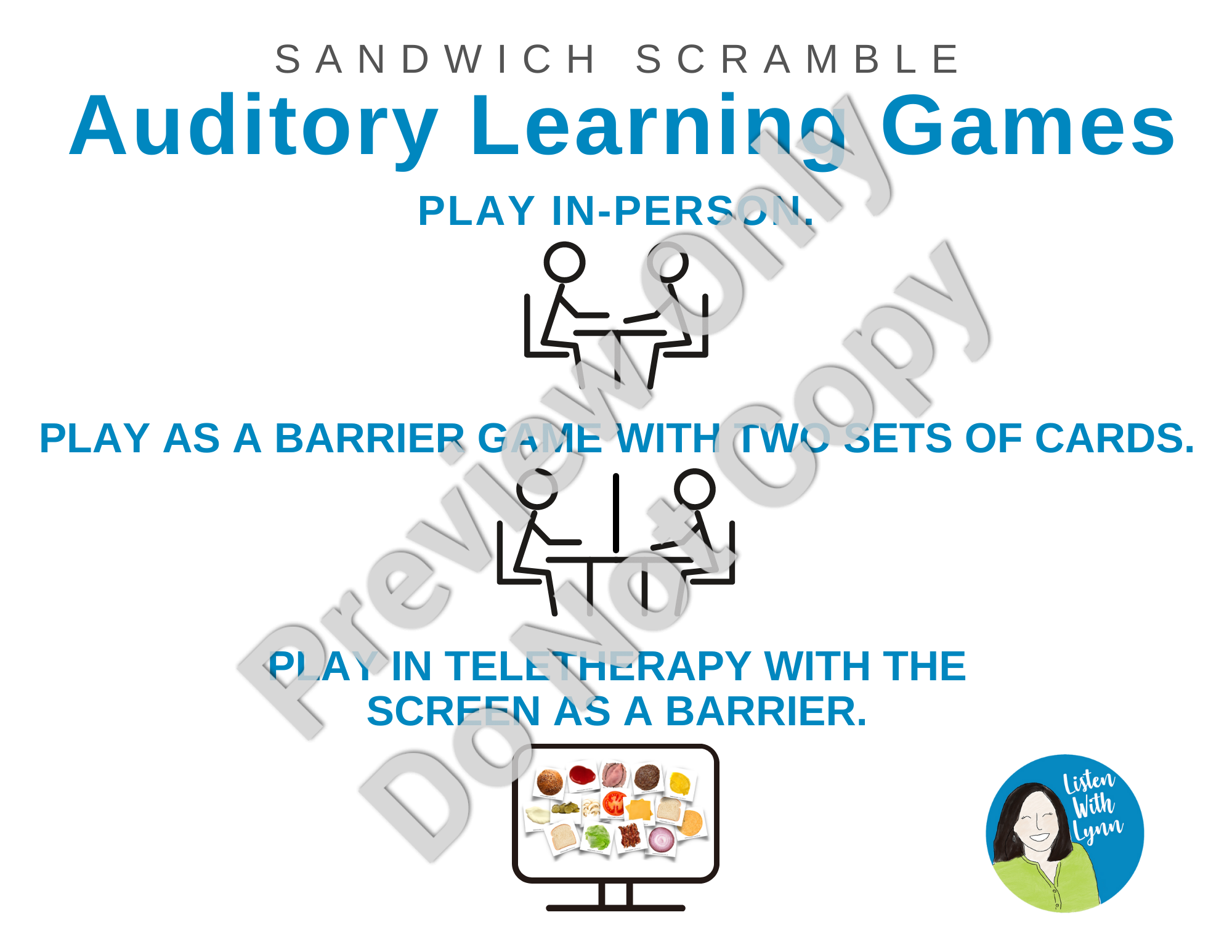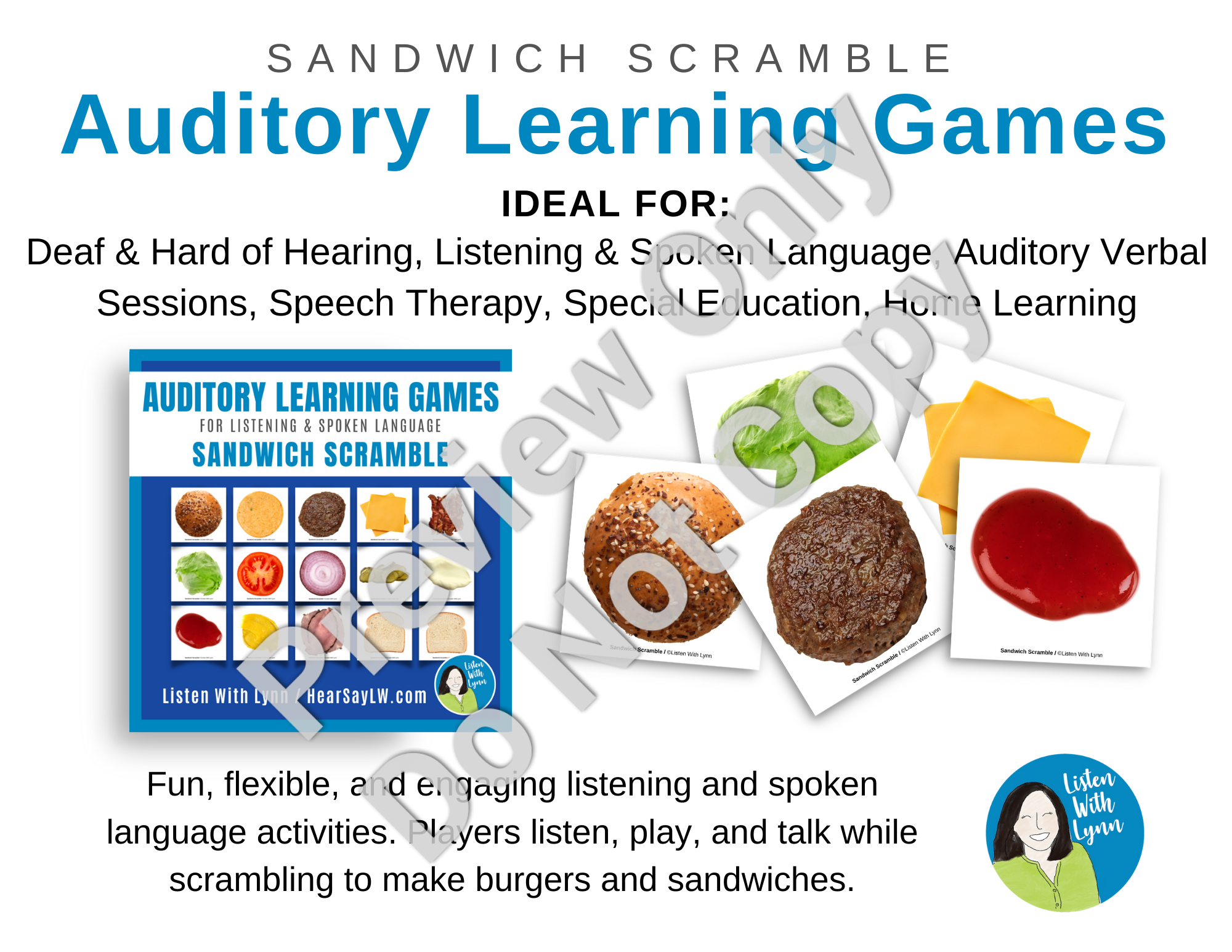 Shop NowSandwich Scramble is a fun, flexible, and engaging listening and spoken language resource. Players listen, play, and talk while scrambling to make burgers and sandwiches. It can be played again and again with many kids and goals across your whole caseload. It's easy for you with a one-time prep.