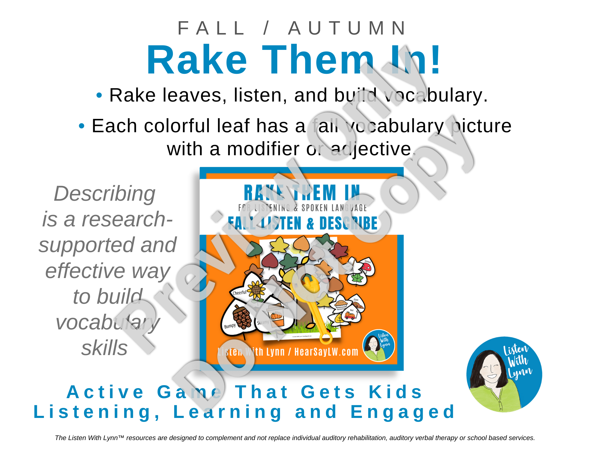 Children who are deaf and hard of hearing often struggle with vocabulary which is an integral part of learning. Describing is a research-supported and effective way to build vocabulary skills. Rake Them In can boost a child’s spoken language, communication, literacy, and academic skills.Â