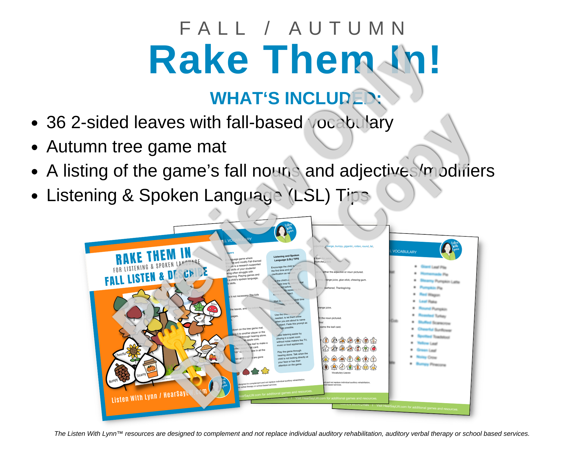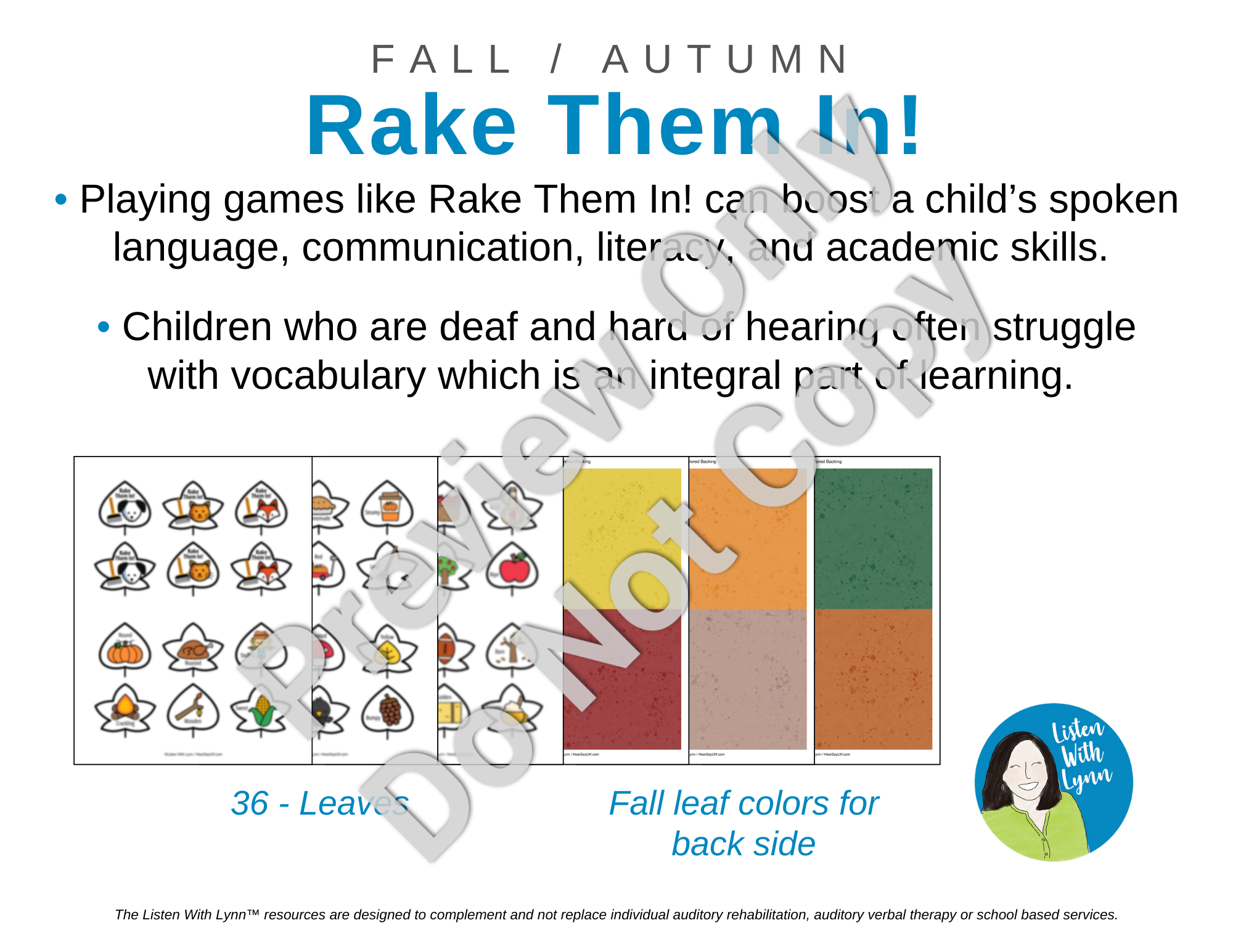 Rake Them In is a listening and spoken language game where children practice using adjectives to describe and modify fall-themed nouns. Each colorful leaf has a fall vocabulary picture and an adjective or a modifier. The child uses the modifier (sticky) to describe and make sentences about the picture (apple core). The Rake Them In cards get kids active, listening, learning, and engaged.