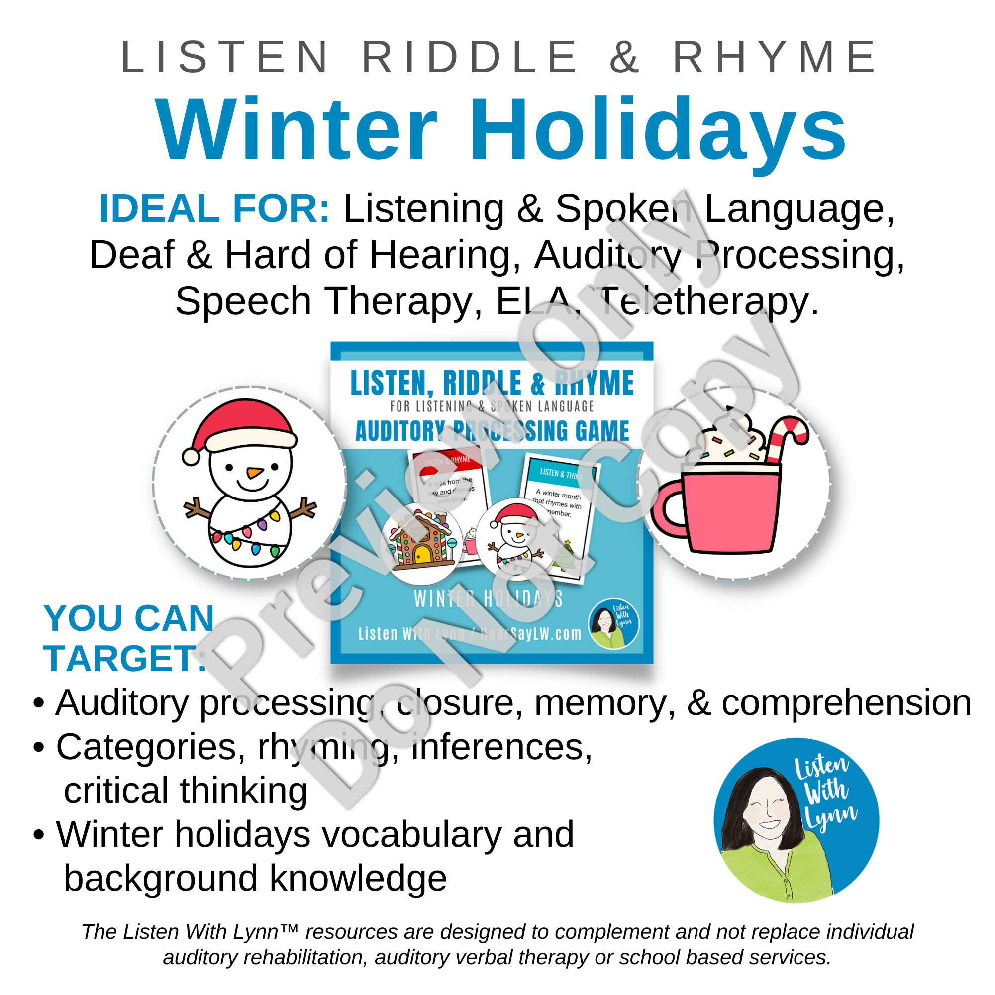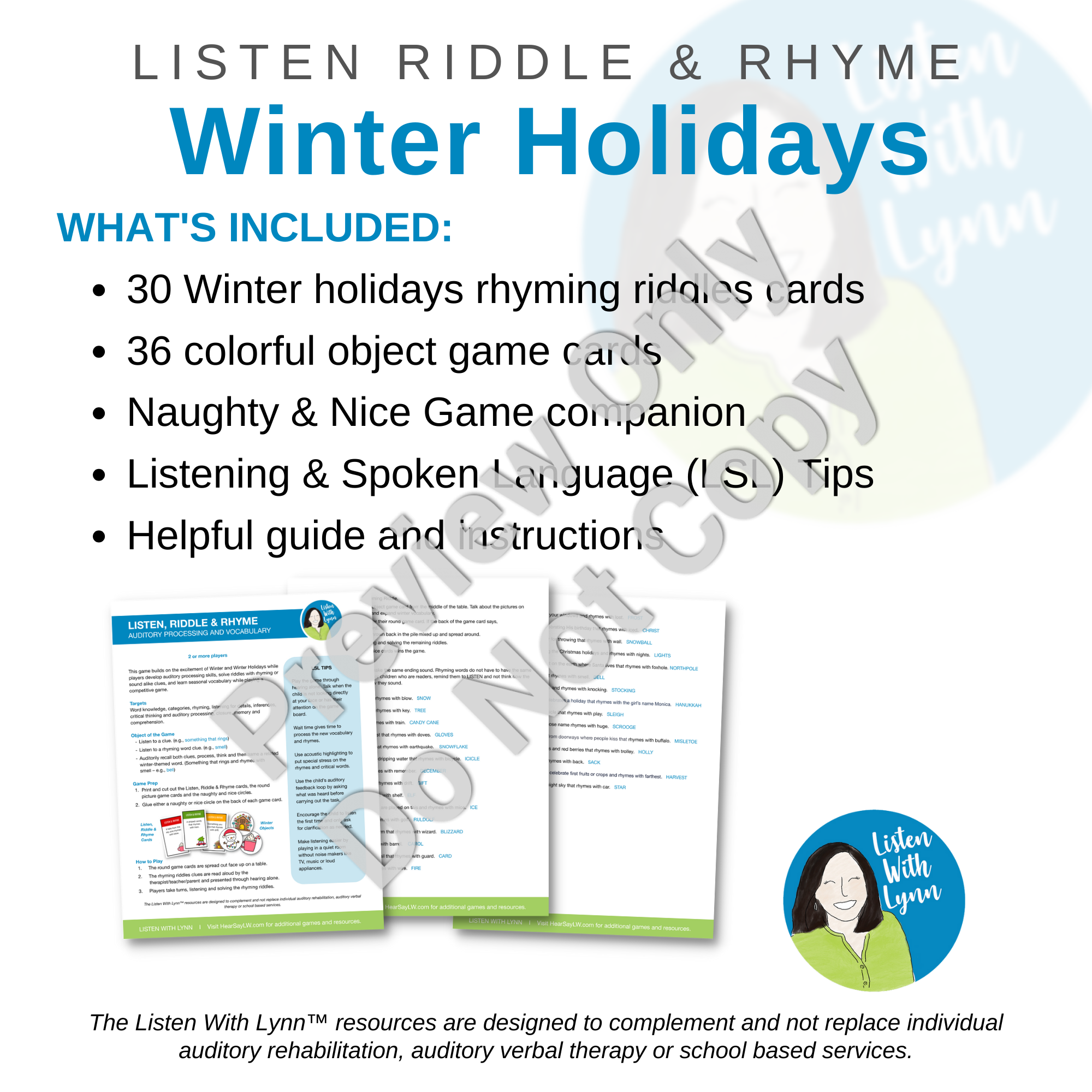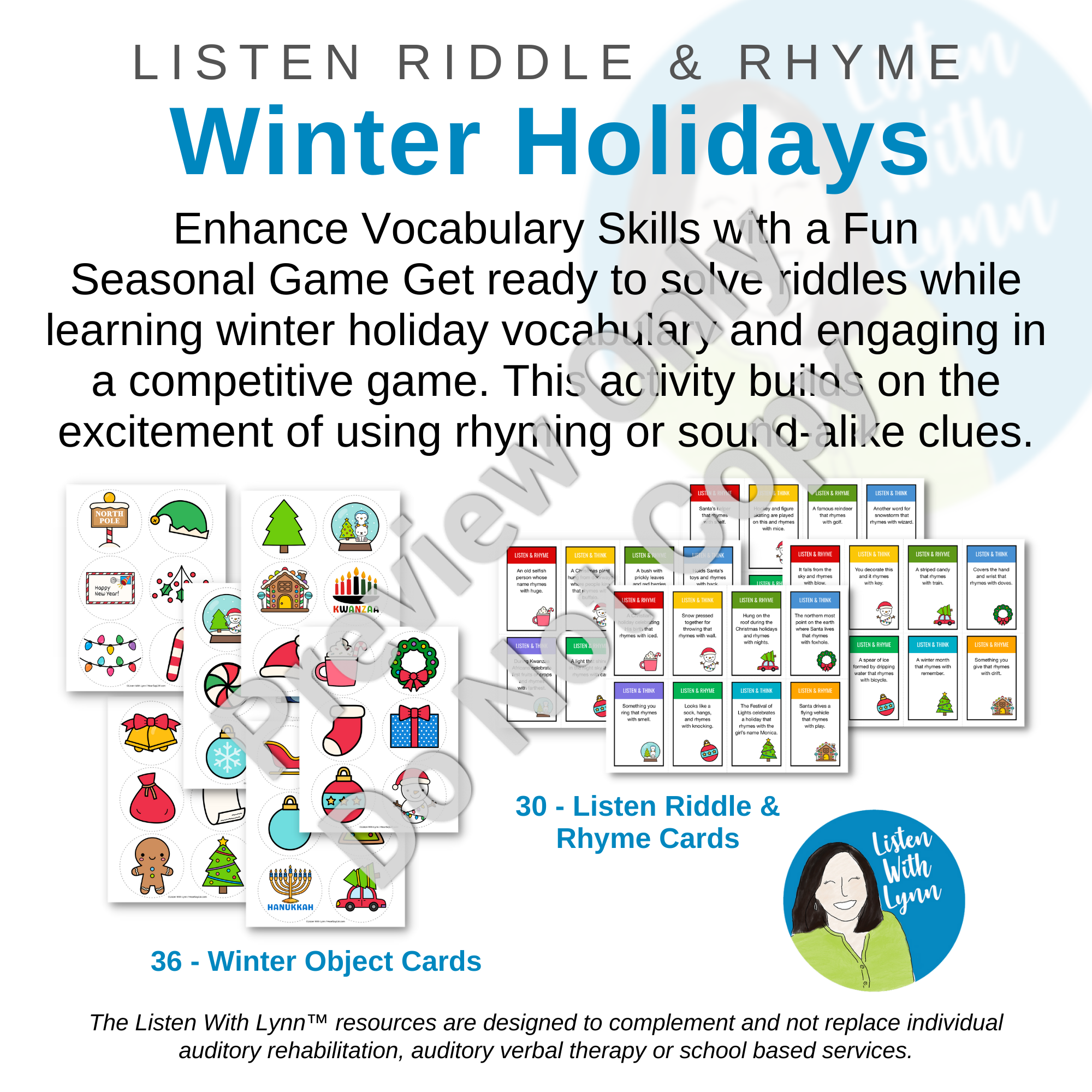 Shop NowThis game builds on the excitement of Winter and Winter Holidays while players develop auditory processing skills, solve riddles with rhyming or sound-alike clues, and learn seasonal vocabulary while playing a competitive game.