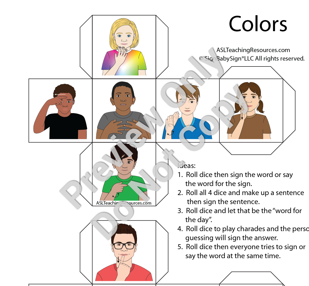Shop NowDiscover Colors Dice, an exciting educational game that combines learning sign language with fun gameplay! This downloadable and printable product is perfect for classrooms and homes, providing endless opportunities for creative learning. With optional modes in both English and Sign Language, players can customize their experience to suit their preferences. Dive into the world of color vocabulary while expanding your ASL skills colorfully and engagingly. Ideal for children and adults, Colors Dice is the perfect tool to enhance language learning. Whether you use the colored or black-and-white version, build color vocabulary while having a blast!