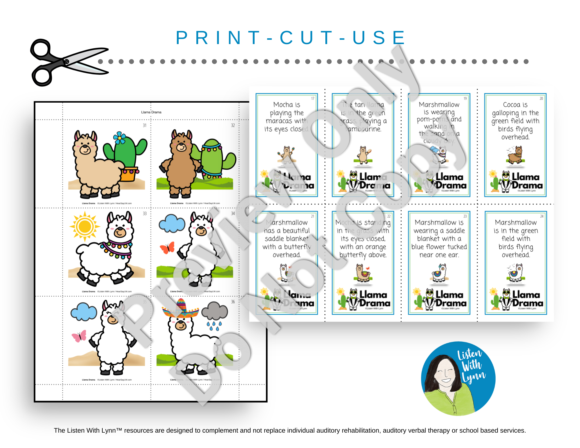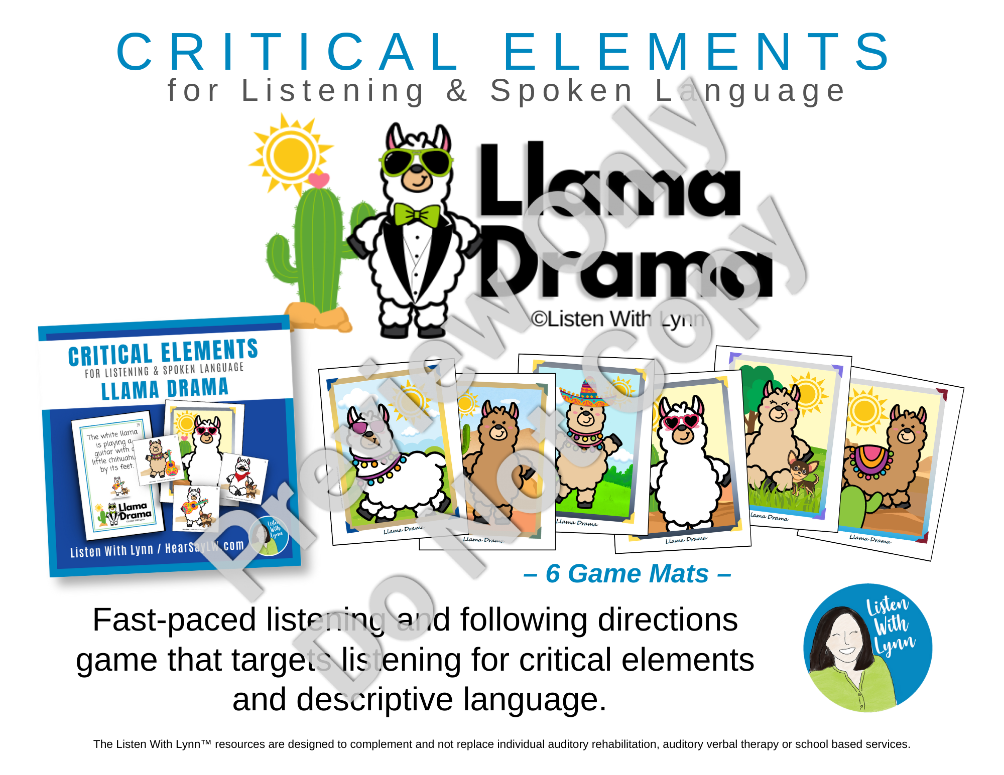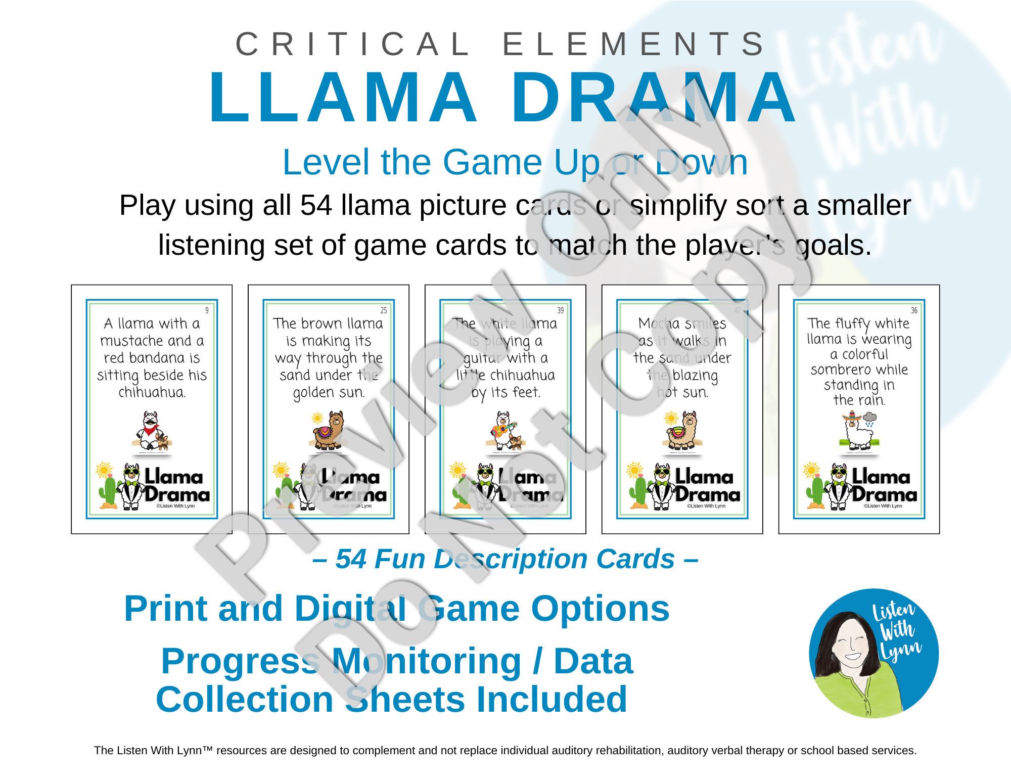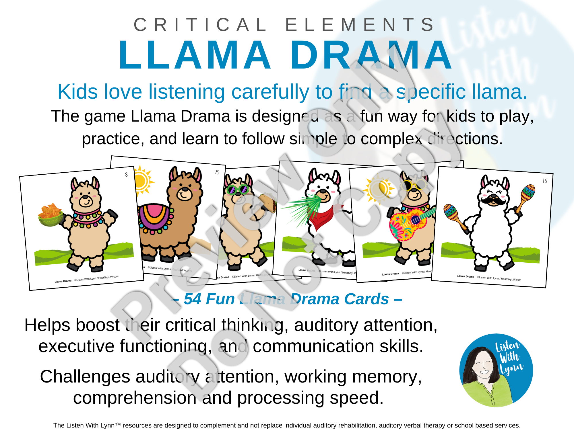 LLAMA DRAMA is an amusing following direction game with critical elements that get kids listening and engaged. Kids love the delightful llamas that challenge auditory working memory, comprehension, and auditory processing speed. The game uses descriptions that boost critical thinking, executive functioning, and communication skills.