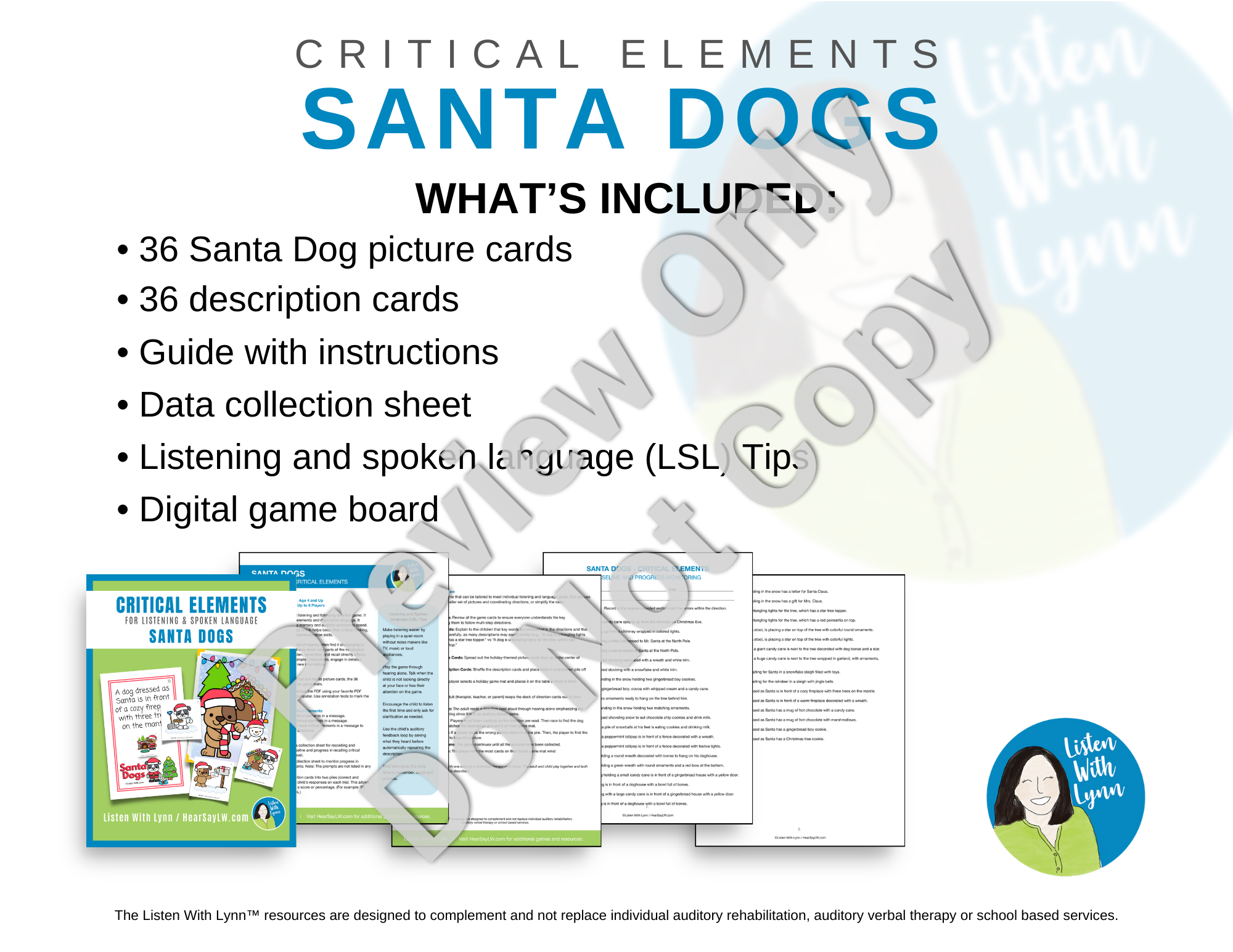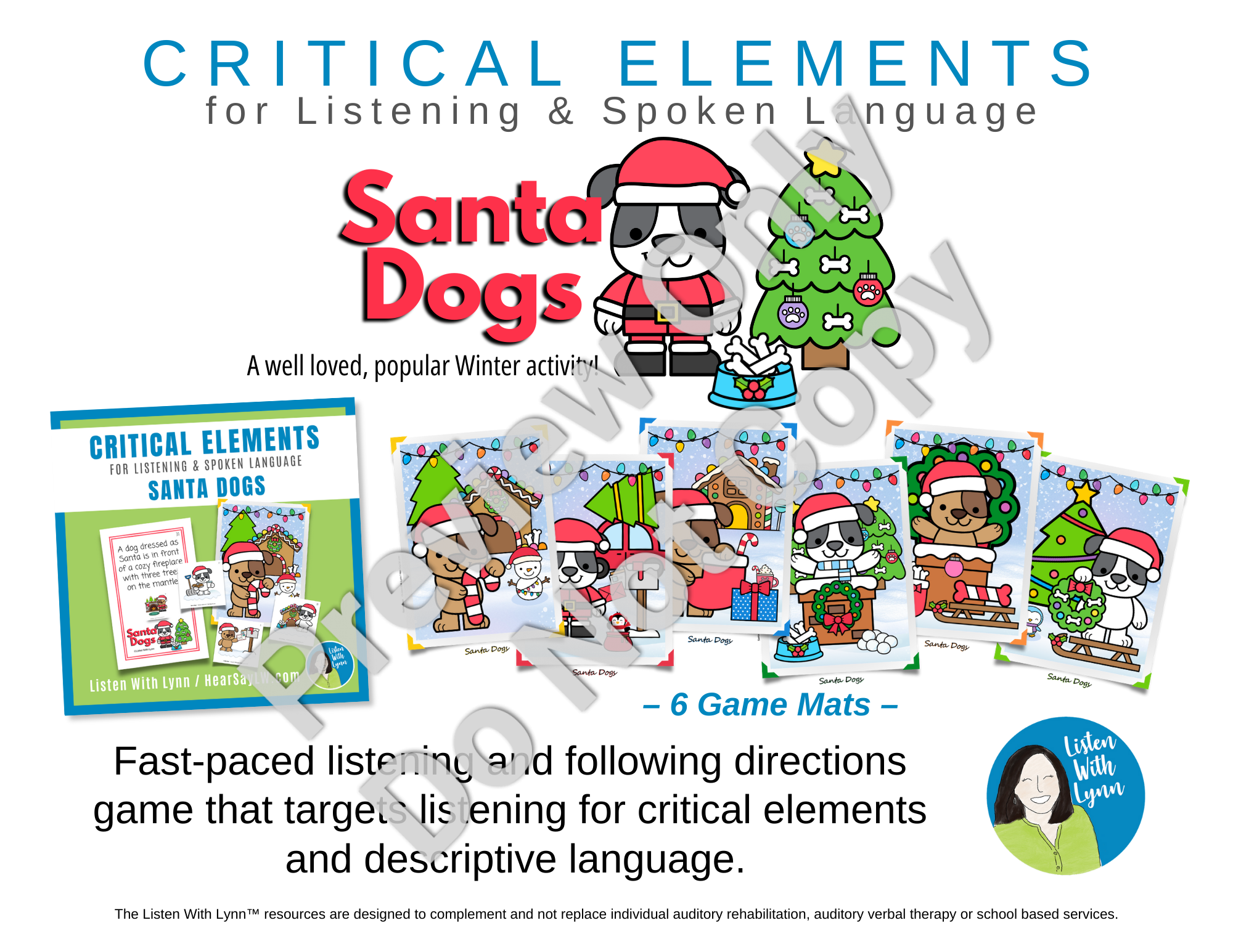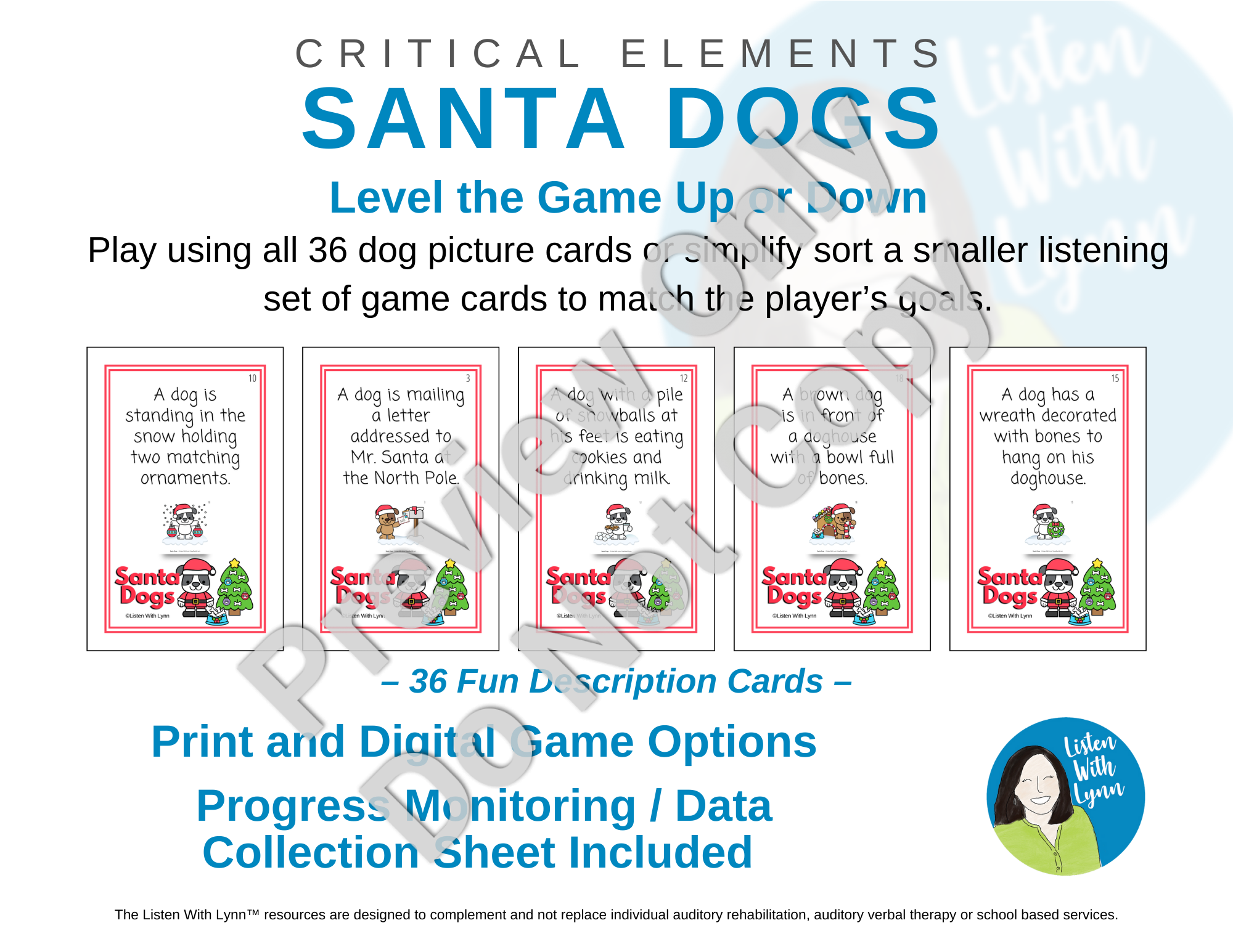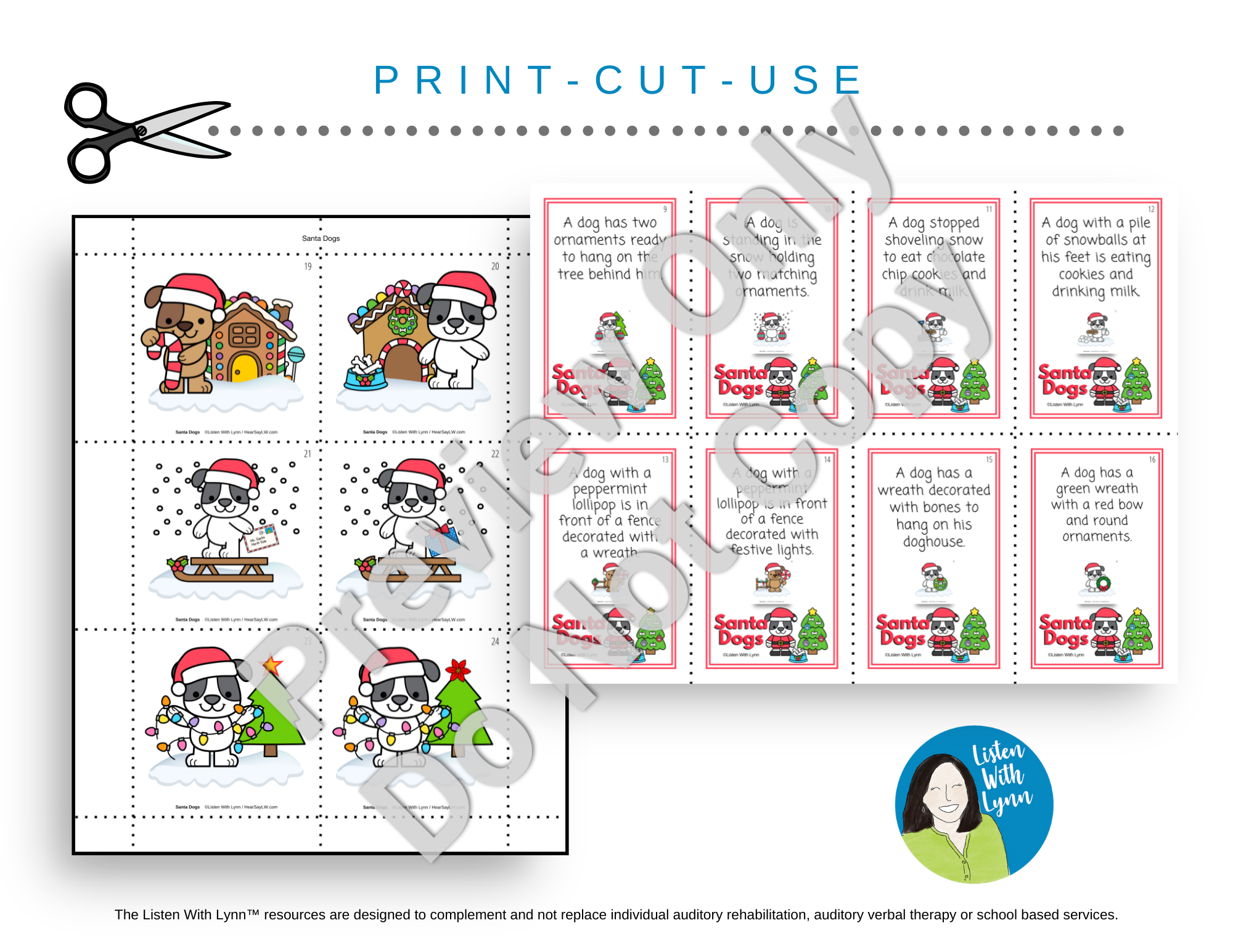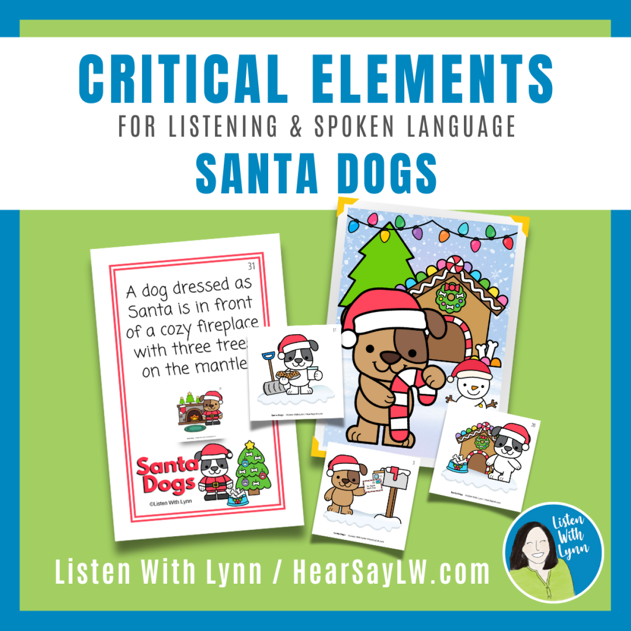 SANTA DOGS is effective for all children and outstanding for kids who are deaf and hard of hearing and who struggle to recall longer sentences or remember only part of the information that was said. A child’s capacity to listen, remember, and recall impacts their ability to follow complex instructions, understand detailed conversations, and learn new information.