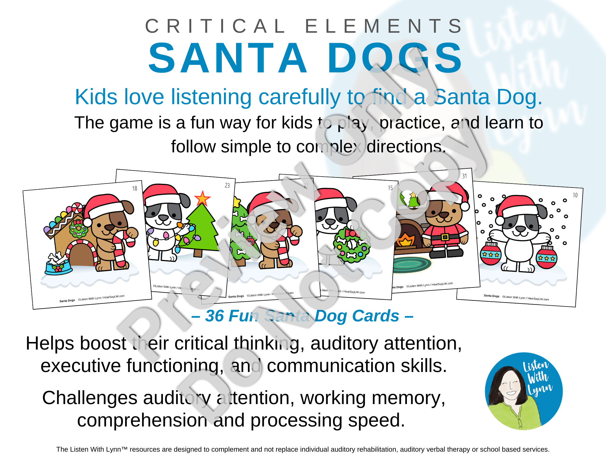 SANTA DOGS is an engaging following-direction game with critical elements that get kids listening and engaged. Kids love the delightful dogs in costumes that challenge auditory working memory, comprehension, and auditory processing speed. The game uses descriptions that boost critical thinking, executive functioning, and communication skills.
