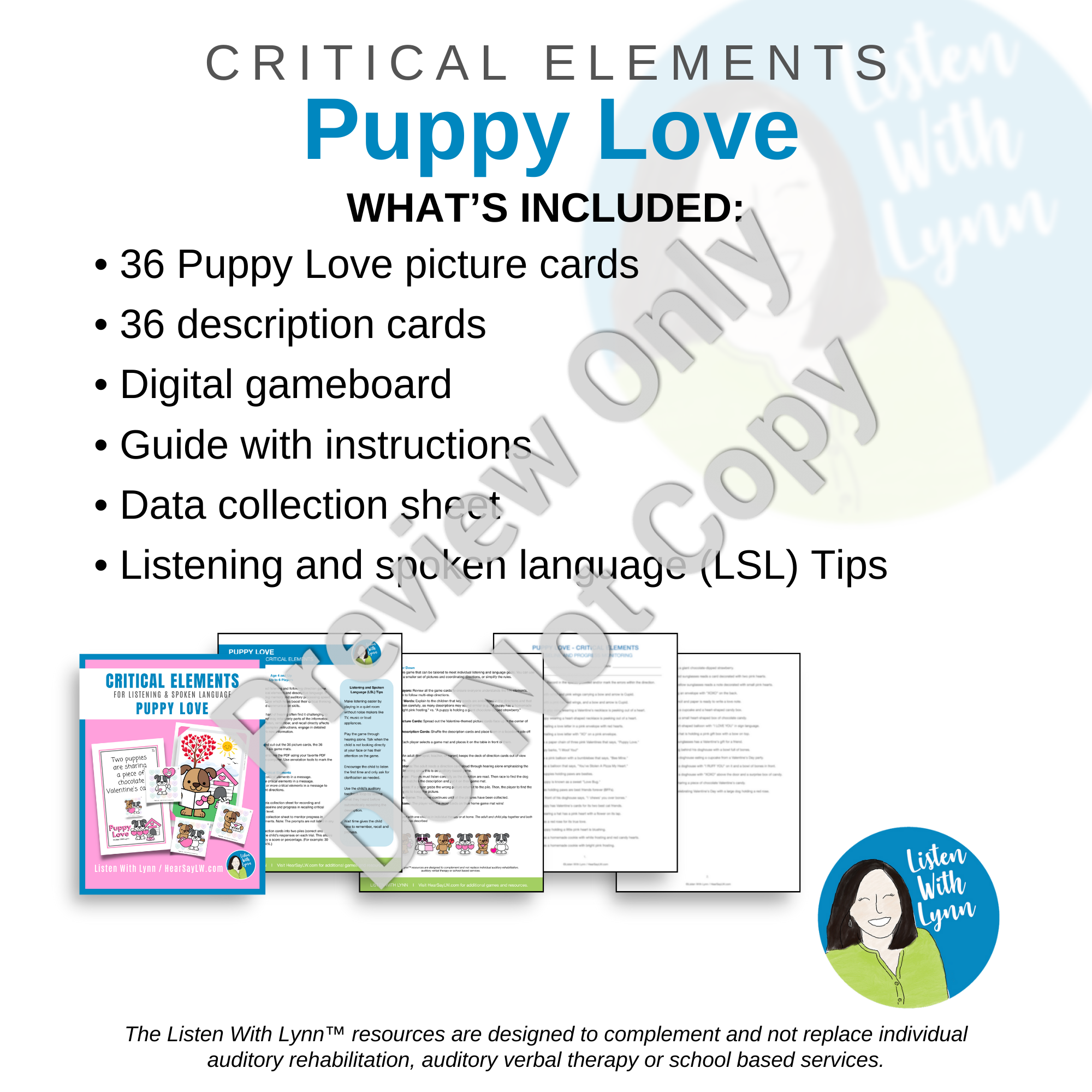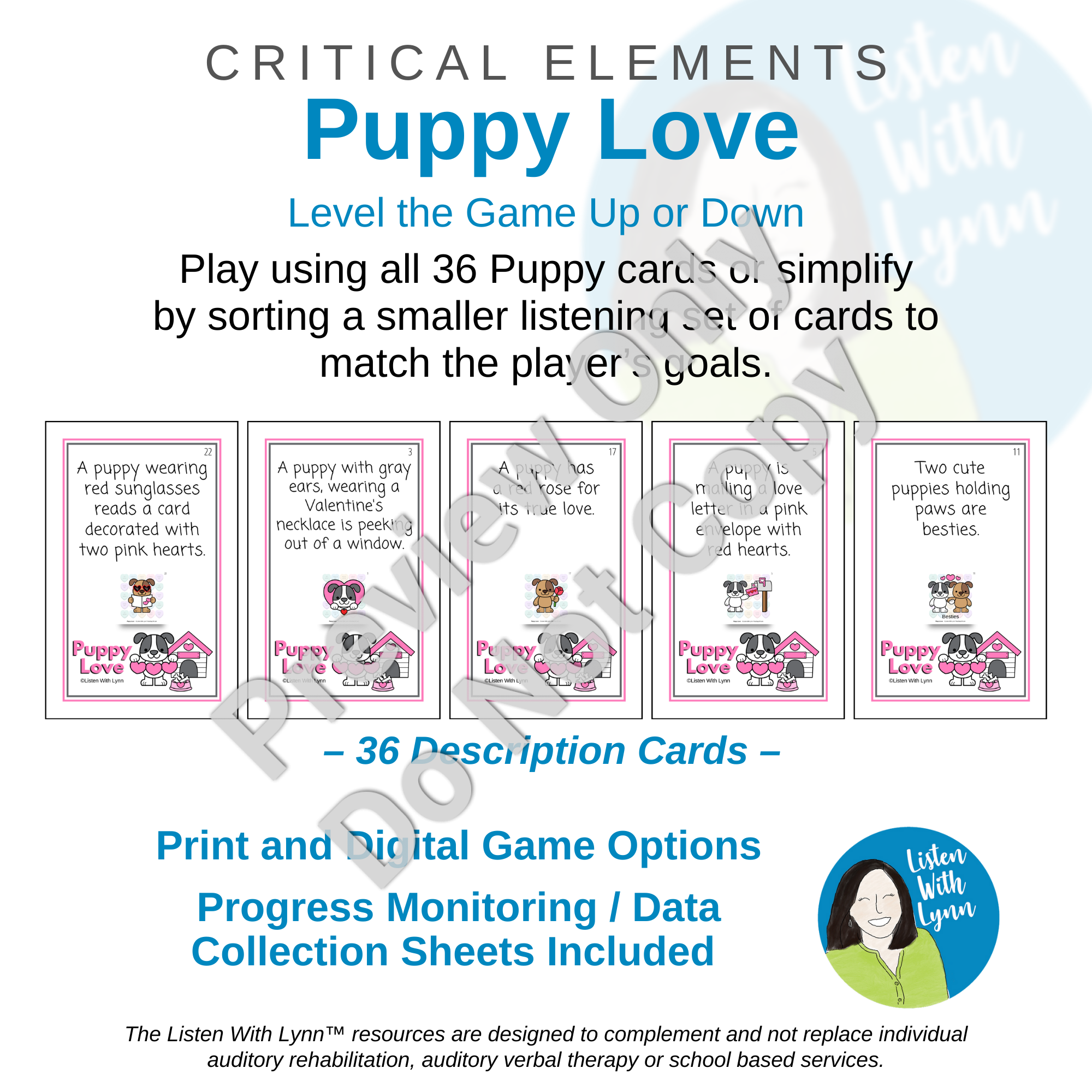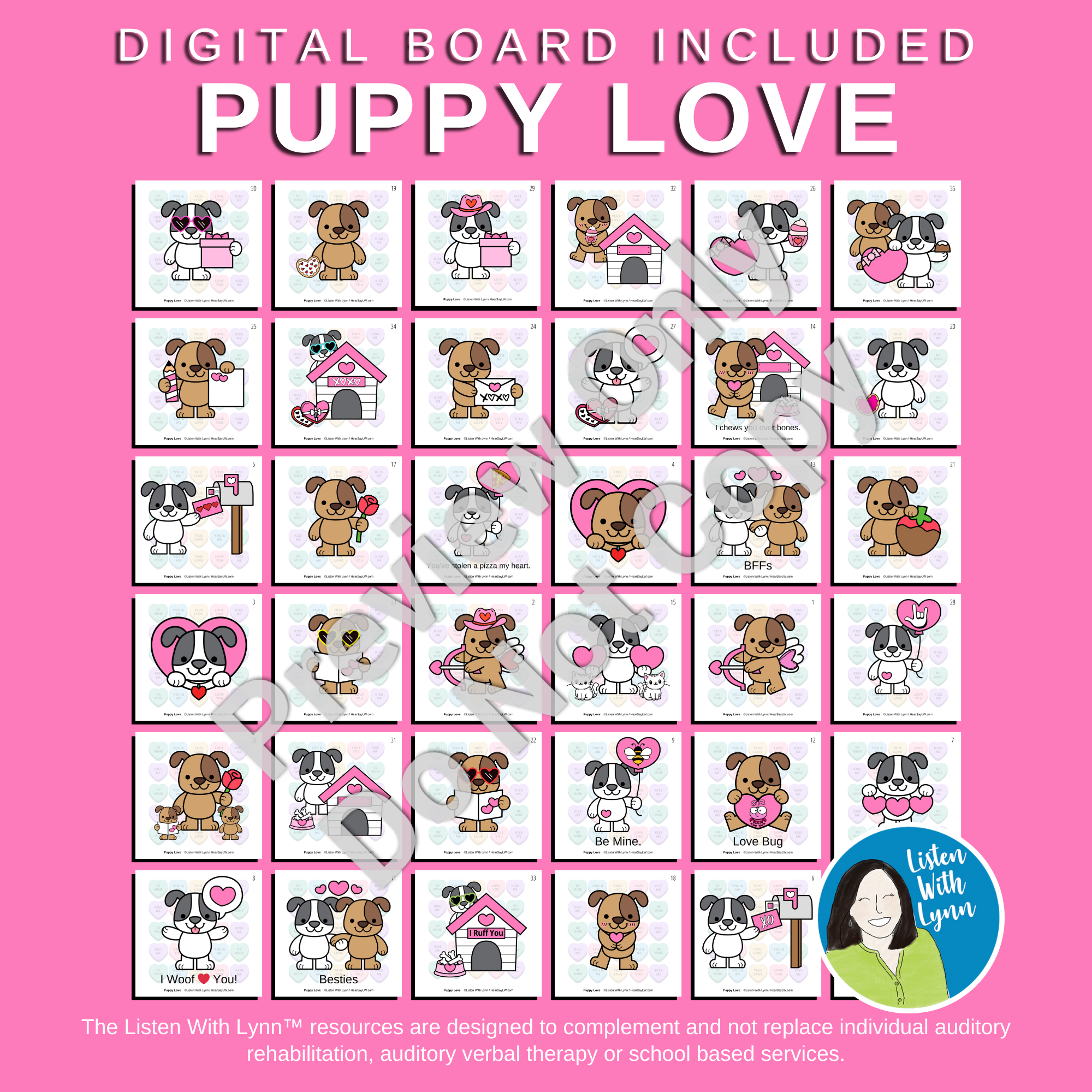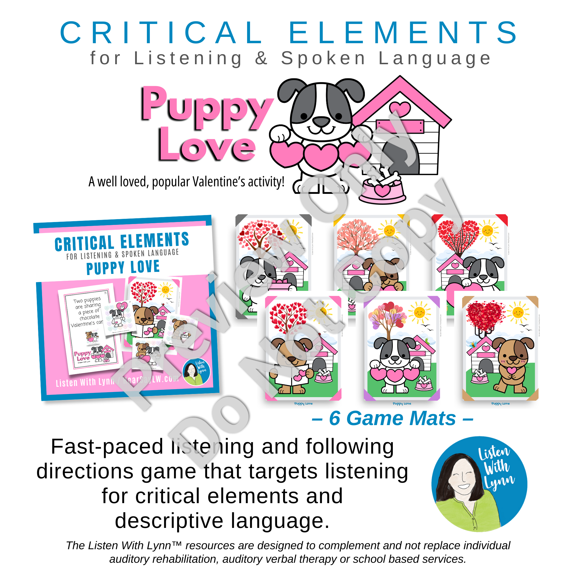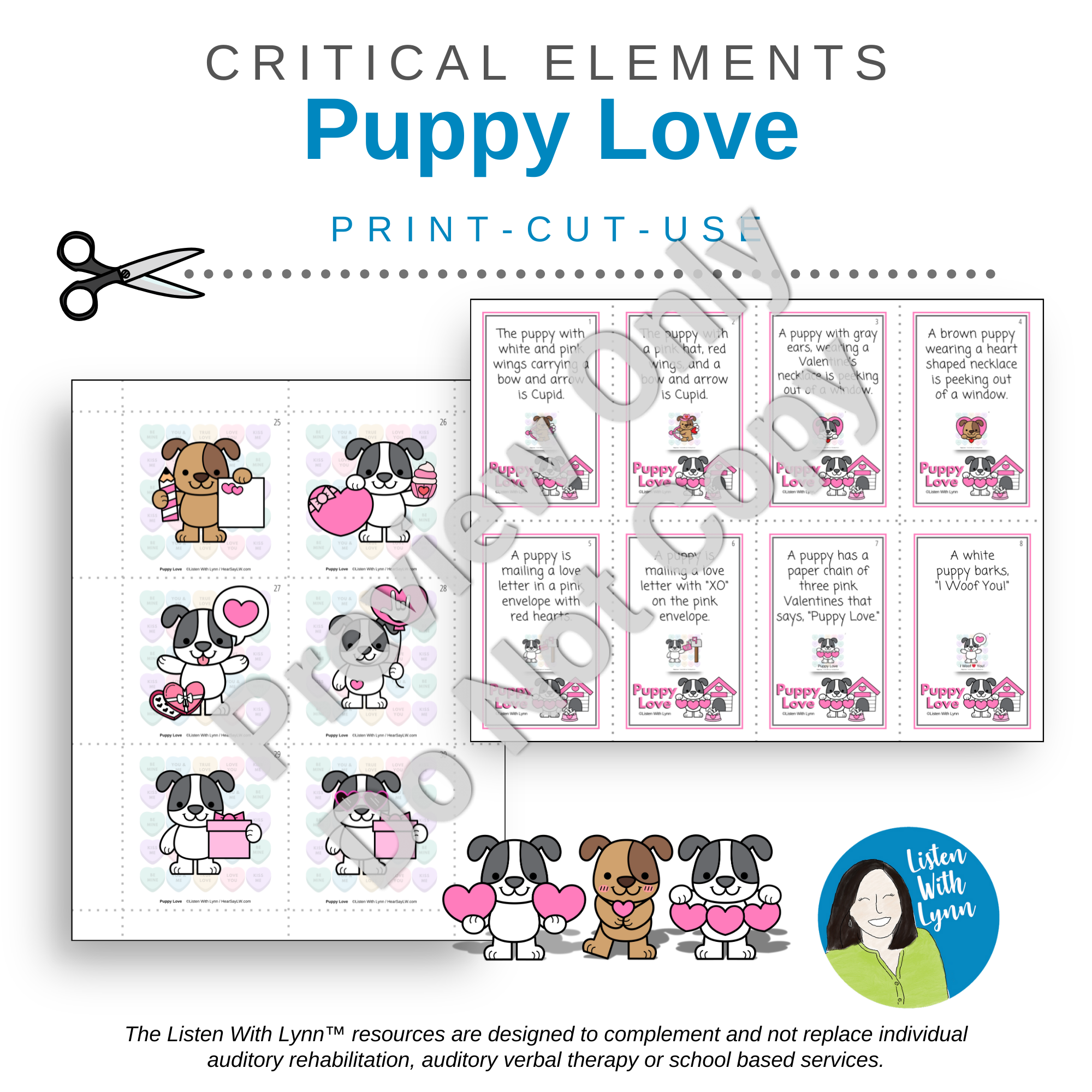 VALENTINE DOGS - PUPPY LOVE is an engaging following-direction game with critical elements that get kids listening and engaged. Kids love the loveable puppies that challenge auditory working memory, comprehension, and auditory processing speed. The game uses descriptions that boost critical thinking, executive functioning, and communication skills.