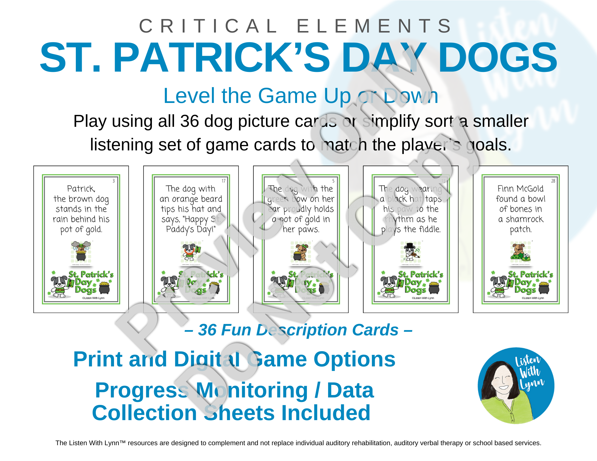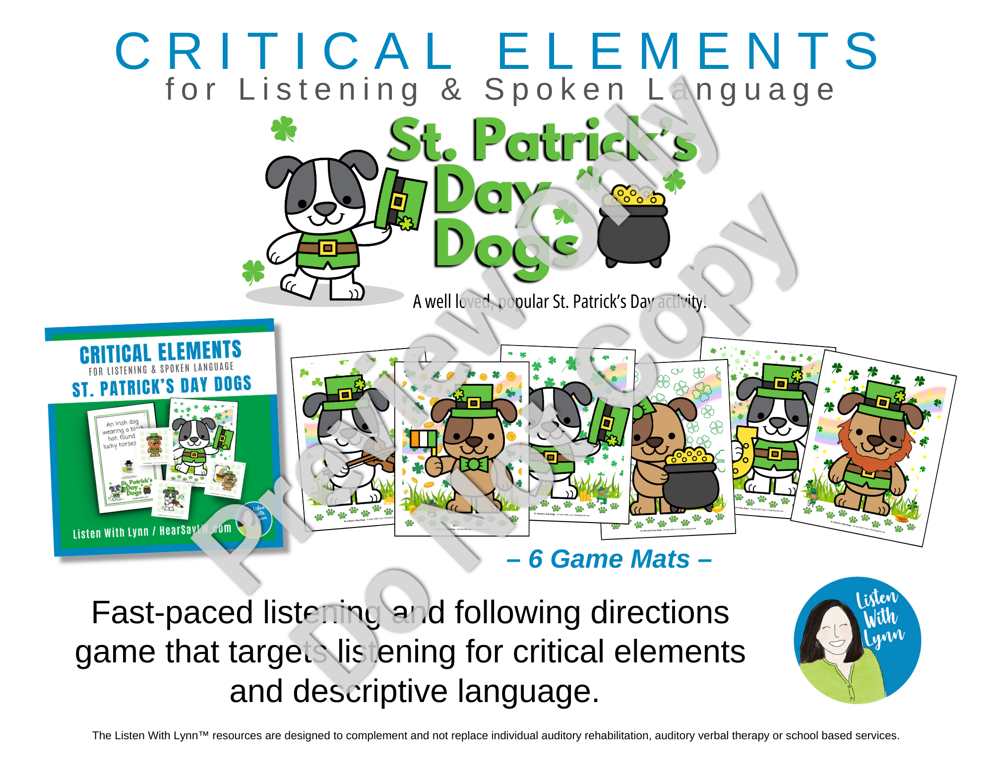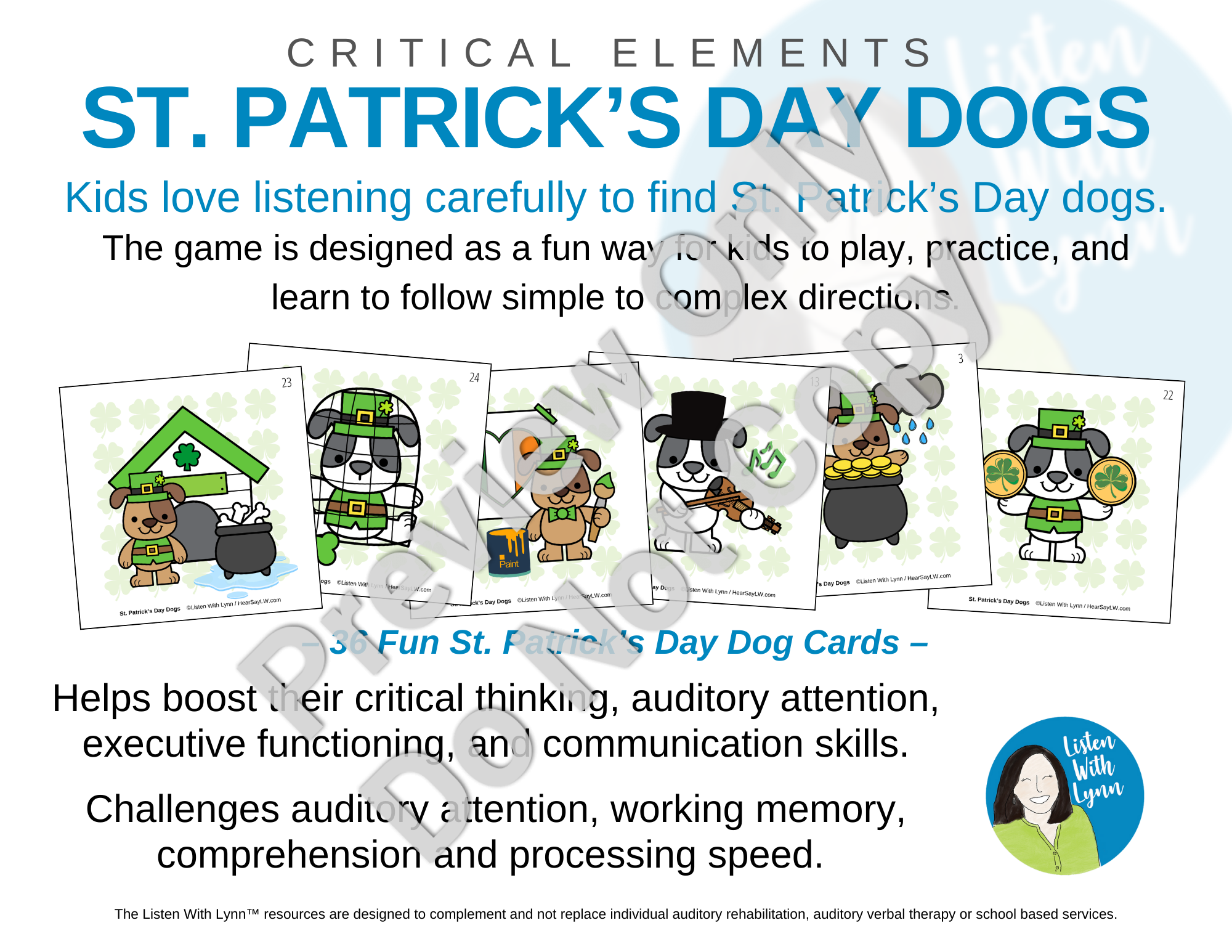 ST. PATRICK'S DAY DOGS is an engaging following-direction game with critical elements that get kids listening and engaged. Kids love the delightful dogs that challenge auditory working memory, comprehension, and auditory processing speed. The game uses descriptions that boost critical thinking, executive functioning, and communication skills.