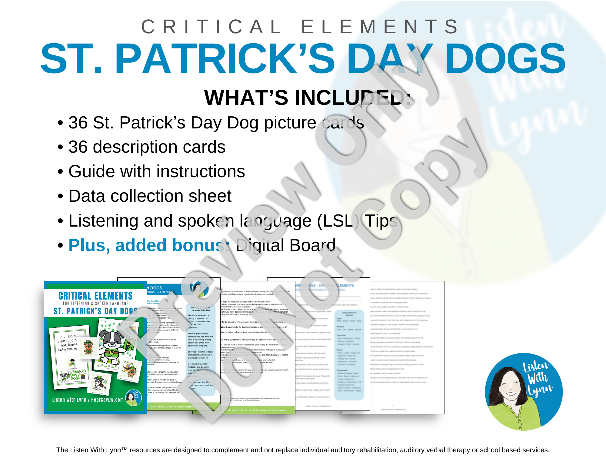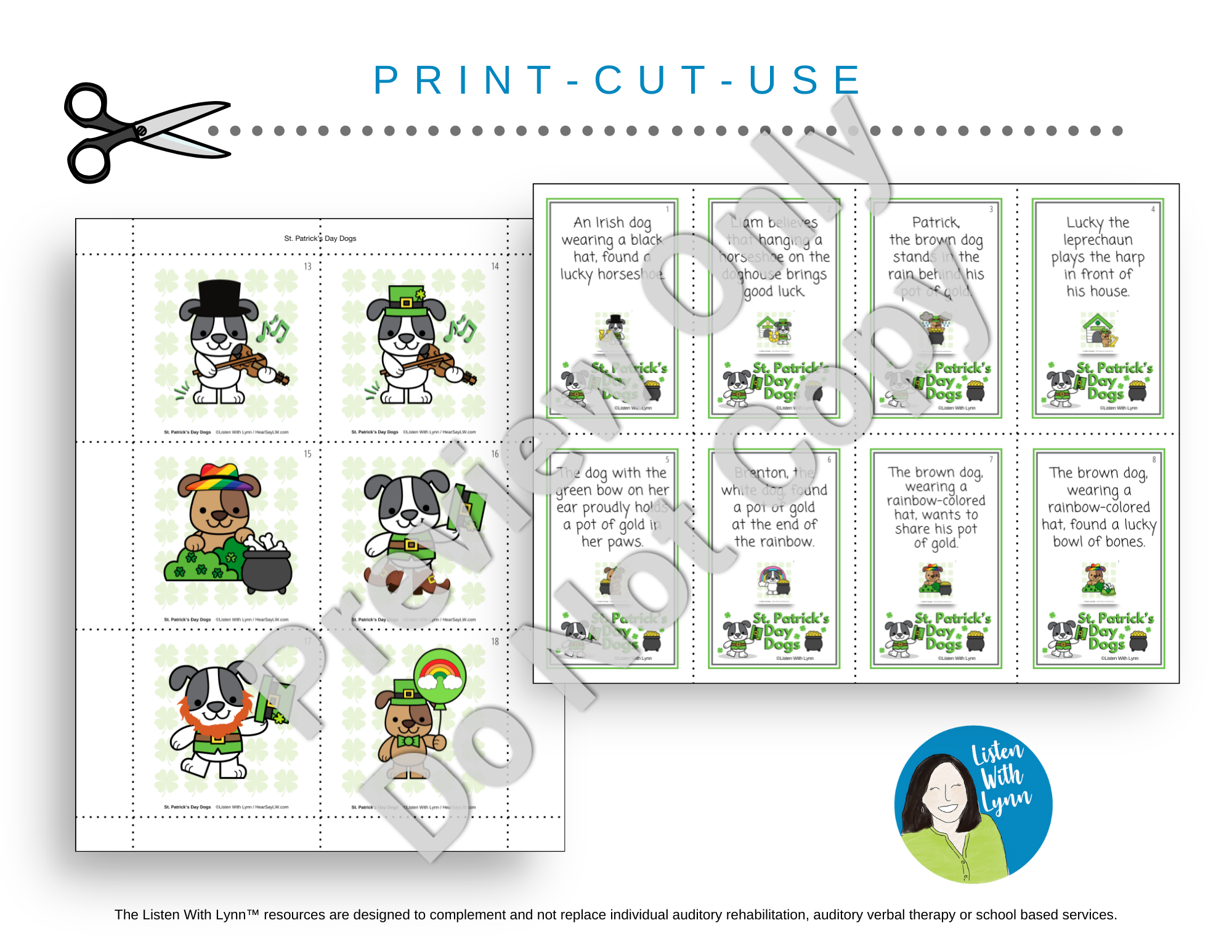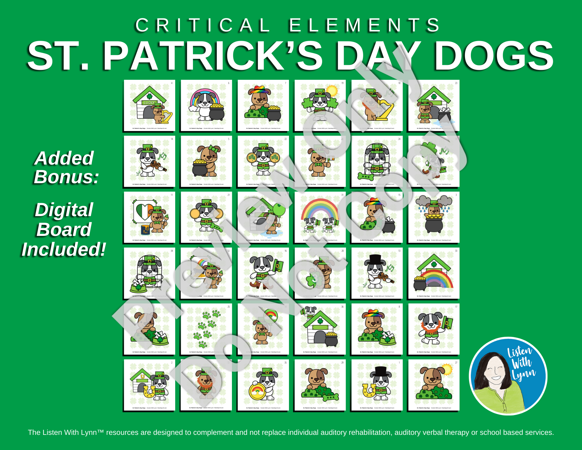 ST. PATRICK'S DAY DOGS is effective for all children and outstanding for kids who are deaf and hard of hearing and who struggle to recall longer sentences or remember only part of the information that was said. A child’s capacity to listen, remember, and recall impacts their ability to follow complex instructions, understand detailed conversations, and learn new information.