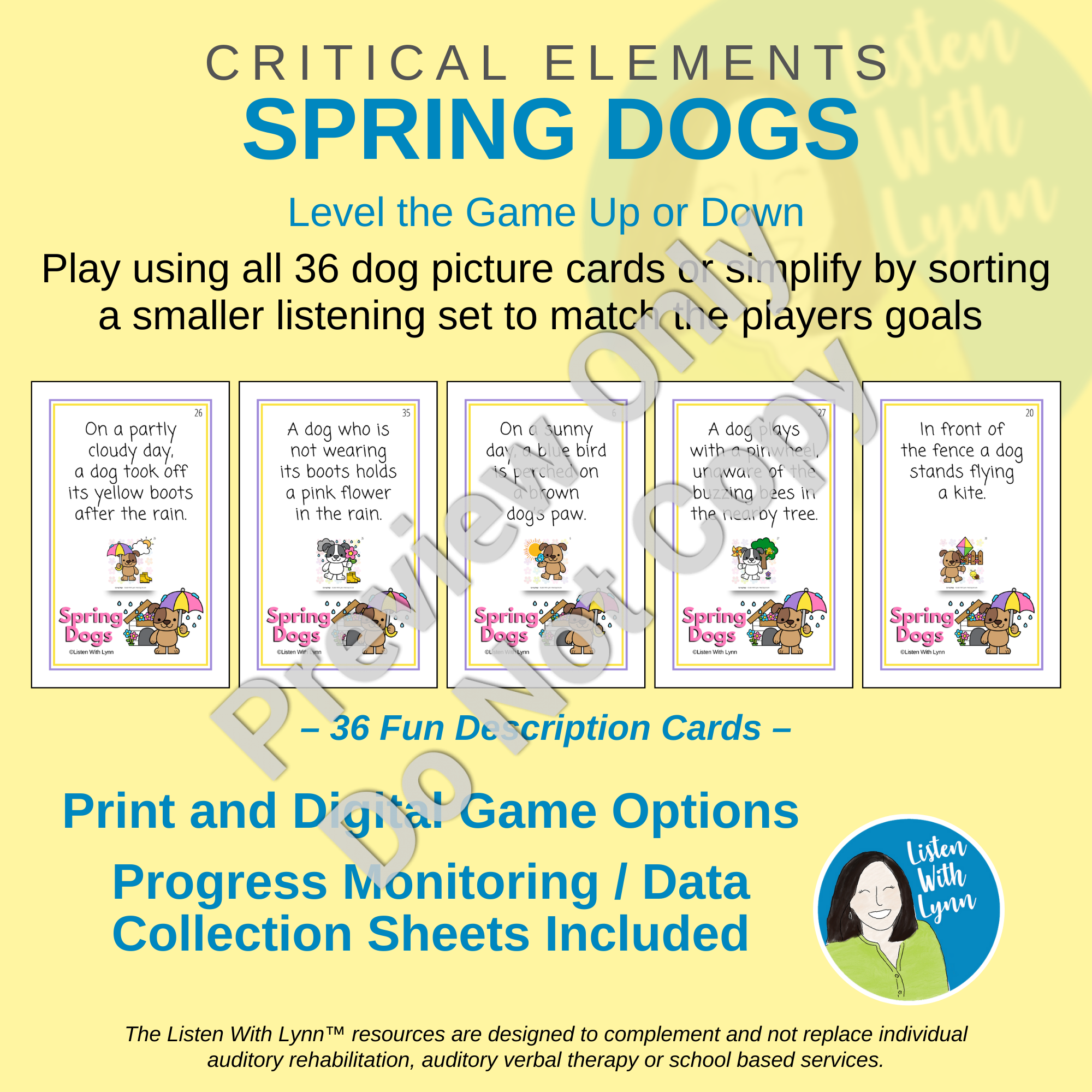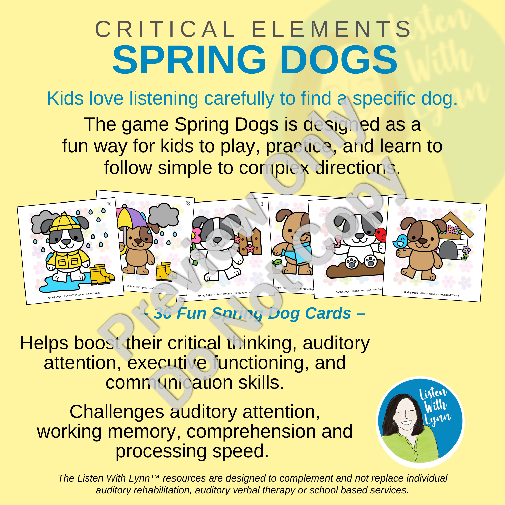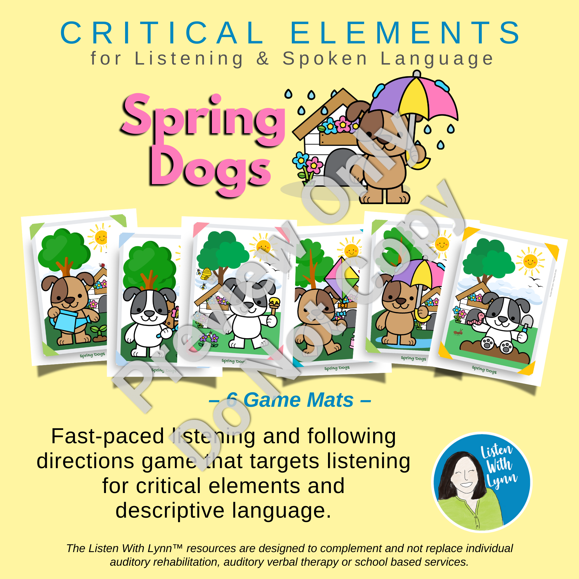 SPRING DOGS is an engaging following-direction springtime game with critical elements that get kids listening and engaged. Kids love the delightful dogs that challenge auditory working memory, comprehension, and auditory processing speed. The game uses descriptions that boost critical thinking, executive functioning, and communication skills.