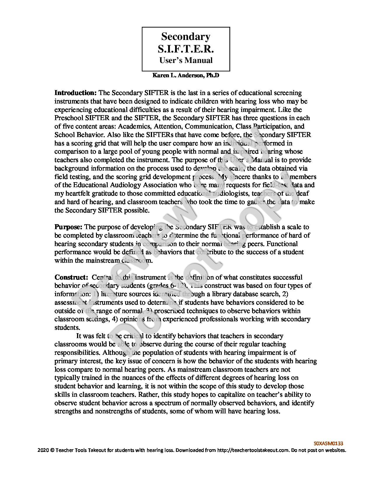 The Screening Instrument For Targeting Educational Risk (SIFTER) was created as a tool to screen the functional performance of students with hearing loss in preschool in preschool, elementary and secondary school and includes a scoring grid to identify areas of concern. This User Manual focuses on secondary students and will explain the background, development, validity, effectiveness and reliability of the SIFTER.