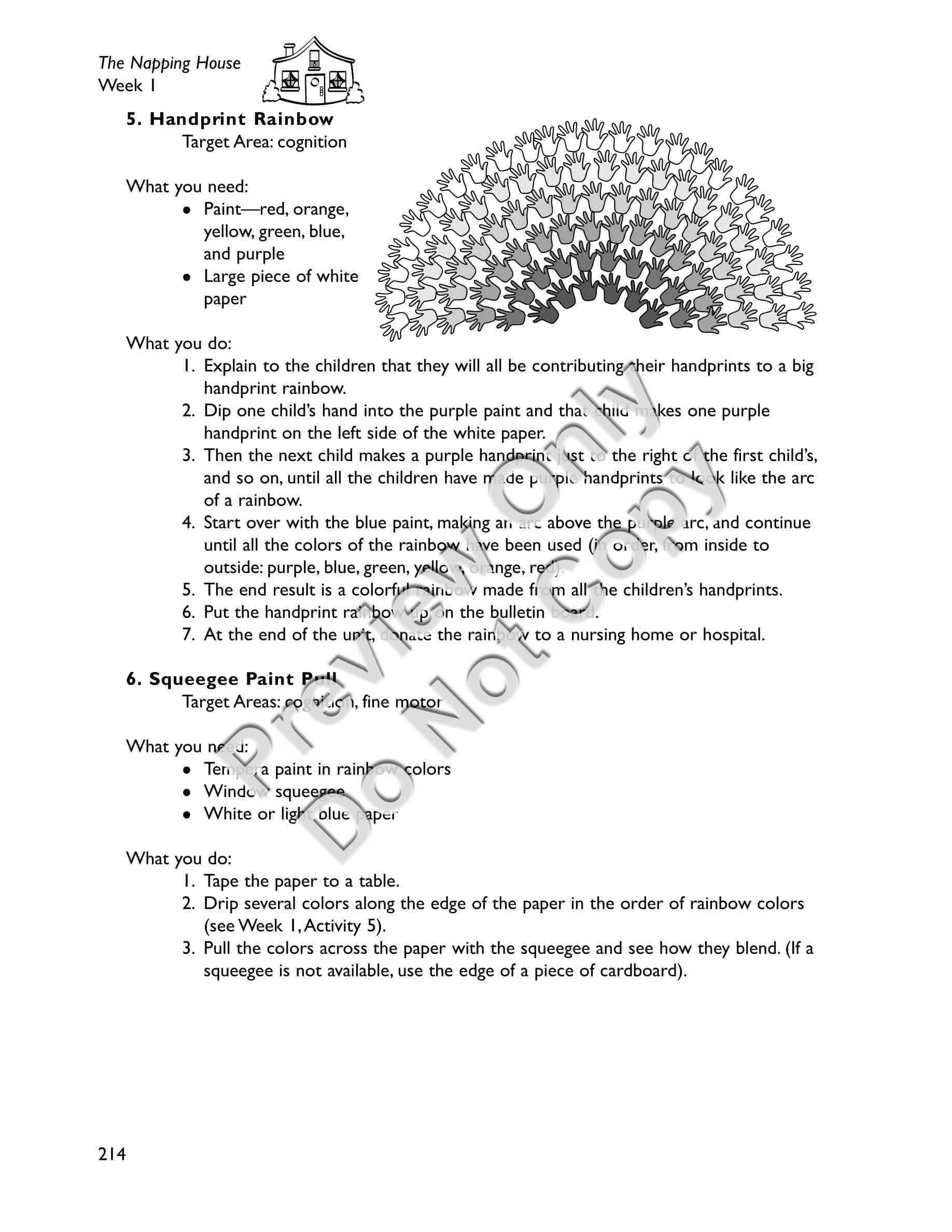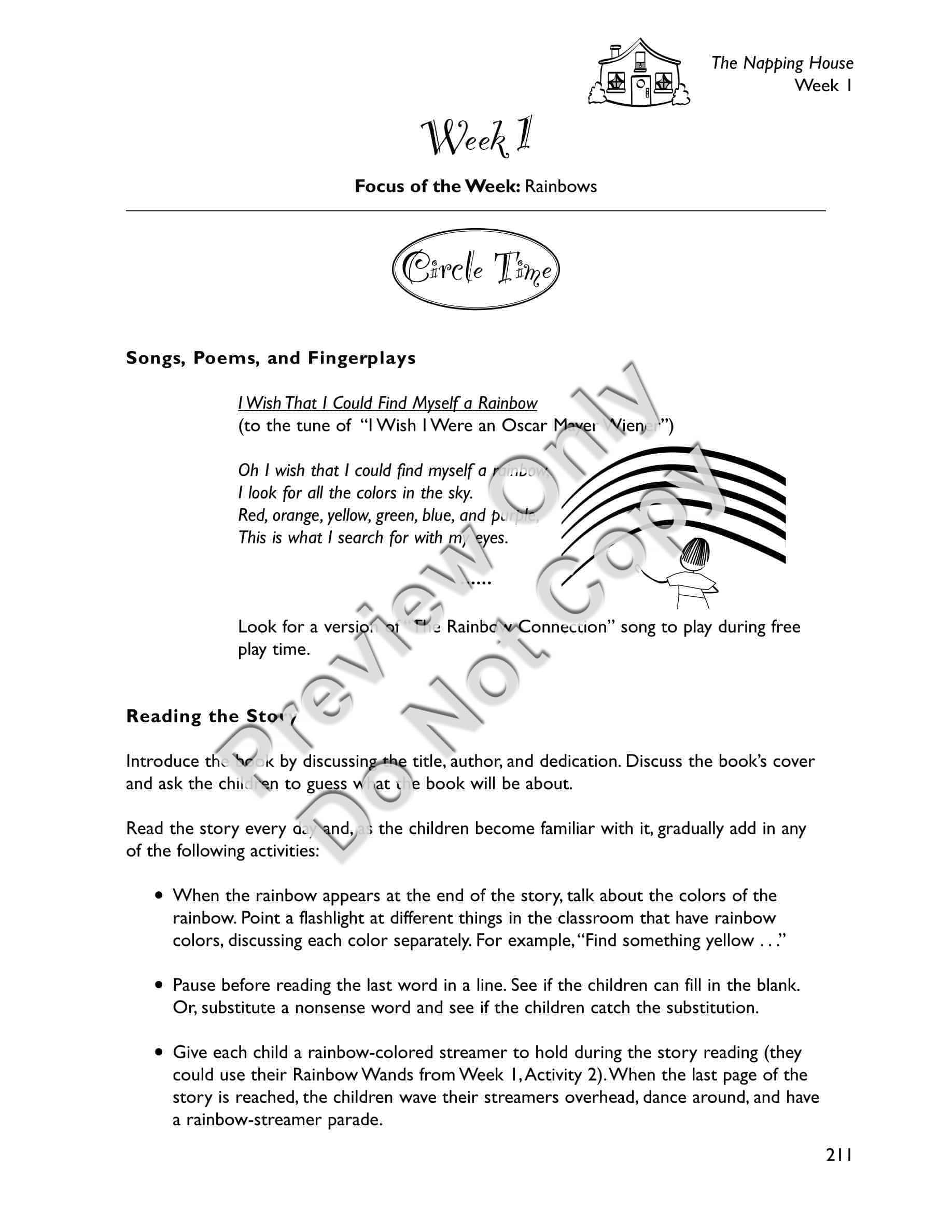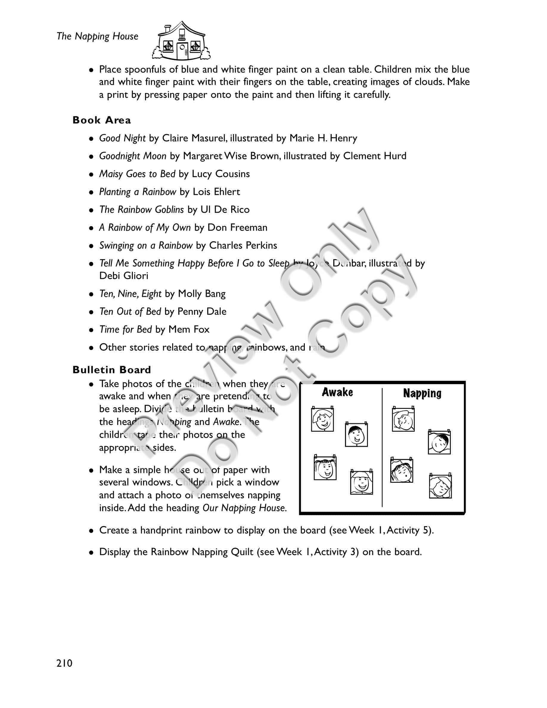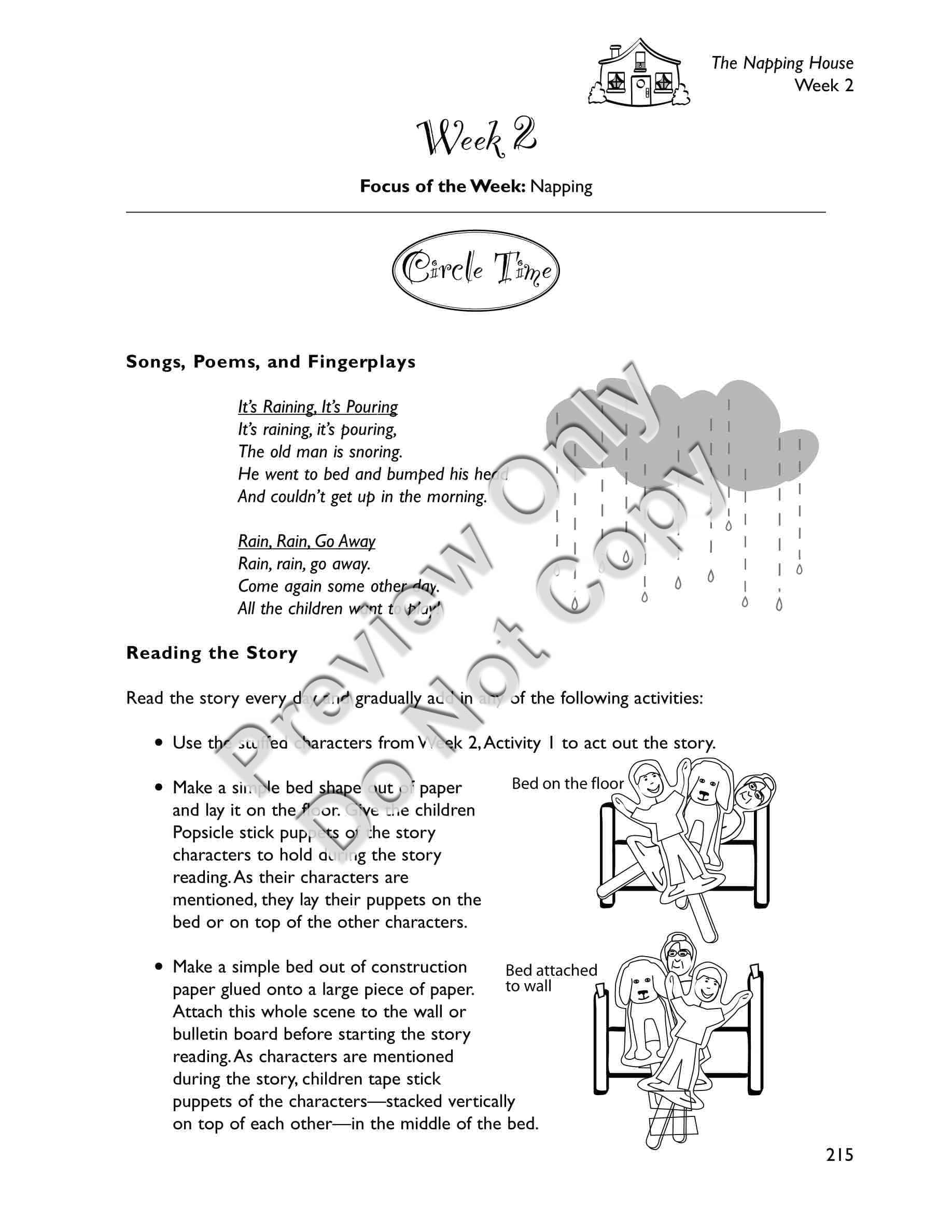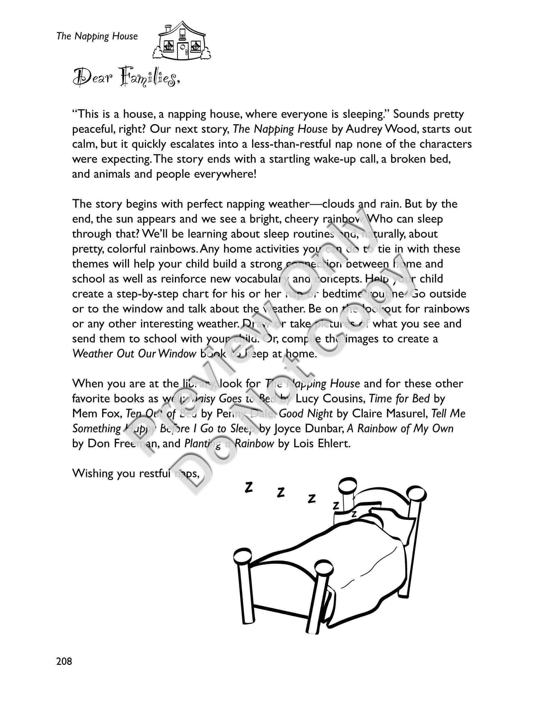The Napping House - Early Childhood / Preschool teaching materials for the book includes a) a synopsis of the storybook b) a letter to send home to families explaining the storybook unit and activities they can do at home c) suggestions for setting up your classroom to revolve around the story (dramatic play area, sensory area, art area, science area, book area, and bulletin board) d) activities separated into two weeks, each week including: a distinctive thematic, e) focus of the Week; Circle Time activities including songs, poems, fingerplays, and story-reading ideas; and six detailed Group Activities with designated target areas, f) snacks related to the story, g) a Pretest and Posttest