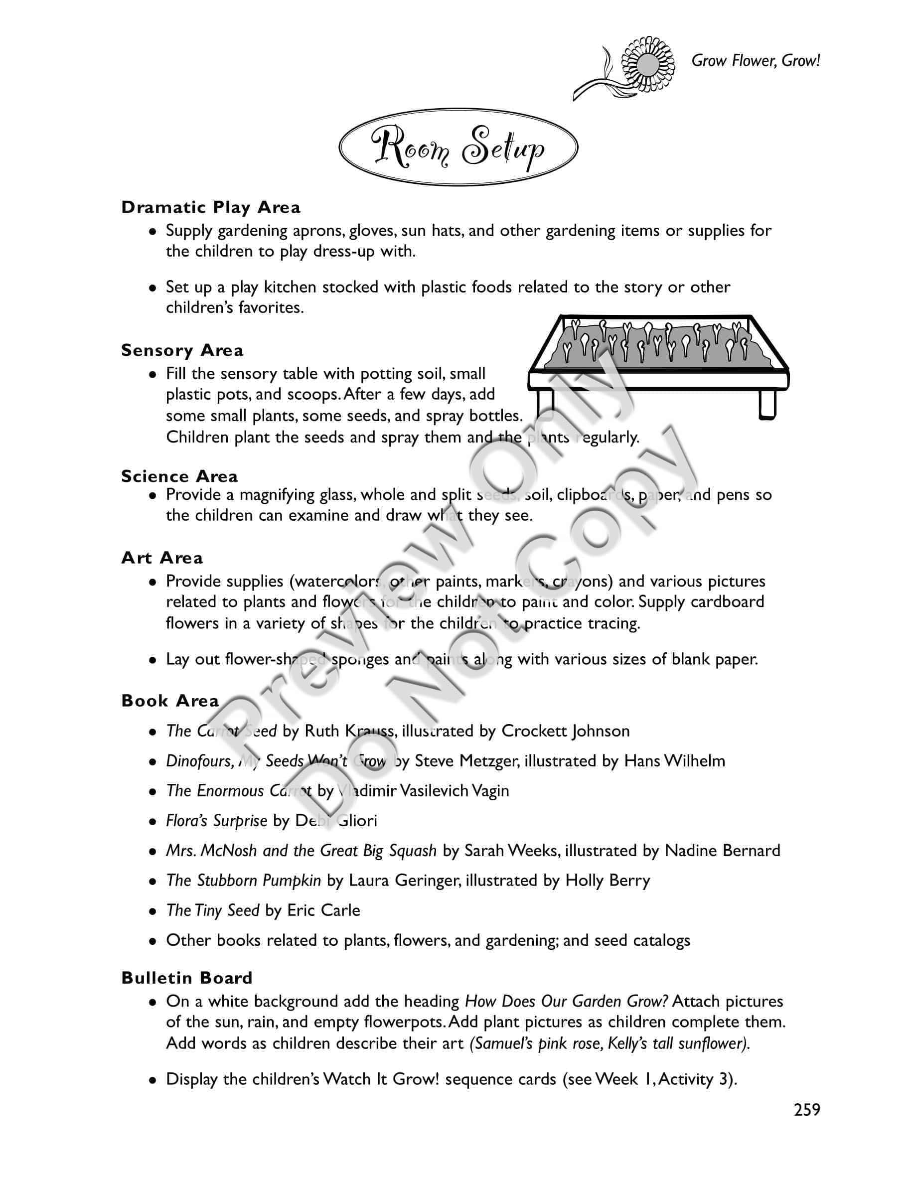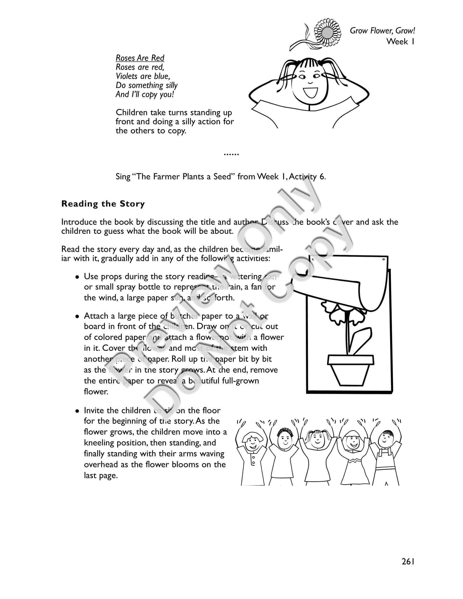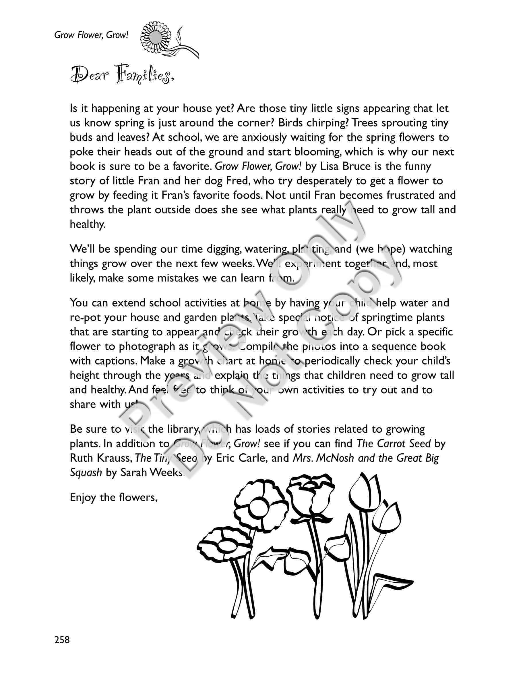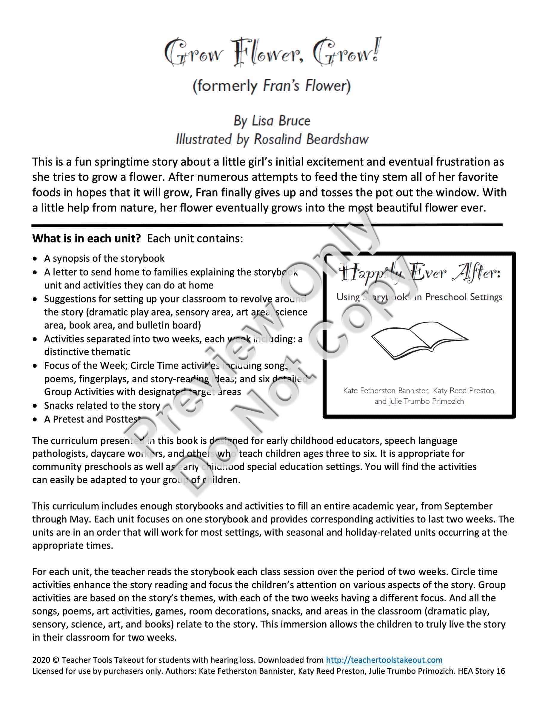 Grow Flower Grow - Early Childhood / Preschool teaching materials for the book includes a) a synopsis of the storybook b) a letter to send home to families explaining the storybook unit and activities they can do at home c) suggestions for setting up your classroom to revolve around the story (dramatic play area, sensory area, art area, science area, book area, and bulletin board) d) activities separated into two weeks, each week including: a distinctive thematic, e) focus of the Week; Circle Time activities including songs, poems, fingerplays, and story-reading ideas; and six detailed Group Activities with designated target areas, f) snacks related to the story, g) a Pretest and Posttest