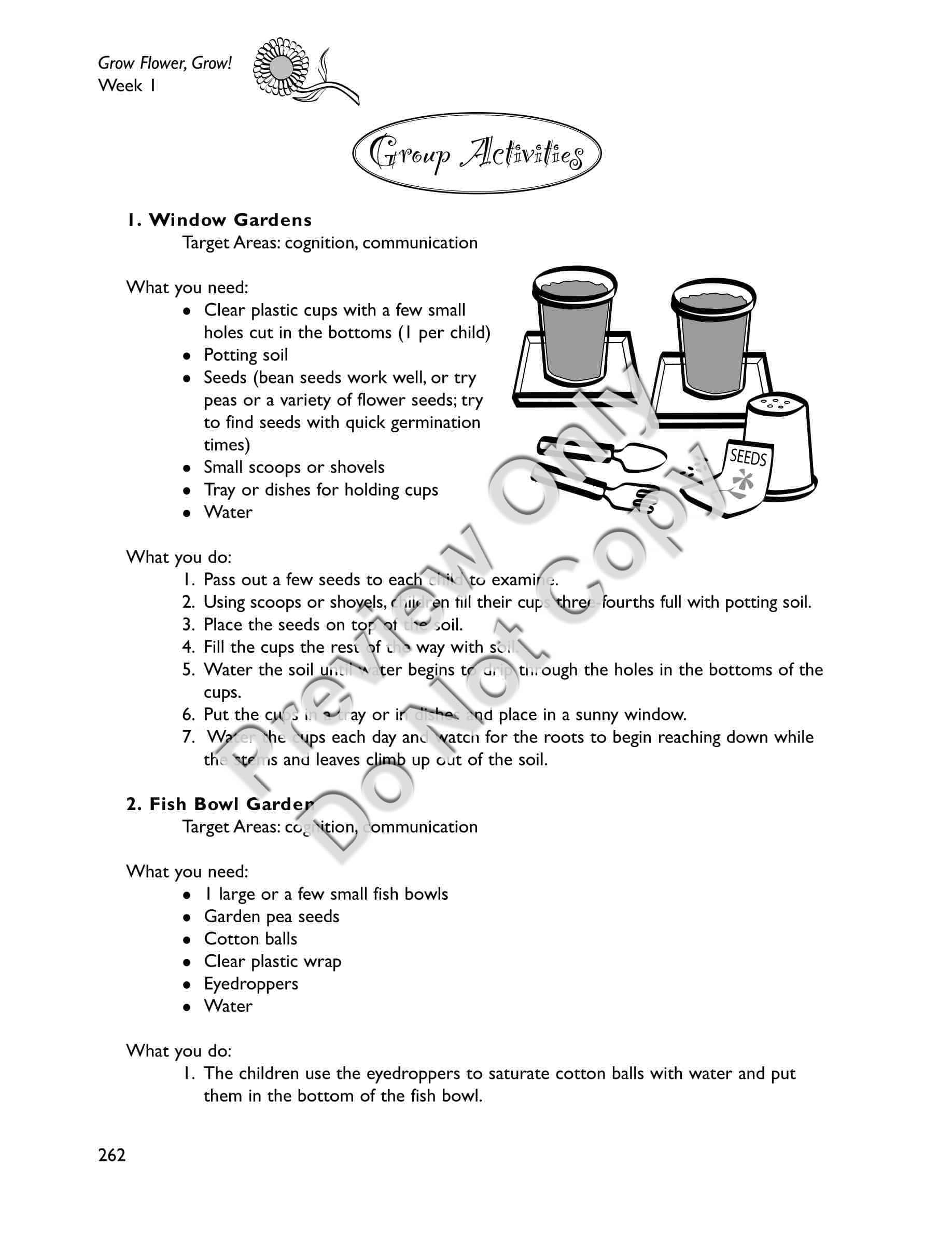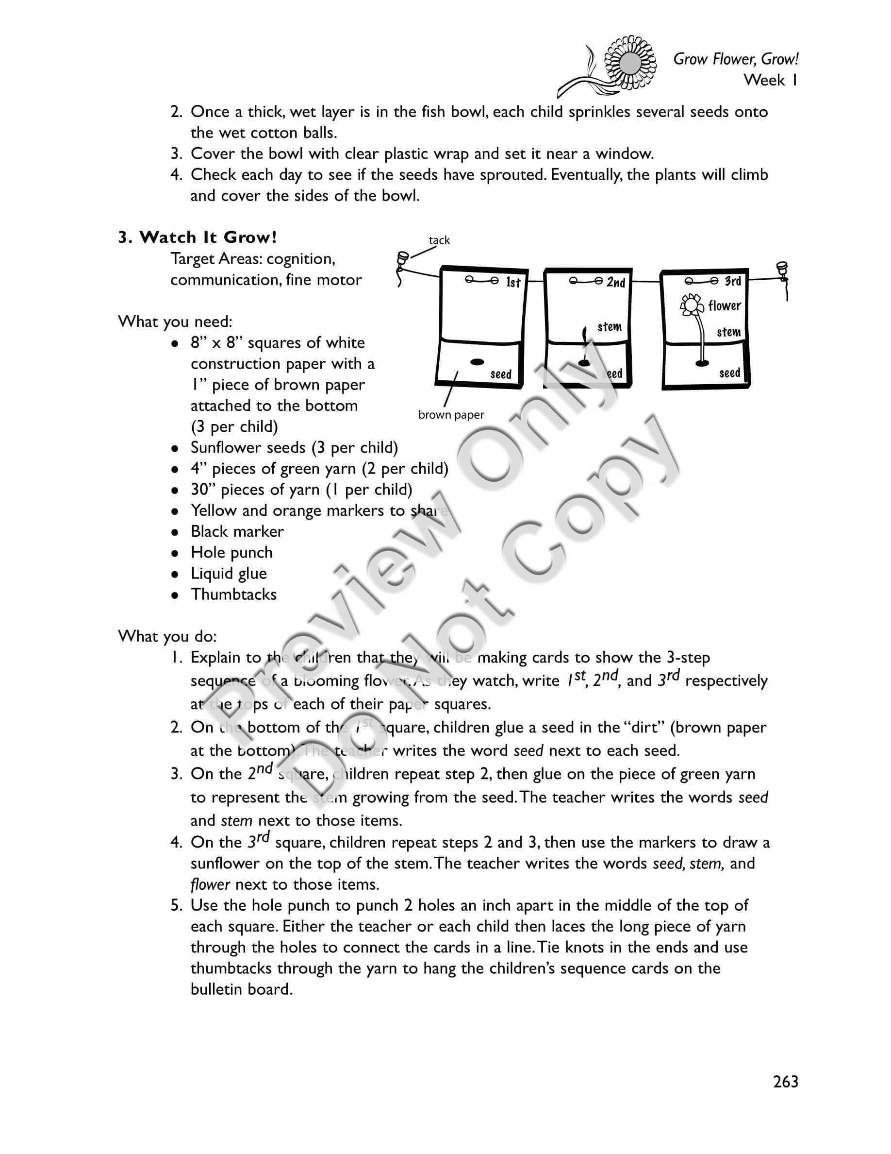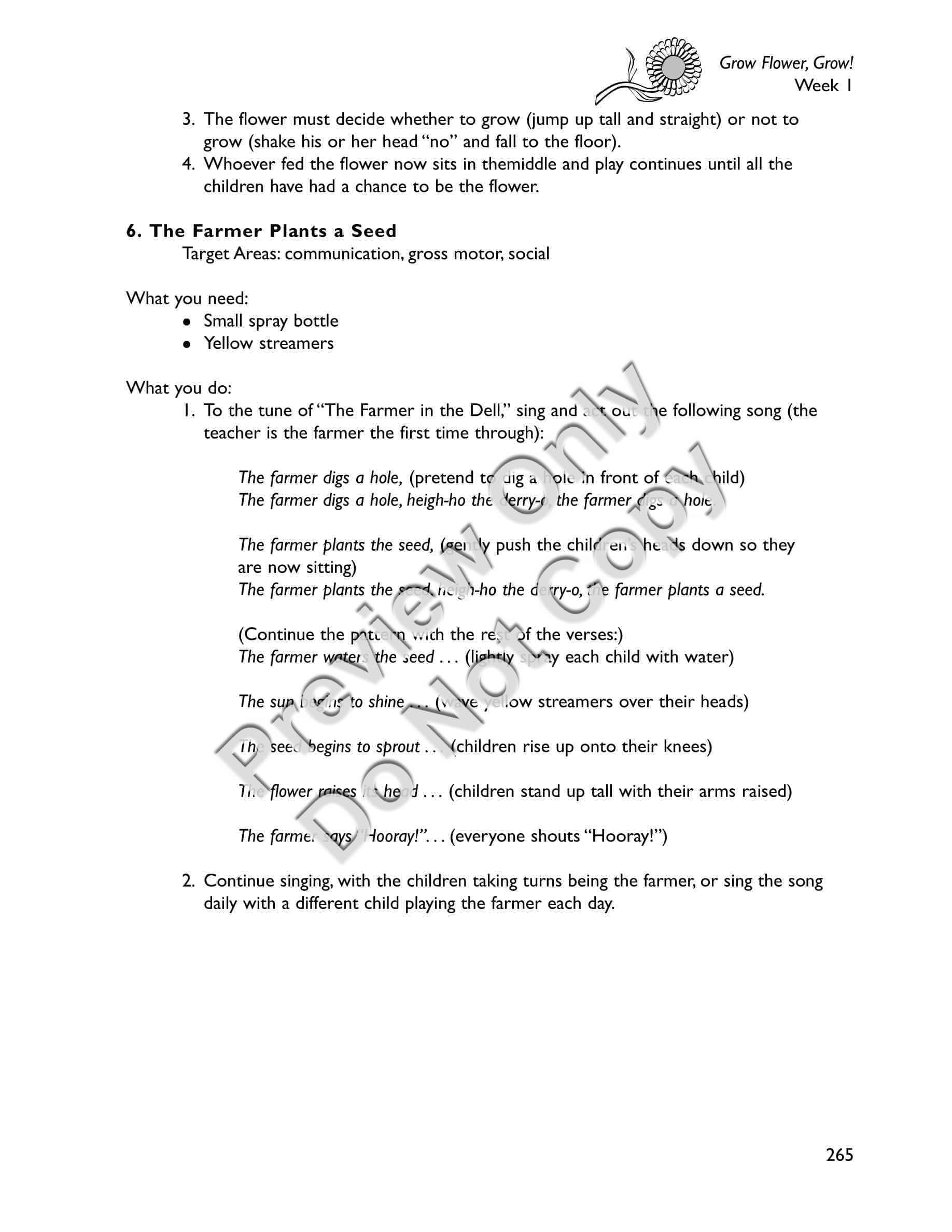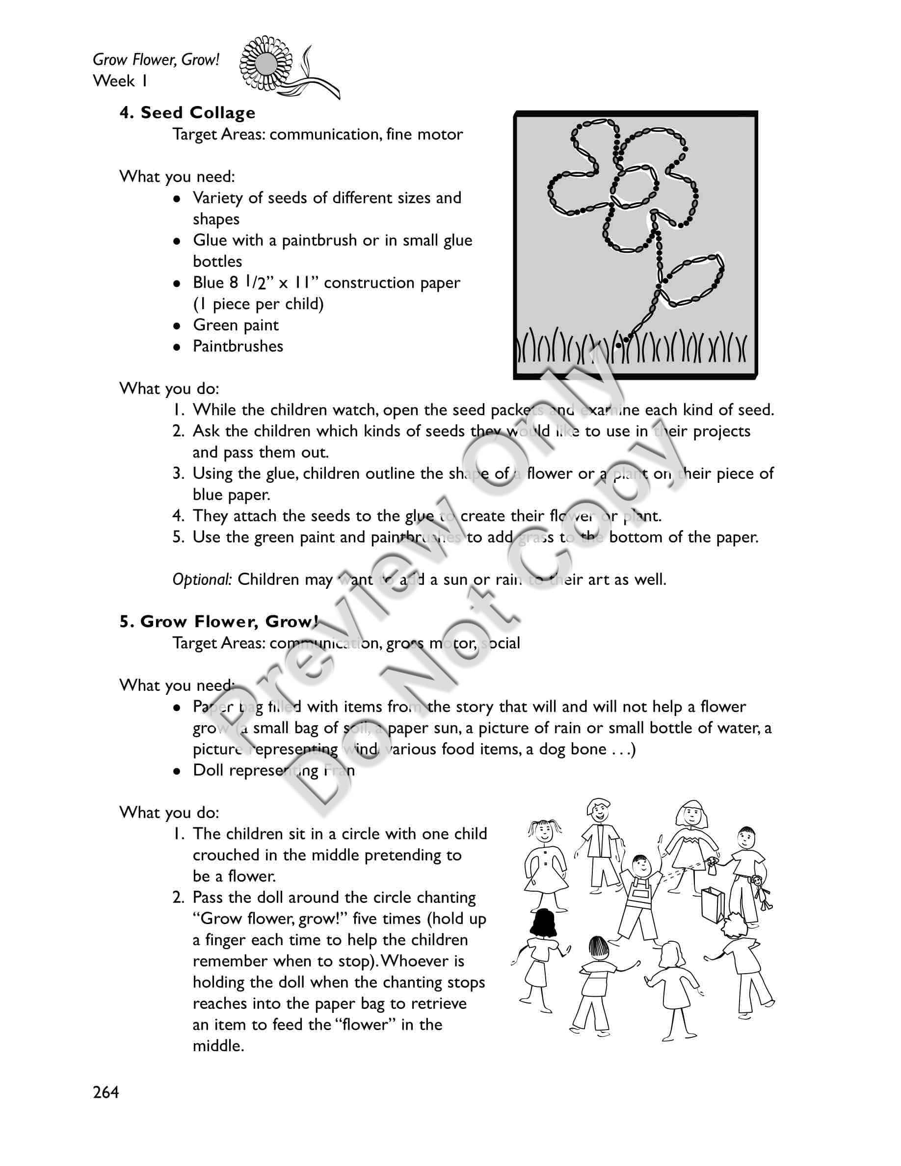 Grow Flower Grow - Early Childhood / Preschool teaching materials for the book includes a) a synopsis of the storybook b) a letter to send home to families explaining the storybook unit and activities they can do at home c) suggestions for setting up your classroom to revolve around the story (dramatic play area, sensory area, art area, science area, book area, and bulletin board) d) activities separated into two weeks, each week including: a distinctive thematic, e) focus of the Week; Circle Time activities including songs, poems, fingerplays, and story-reading ideas; and six detailed Group Activities with designated target areas, f) snacks related to the story, g) a Pretest and Posttest