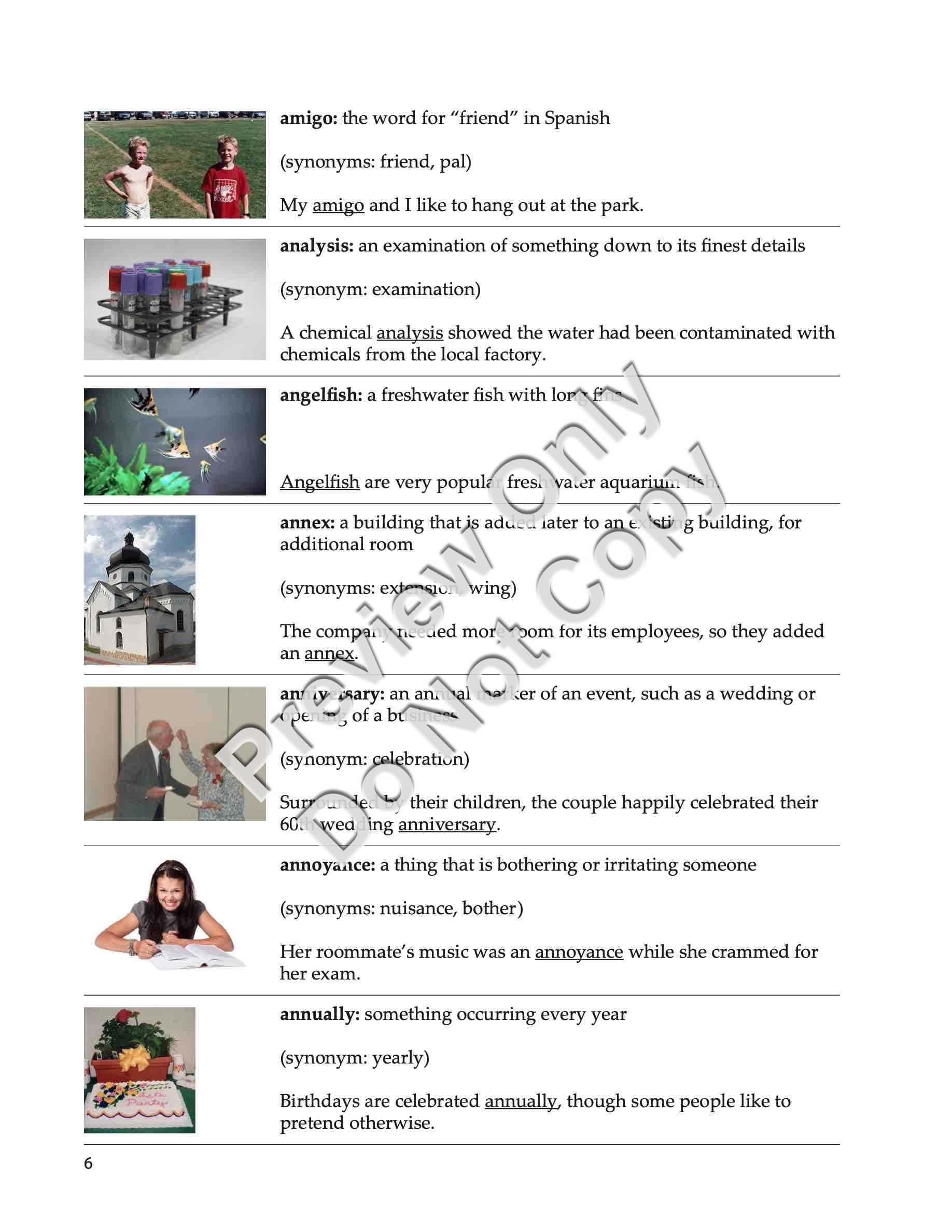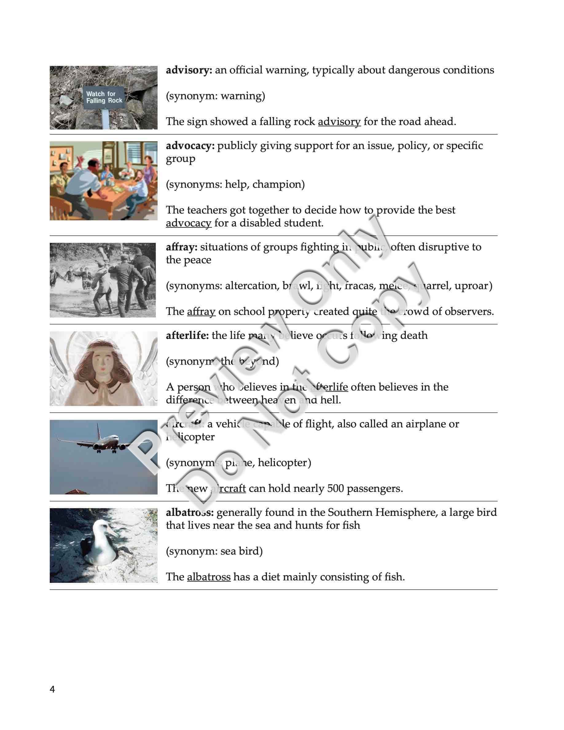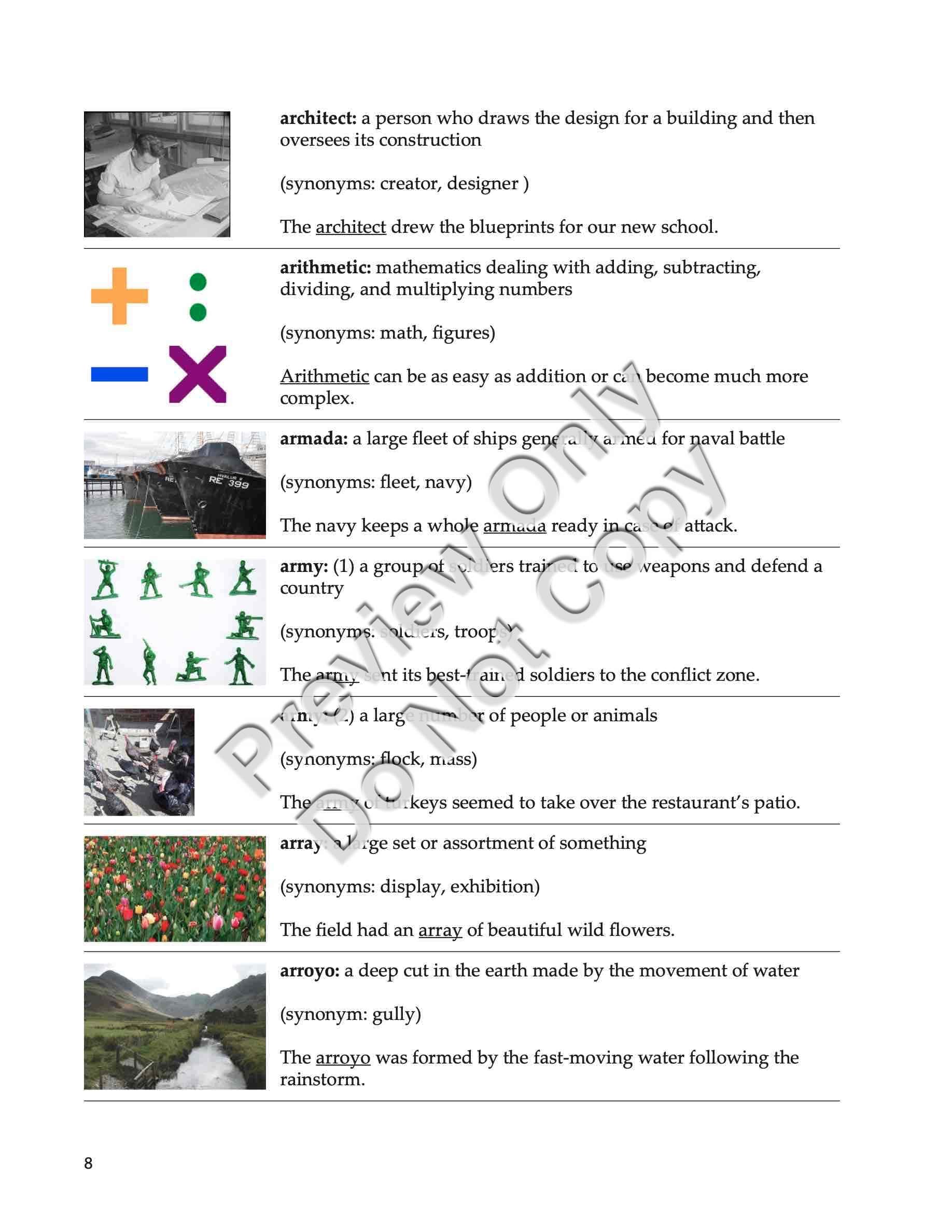 This full color picture glossary consists of targeted vocabulary with definitions, pictures, synonyms, antonyms, and an example sentence using the targeted word. Complements Nouns book.