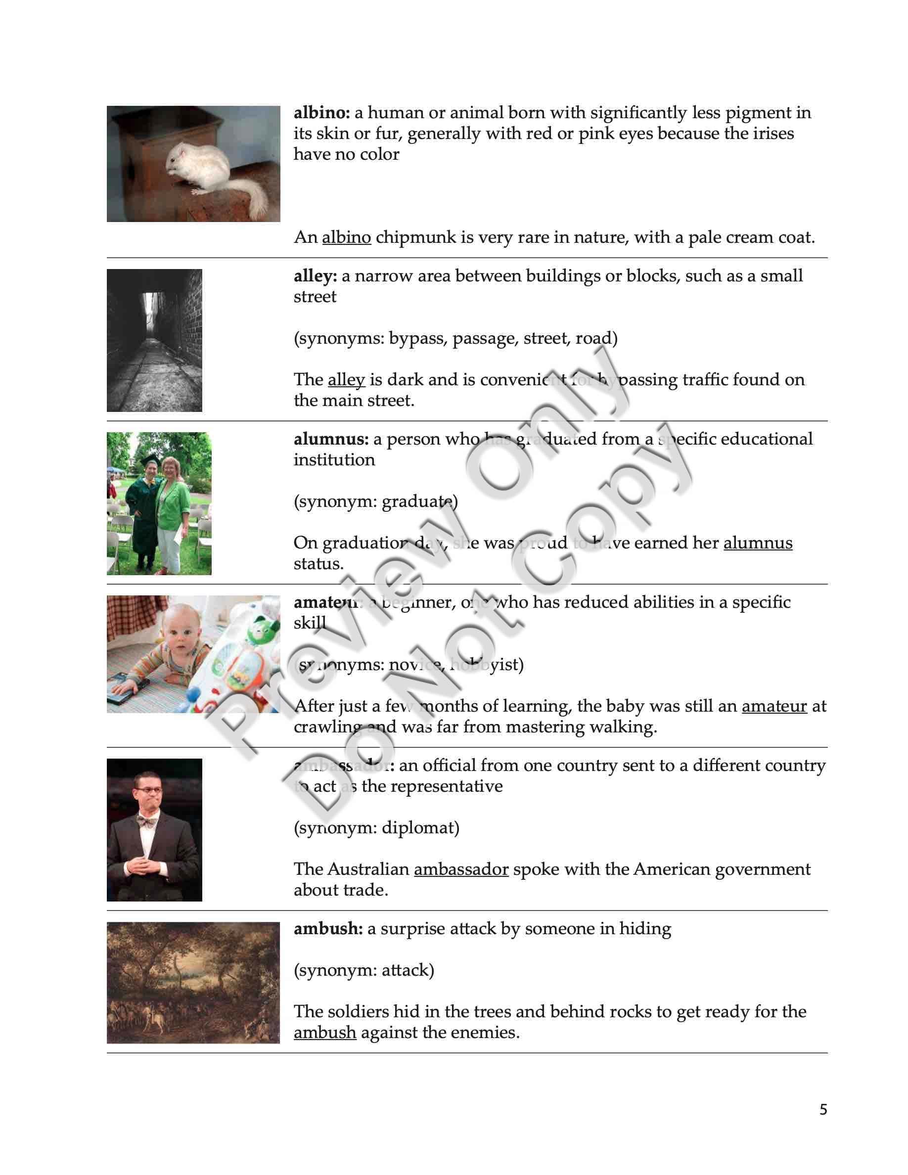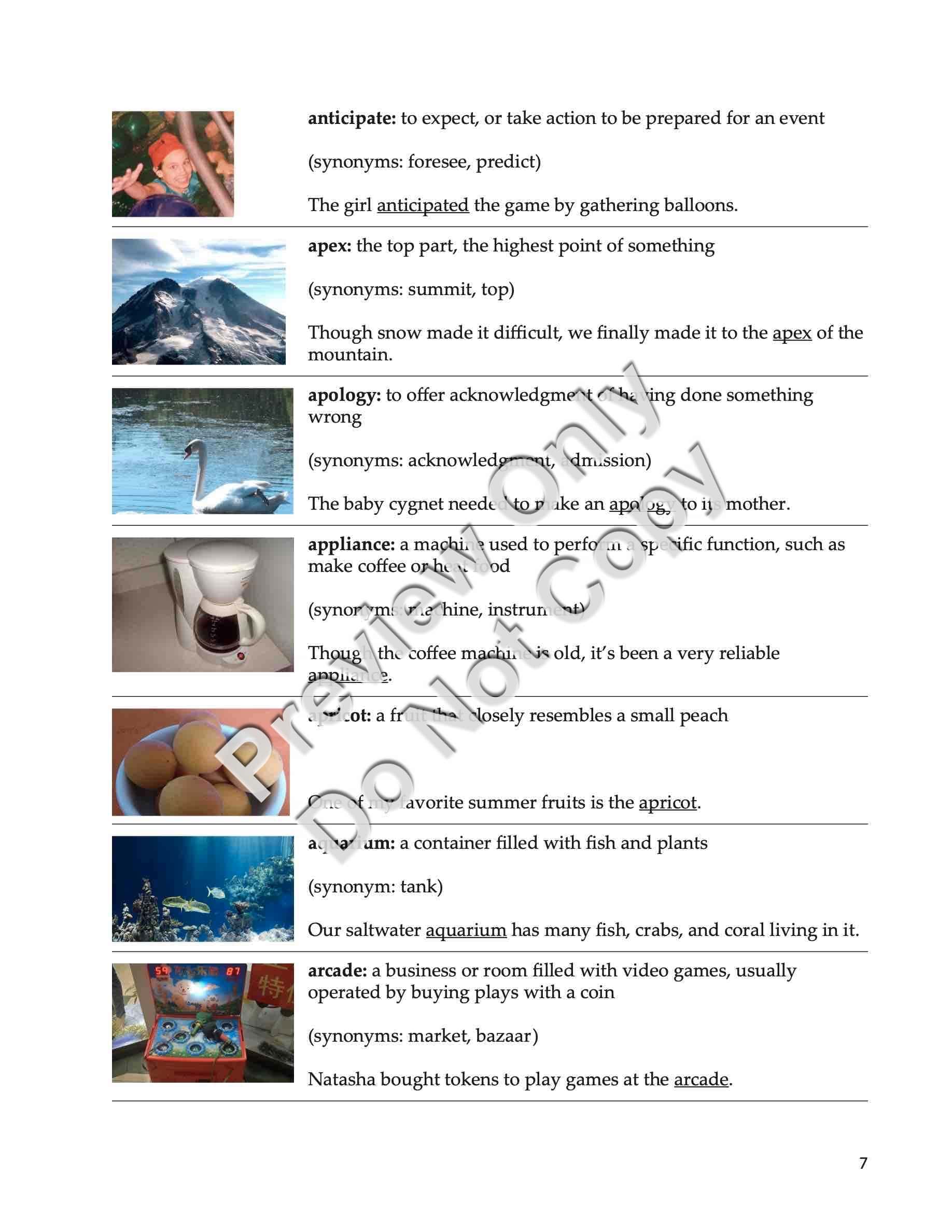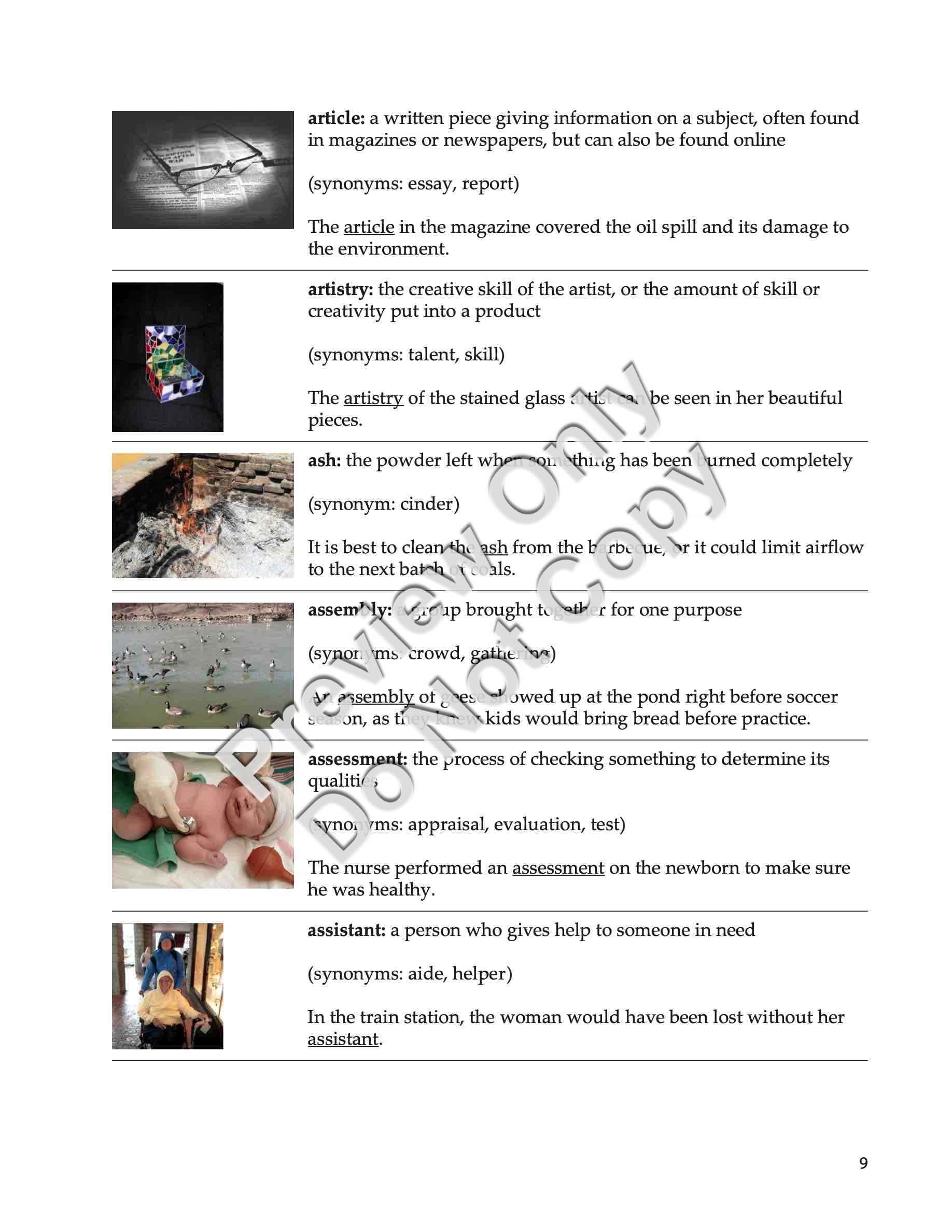 This full color picture glossary consists of targeted vocabulary with definitions, pictures, synonyms, antonyms, and an example sentence using the targeted word. Complements Nouns book.