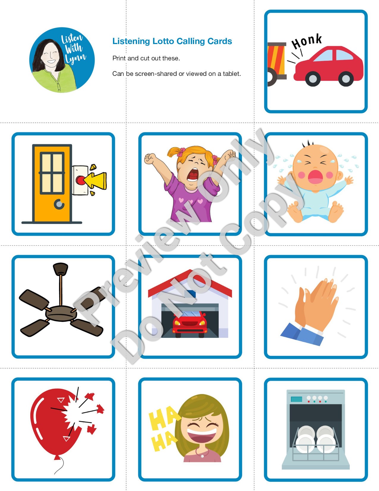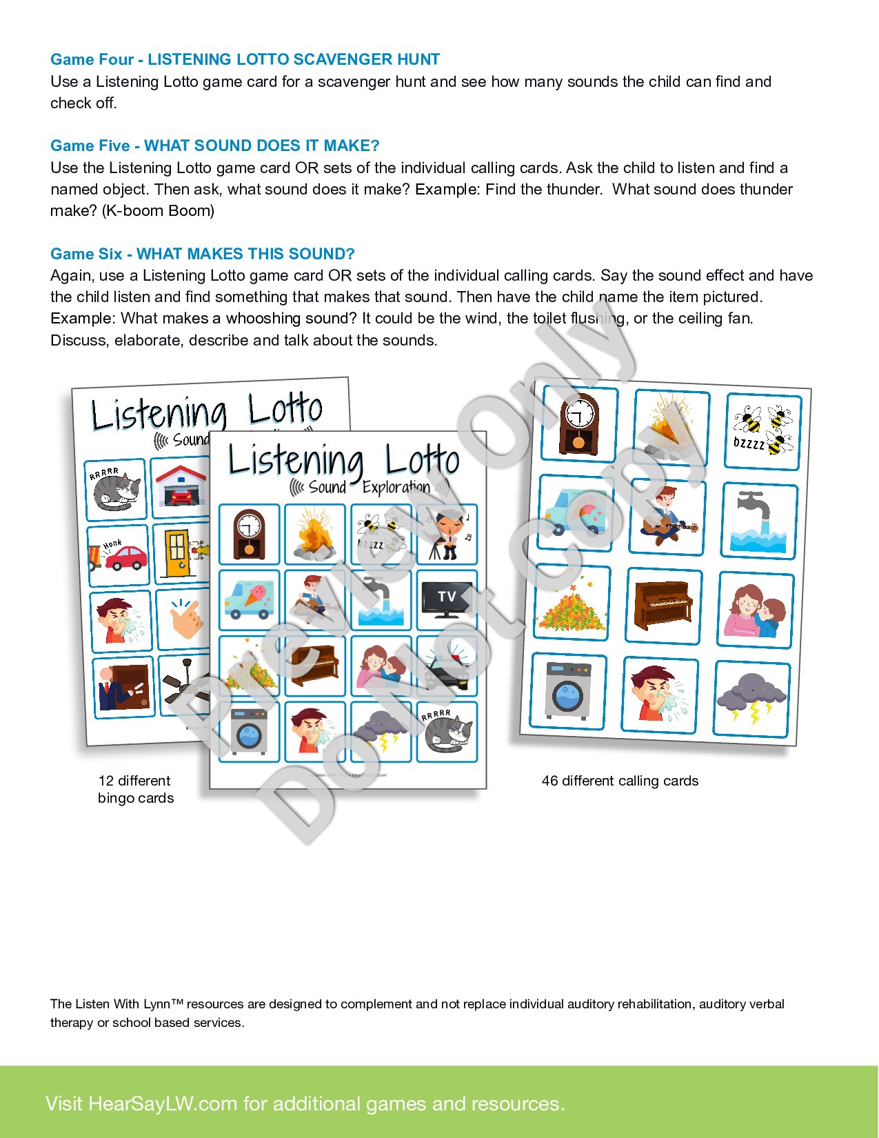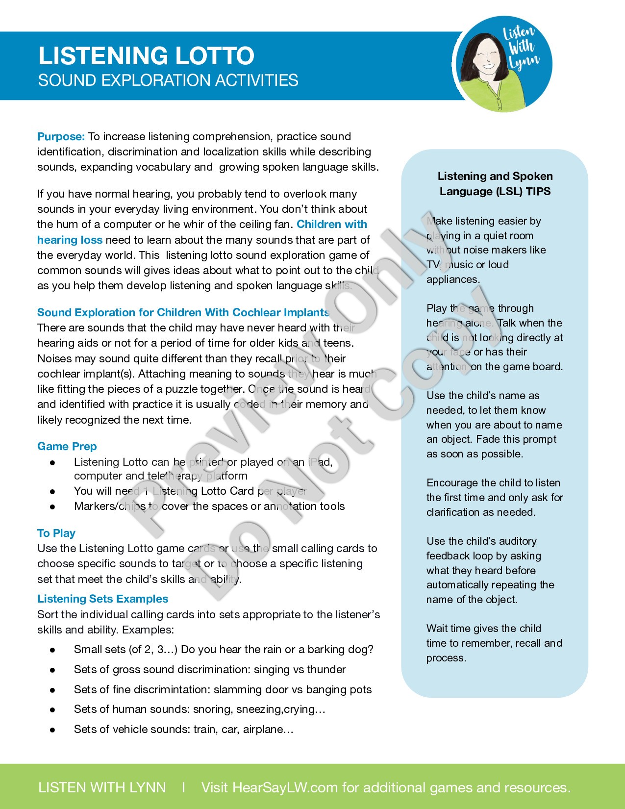 Playing Listening Lotto is an entertaining game that targets auditory skills for early and advanced listeners including sound identification, auditory discrimination, and localization skills. Targets vocabulary, descriptive language, spoken language, and conversation skills.