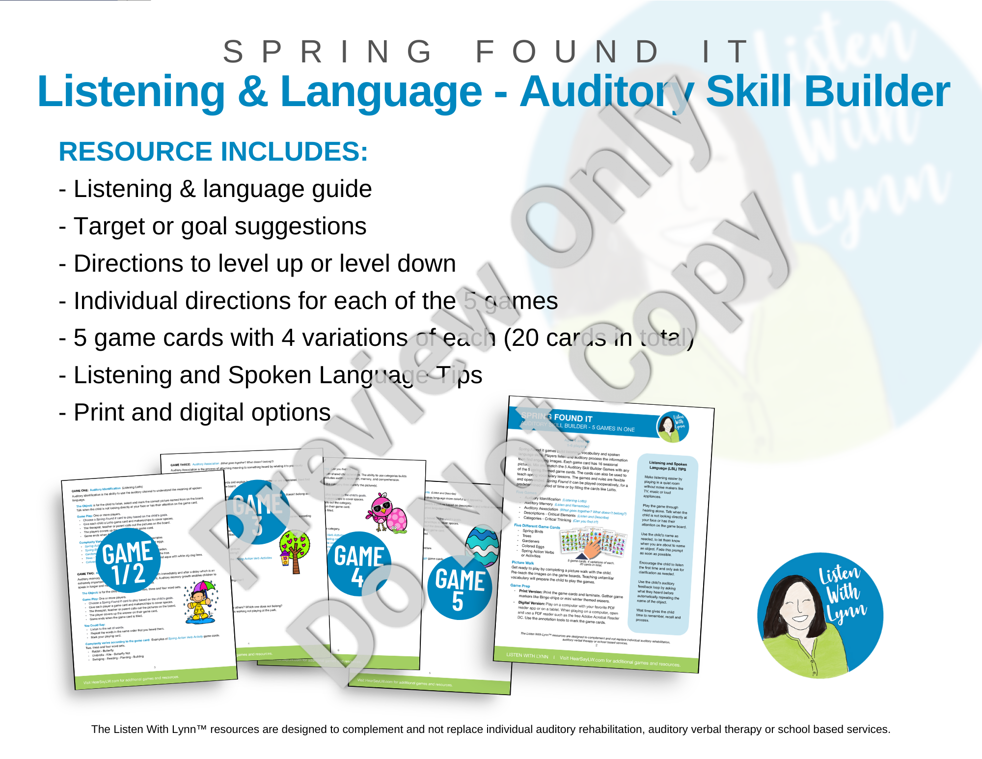 Shop NowSPRING Found It is a fun LISTENING & LANGUAGE AUDITORY SKILL BUILDER. Mix and Match the 5 auditory skill builder games with any of the 5 spring-themed game card sets. Players listen, auditory process information then find engaging seasonal images.