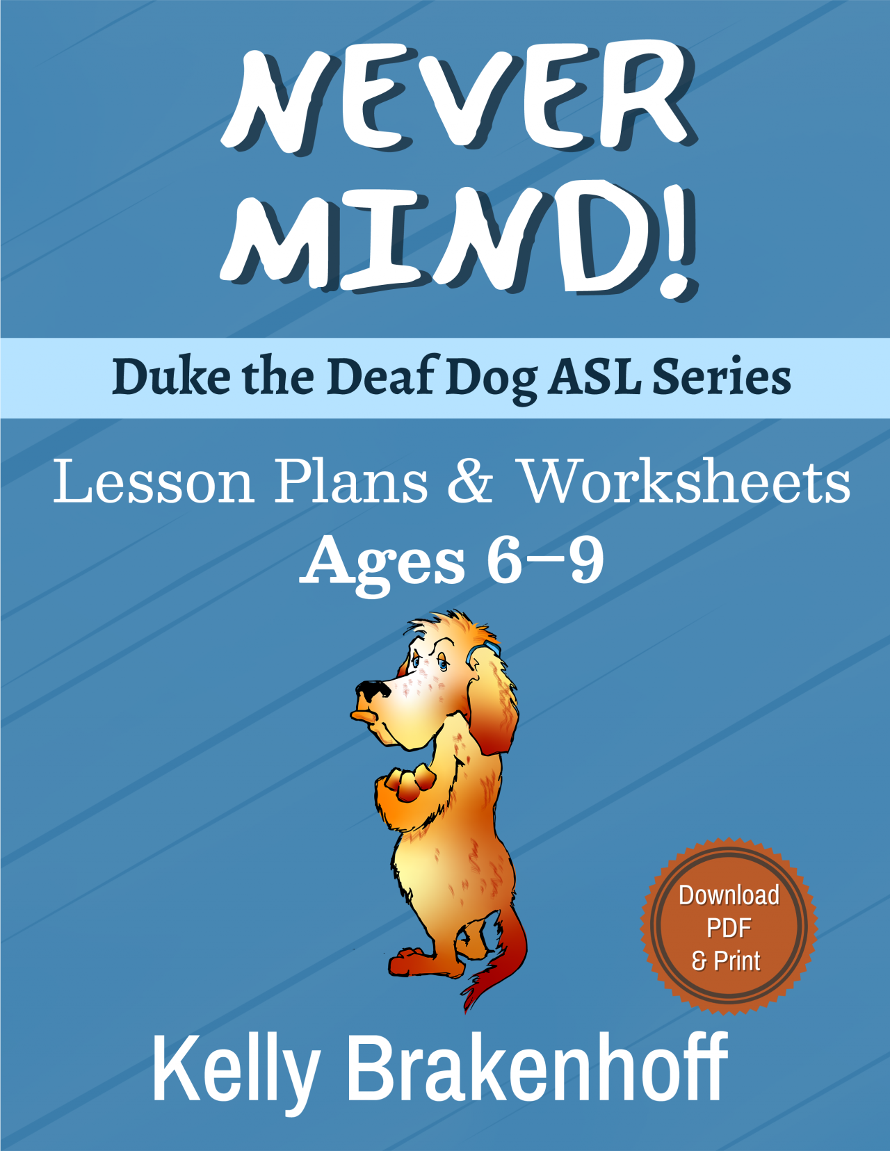 Eight printable worksheets are included as companions to the picture book:Â Never Mind (Duke the Deaf Dog ASL Series #1), by Kelly Brakenhoff: two different cover art options, four worksheets, and two coloring pages. Video tutorial links included for practicing the ASL vocabulary and an ASL version of the complete story performed by a deaf college instructor.