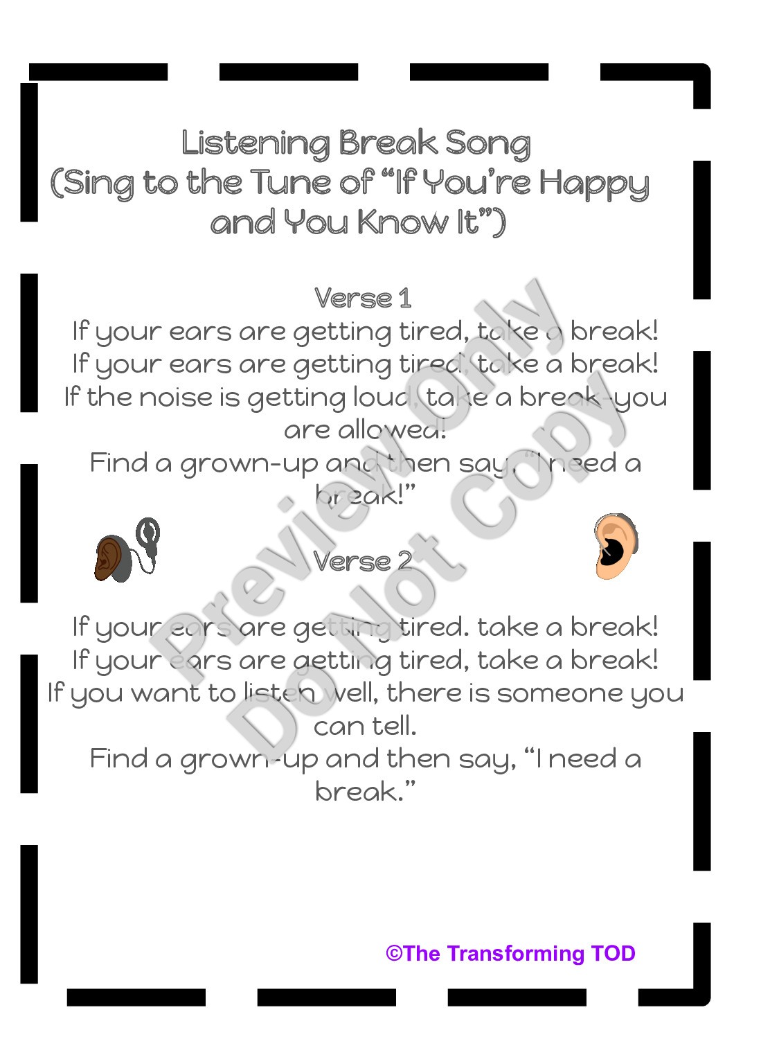 I created this product to help to teach my young learners who are deaf/hard-of-hearing about listening breaks. Since the students are working so hard to learn and take in information all day long (both visually and by listening), it is crucial that they learn to take a break when it is necessary. This song teaches them how to recognize when they need a break, who can help them, and how to ask for a break.